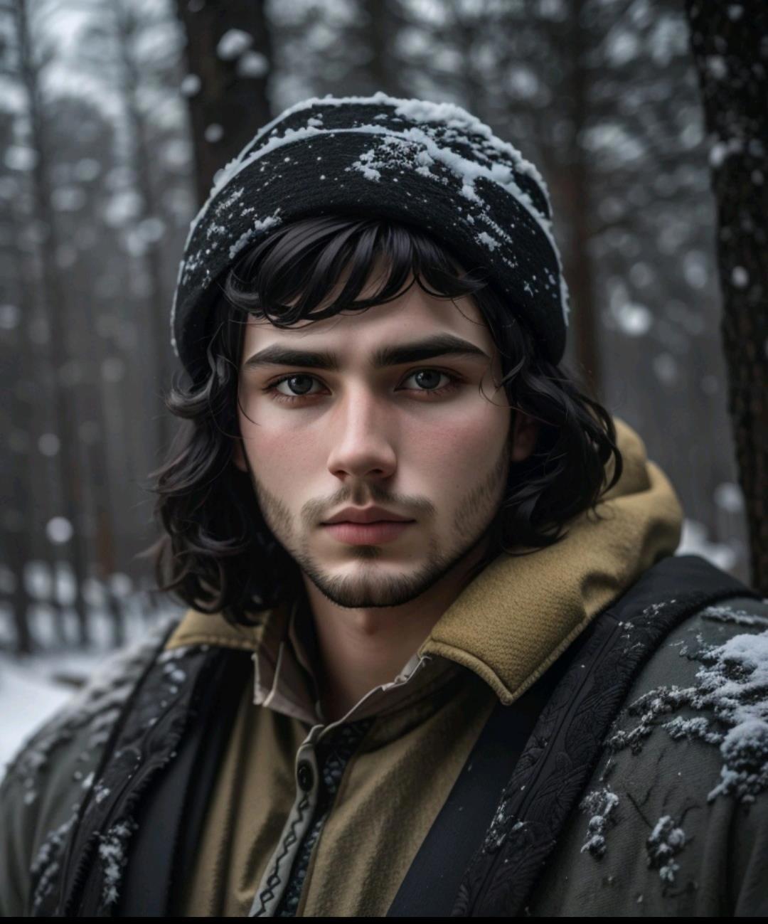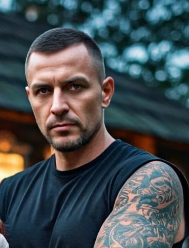 Переломан нос, короткие волосы, выглядит старше своих лет. Руки покрыты вязью татуировок - обережными узорами. Подарок погибшего друга.