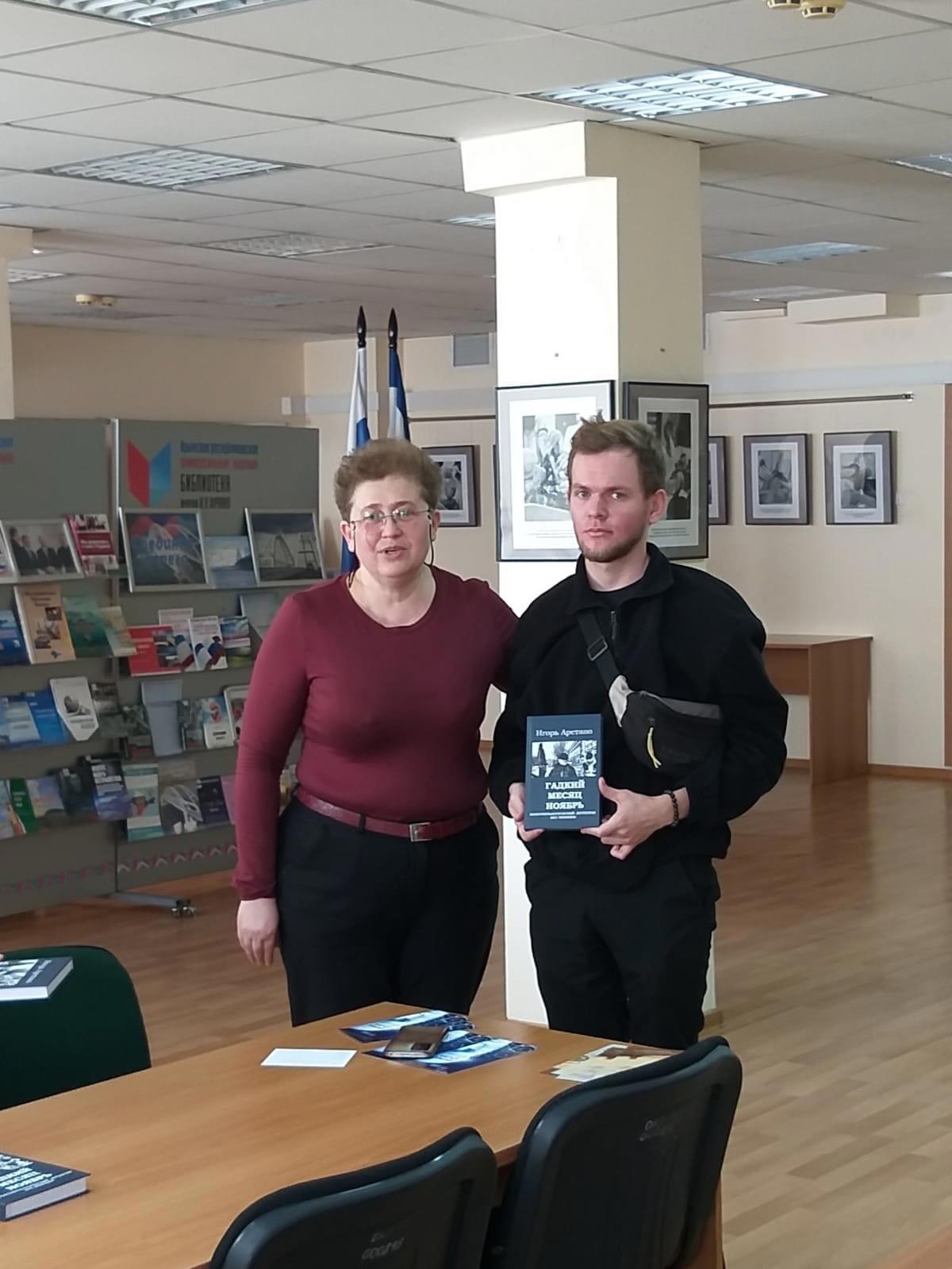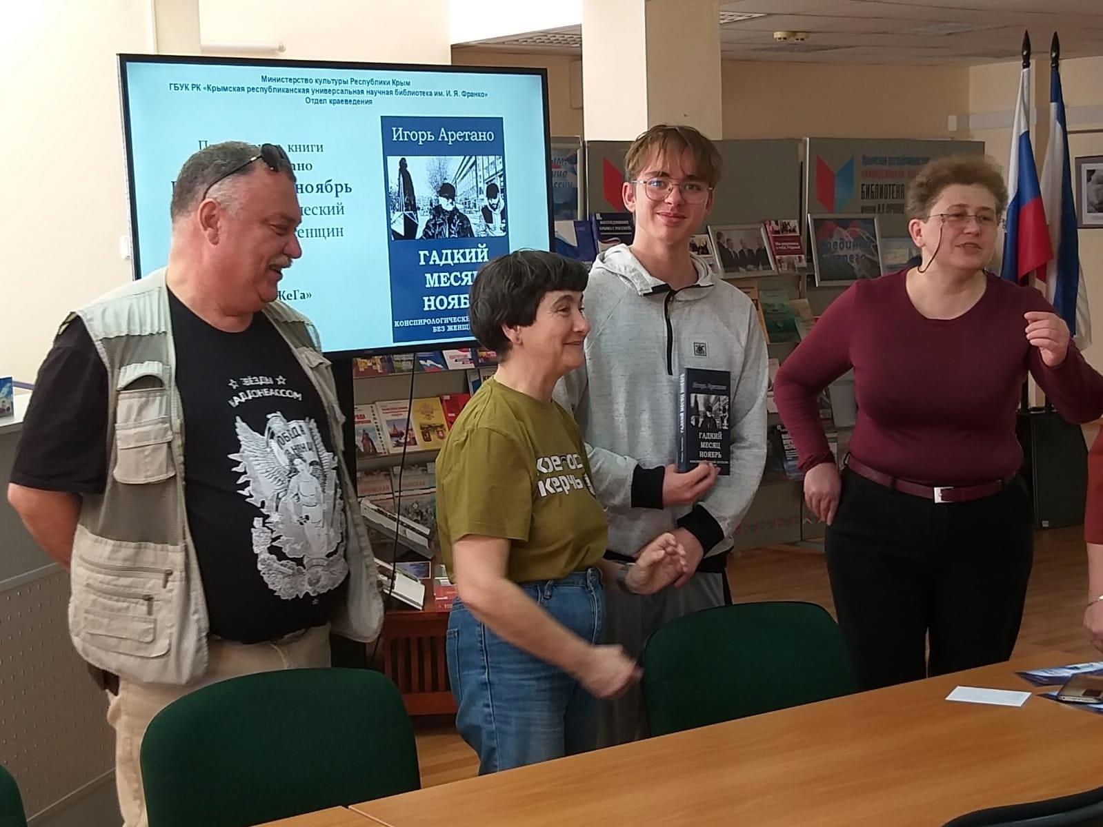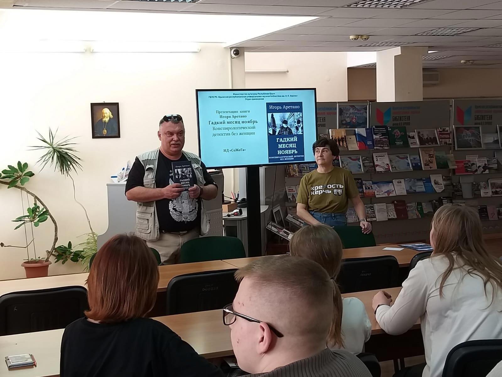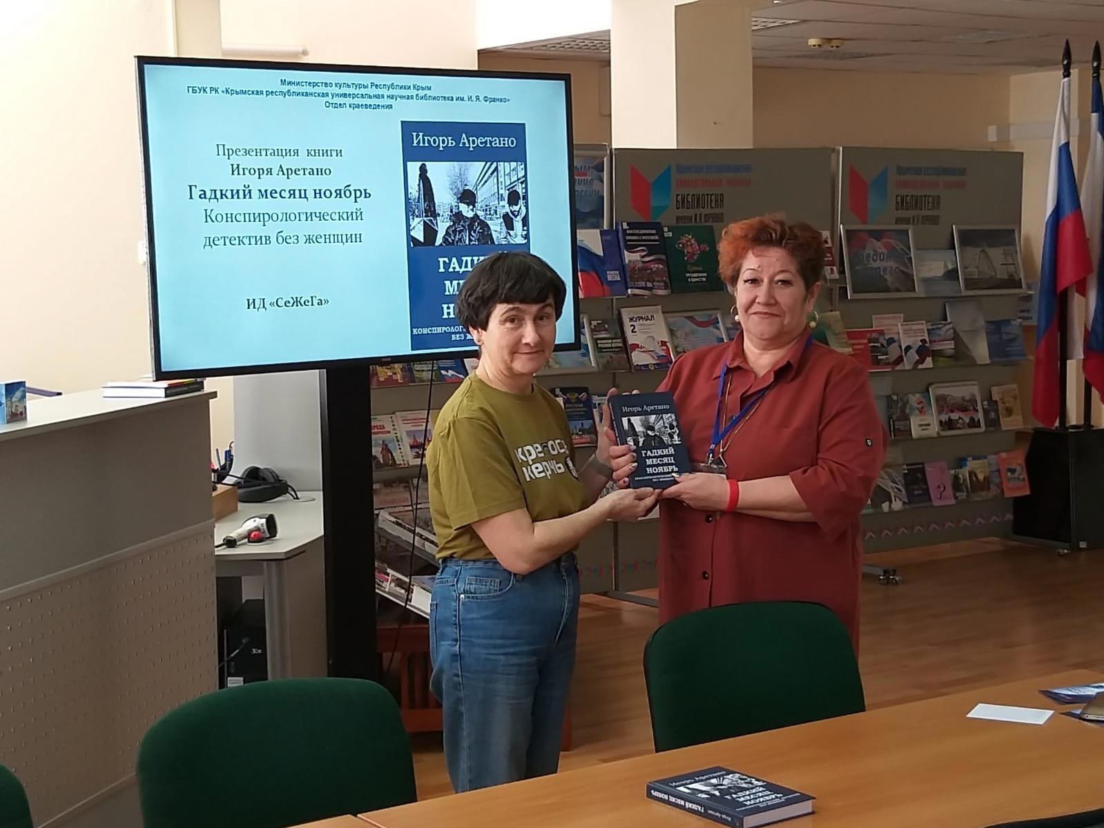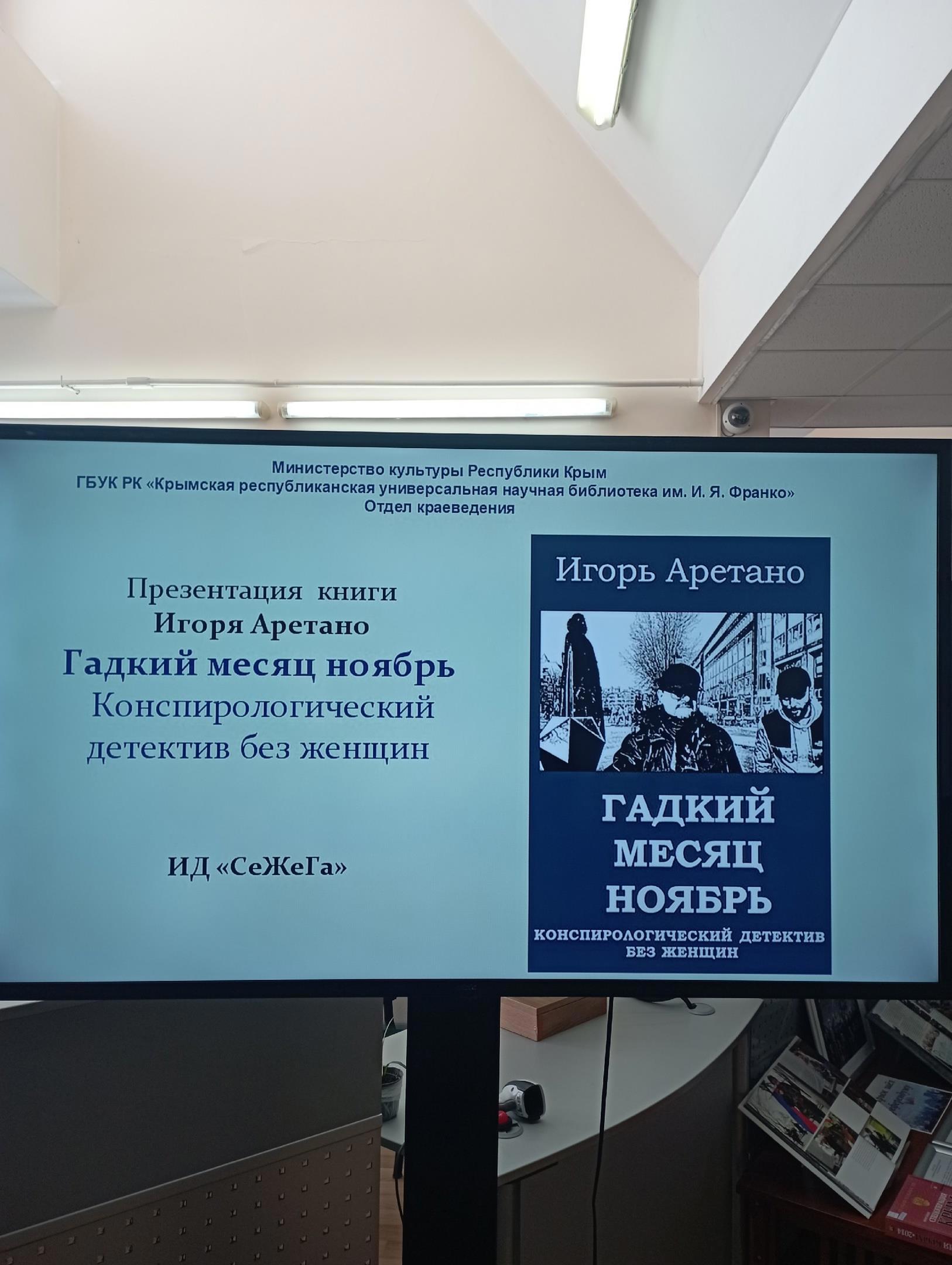 2. В центральной библиотеке им И. Франко г. Симферополя прошла презентация книги Игоря Аретано https://author.today/u/igorj_aretano "Гадкий месяц ноябрь. Конспирологический детектив без женщин"