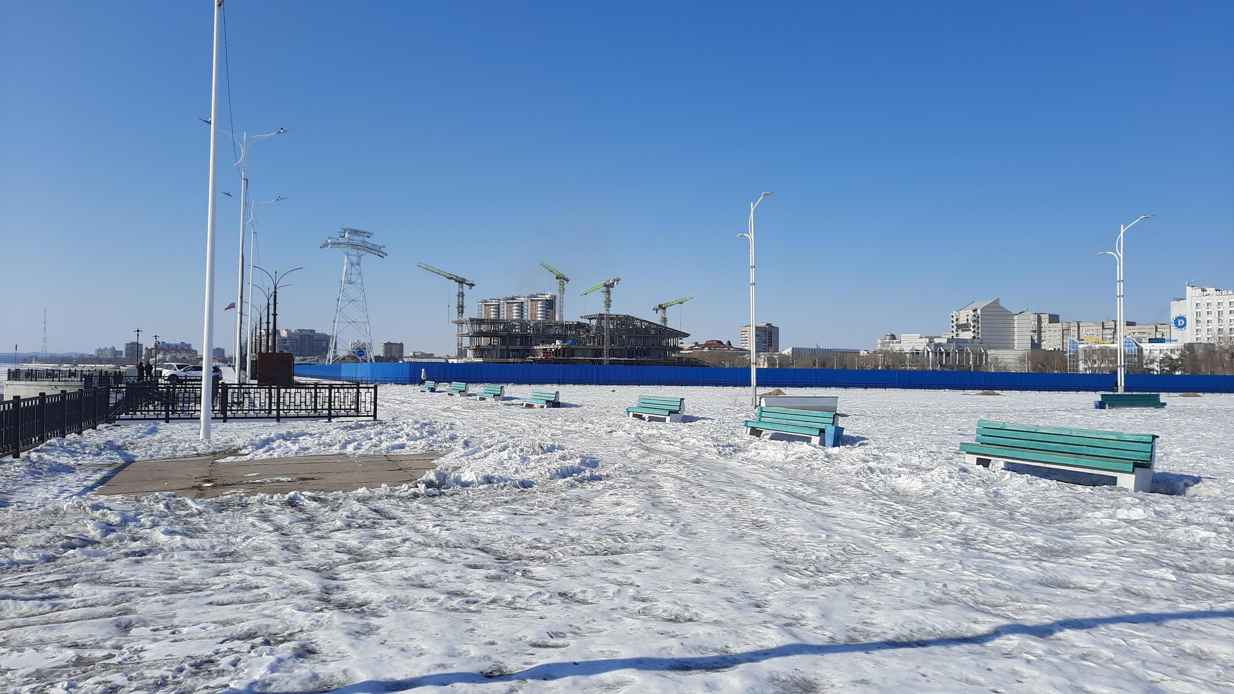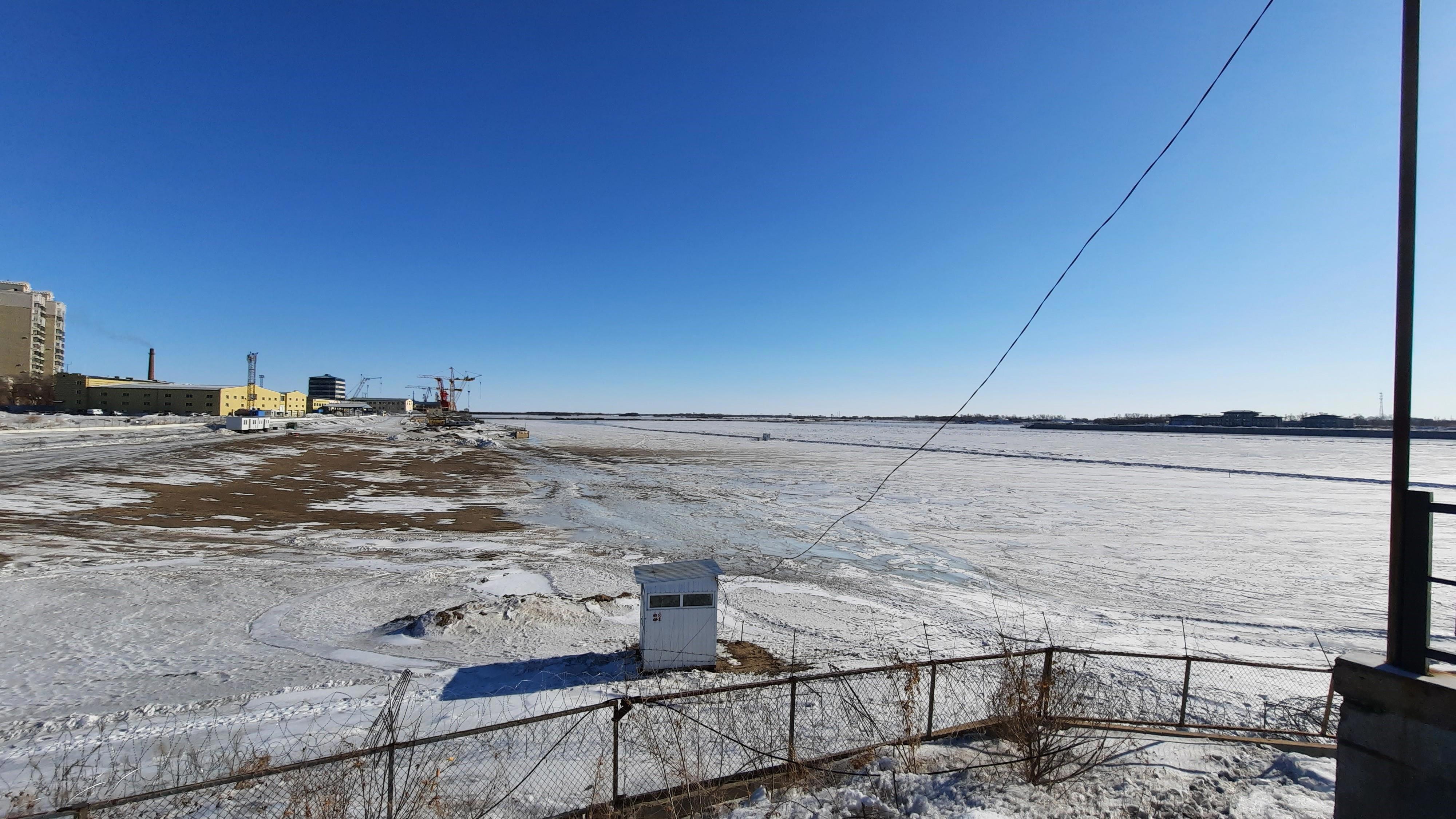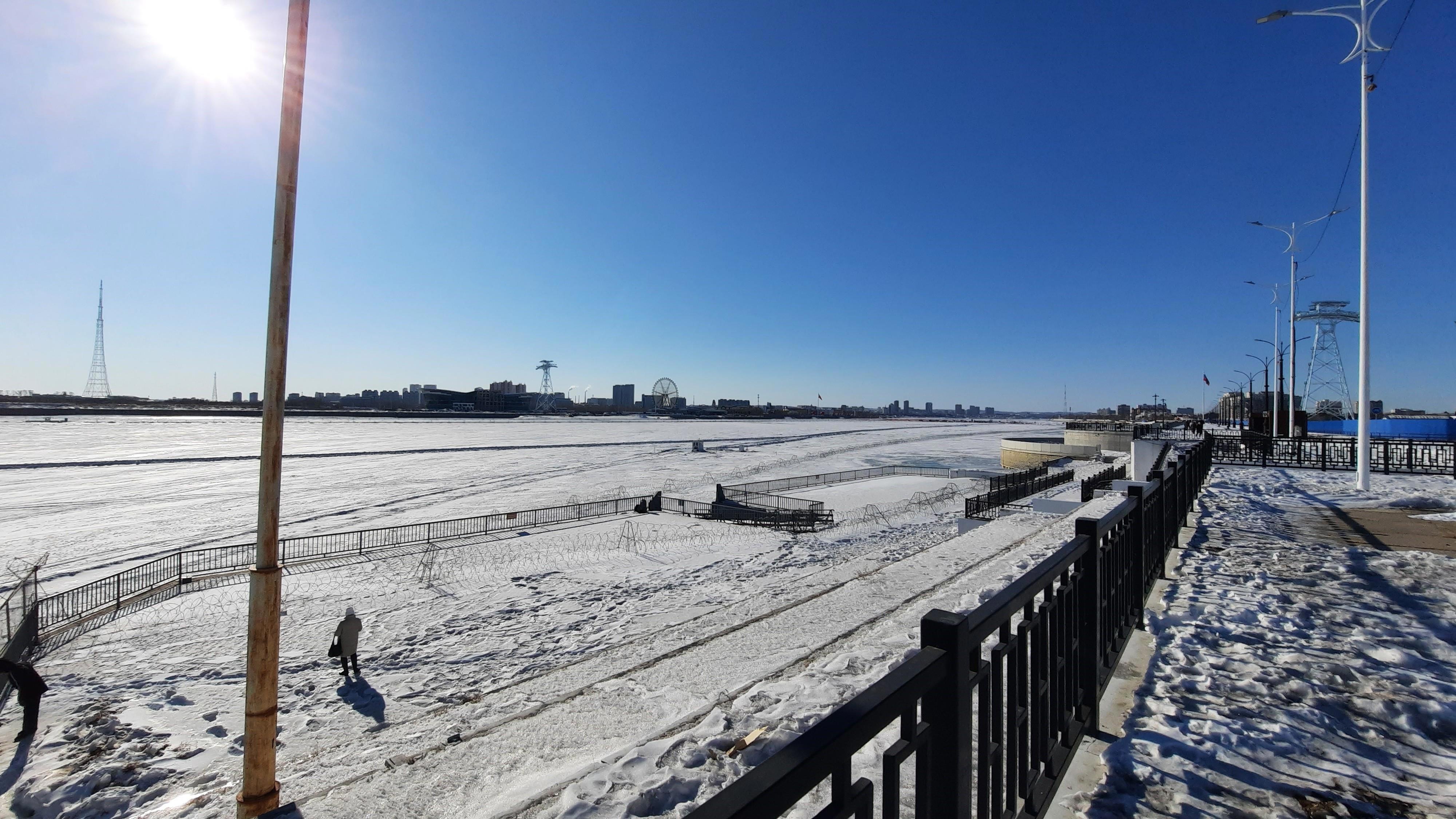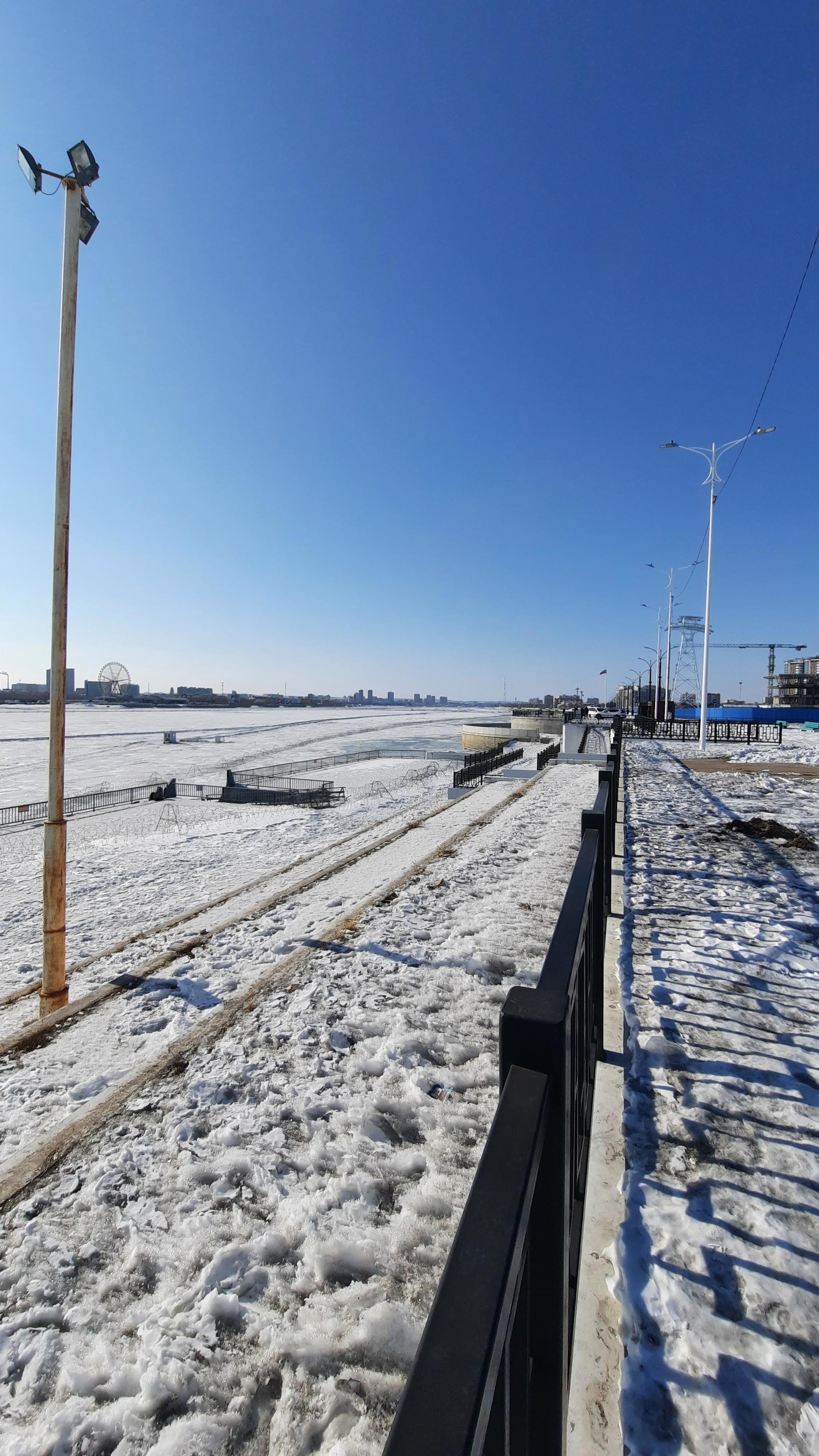 23.02.2025 Потеплело, и я снова начал ходить "с начала" - "от Таможни" (от ул. Театральной, если точно). Явственно видно, что снег испарился как с берега, так и со льда. Небо Родины - яркое!