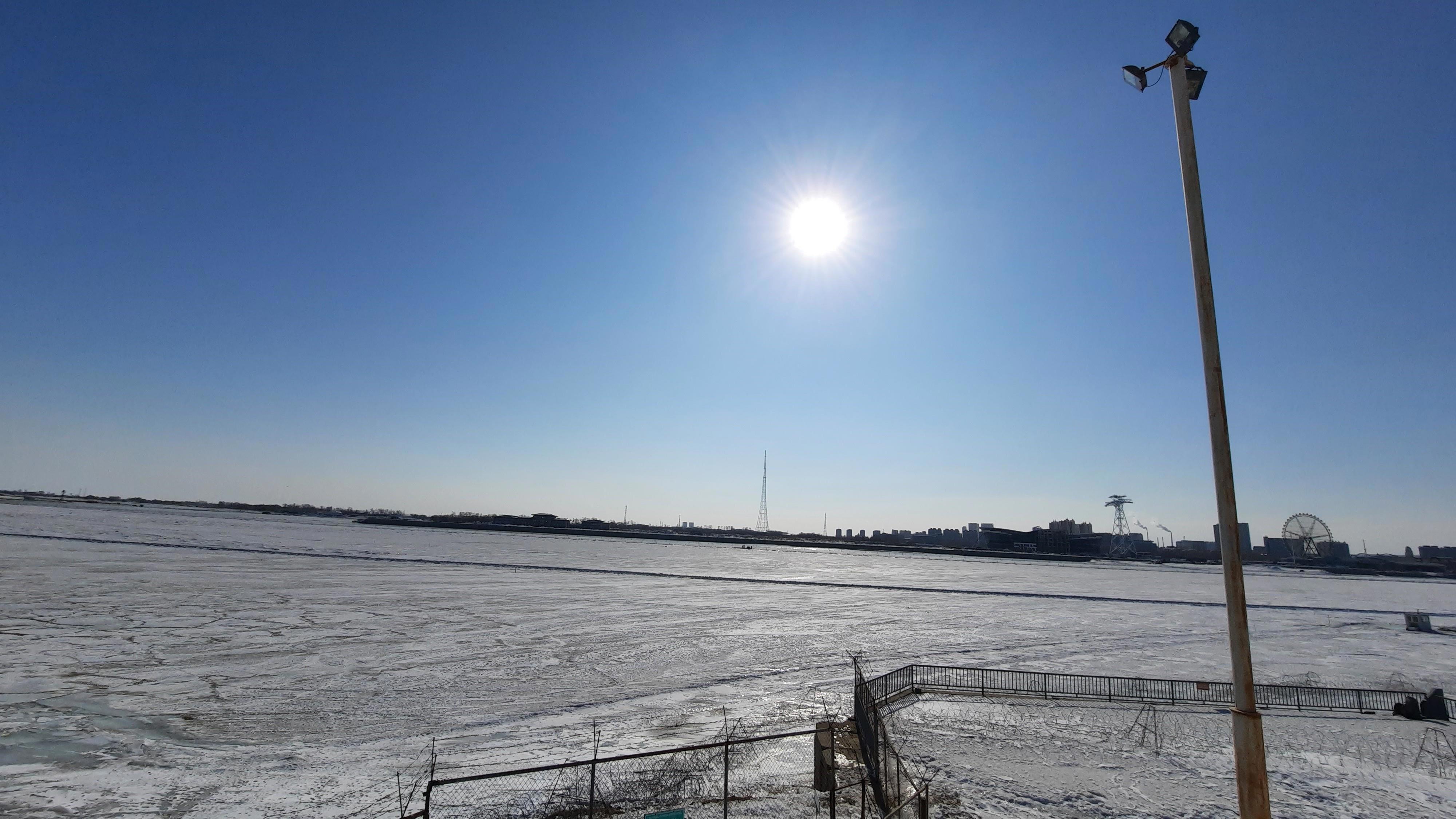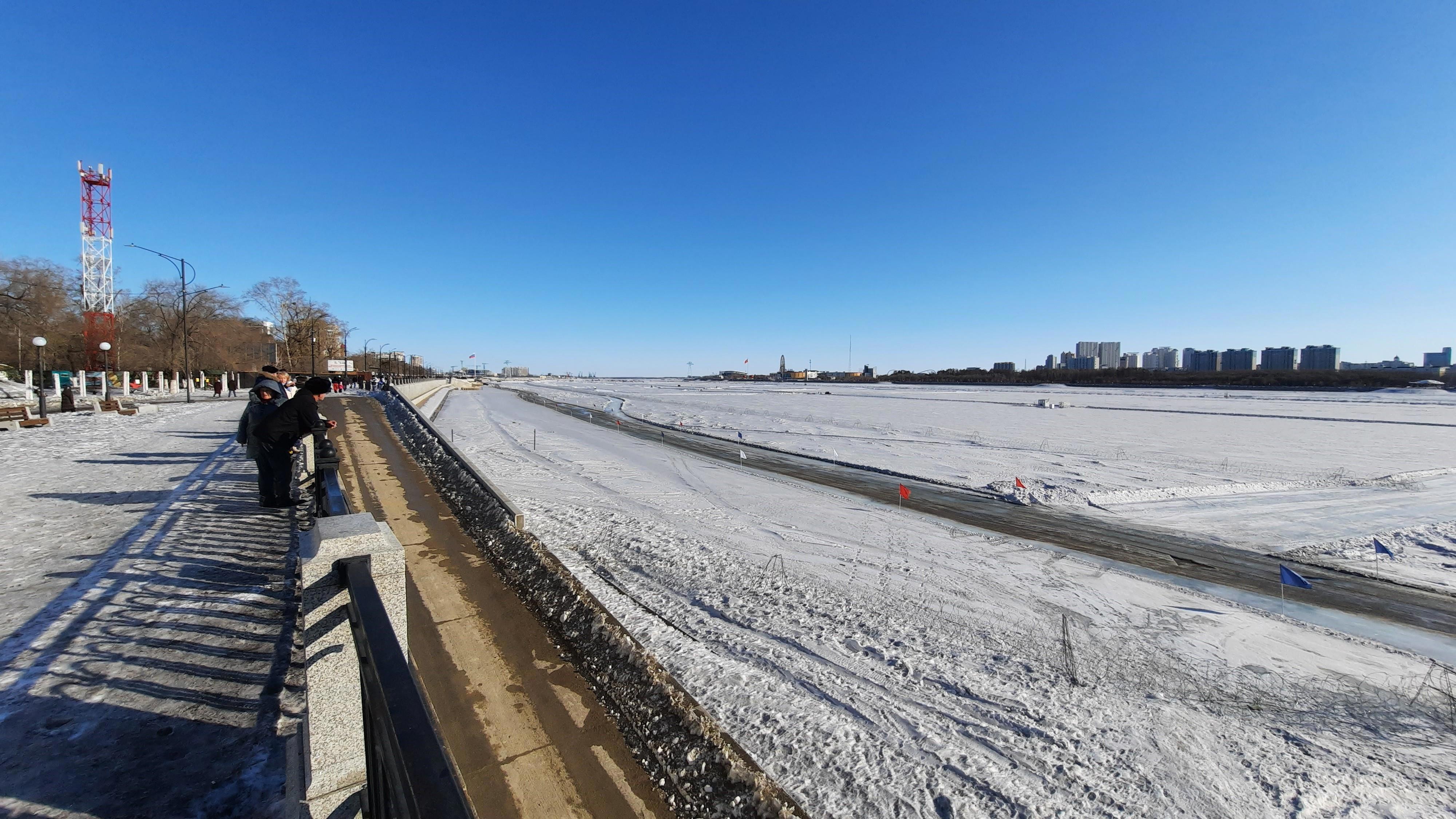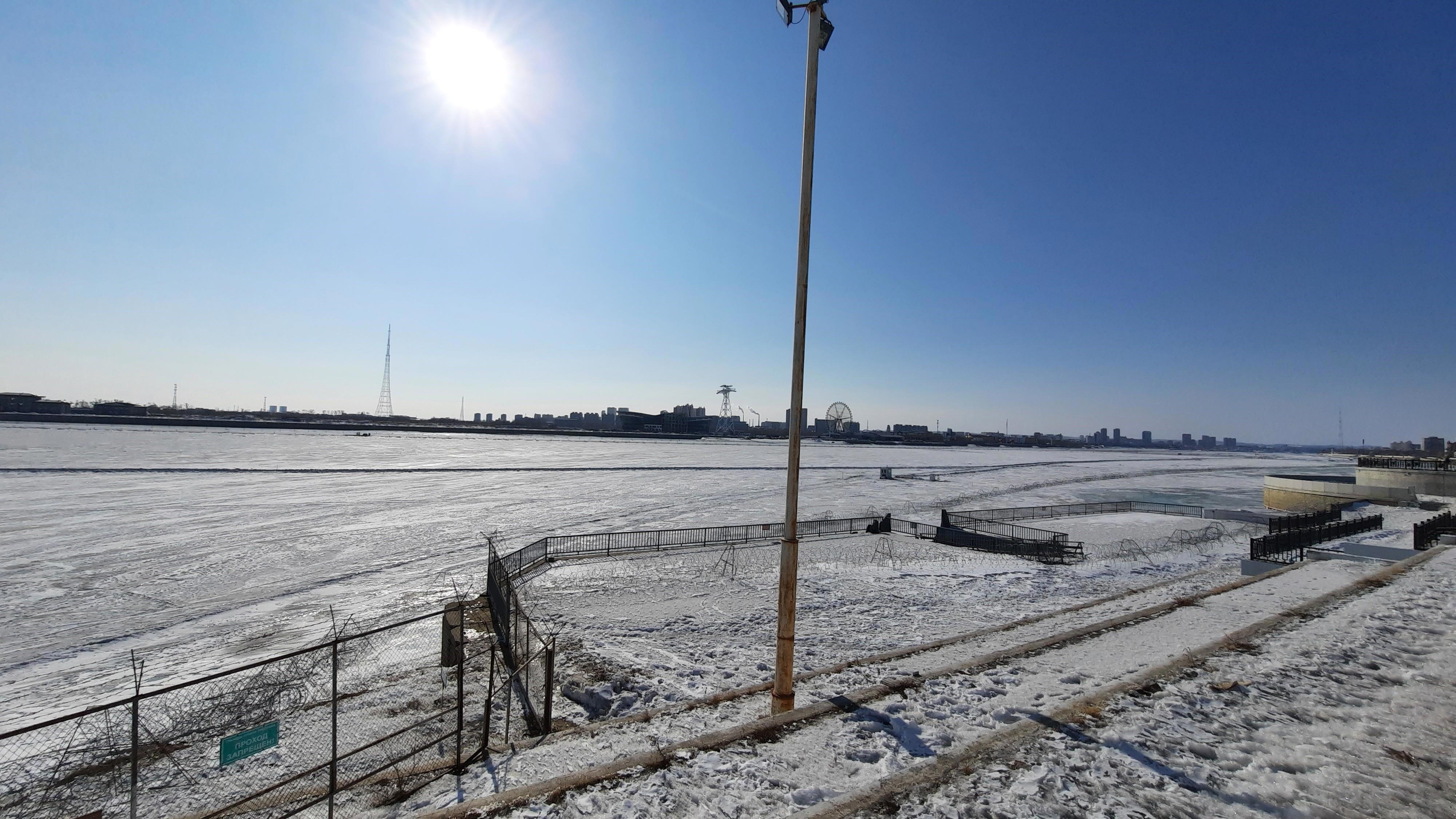 23.02.2025 Потеплело, и я снова начал ходить "с начала" - "от Таможни" (от ул. Театральной, если точно). Явственно видно, что снег испарился как с берега, так и со льда. Небо Родины - яркое!