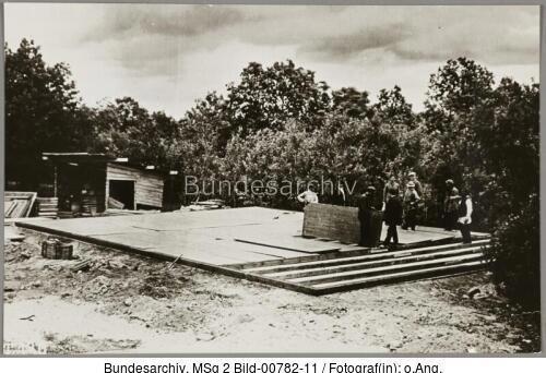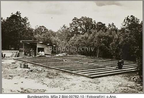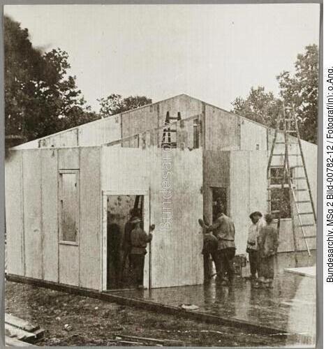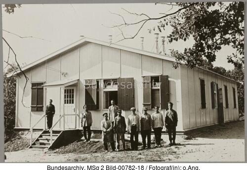 Строительство бараков. Время до прибытия второго барачного состава из Германии было заполнено планировкой "поселка Томка". Строительная площадка на опушке леса была обследована теодолитом, затем повалены деревья и залито цементное основание в точном соответствии с размерами. Погода - май 1928 года - благоприятствовала просушке фундаментов, строительство могло начаться.