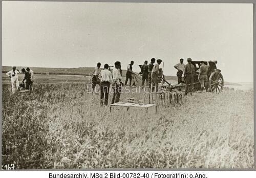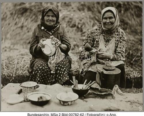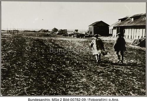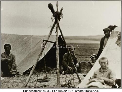 Поля, которые колхозник должен был возделывать и с которых он должен был собирать урожай, находились за много миль от его деревни. Путешествие на конной повозке с женой и ребенком нередко занимало целый день. Затем разбивали лагерь на месте работы, накрывая палатку тканью или травой. Женщины готовили скудную еду на открытом огне, стол и стулья были лишними. Узкая канава для ног заменяла и то и другое. Прохладный напиток в жаркий полдень заменил сочный арбуз (большой арбуз), который прекрасно растет даже на полностью высохшей, потрескавшейся почве. После захода солнца крестьяне, а также наши русские рабочие собирались у костра перед своим лагерным бараком и пели старые и новые, невеселые и дикие песни. Никто из нас не забудет эти вечера.