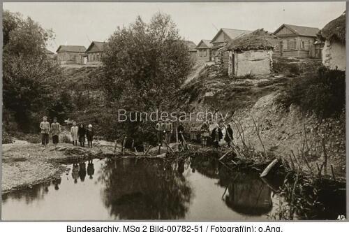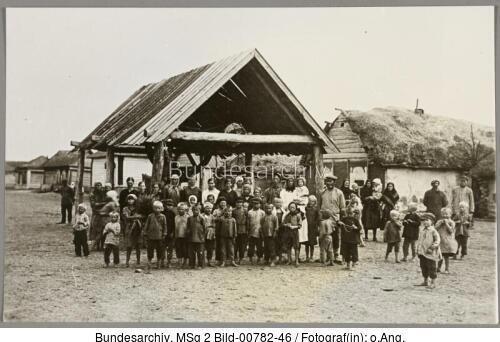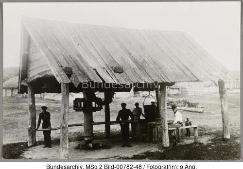 Деревенский колодец. Пара колес, приводимых вручную, покрытых крышей, поднимают грунтовые воды с глубины. Сооружение выглядит очень примитивным и самодельным, но именно в нем русские мастера с незапамятных времен. Фотография демонстрирует, что, несмотря на плохие условия, детский достаток является значительным. Сколько из них пережили Вторую мировую войну? Опять же, эти изображения показывают ширину деревенской улицы.