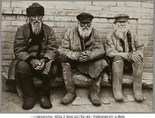 Томка. Немецкое секретное предприятие за железным занавесом в степях Поволжья недалеко от Вольска в 1928-1931 годах (демонтаж в 1933 году). Подготовка к зиме. Головные уборы, даже самые толстые меховые шапки, русский крестьянин носит даже в самую сильную жару, но не драгоценные валенки. Эти валенки без кожаной подошвы не переносят сырости, как молодые, так и старые, мужчины и женщины маршируют в них по хрустящему снегу в холодные зимние дни. Во время пребывания в Германии в зимние месяцы мы оставляли наши валенки в комнате в Томке. За это время в них охотно вырастили свое потомство покладистые, доверчивые коричневые мышки. Как и три парня на фото, зимой в Томке мы носили овчинные шубы мехом внутрь. Древние русские опередили нас в этой "моде" на столетия.