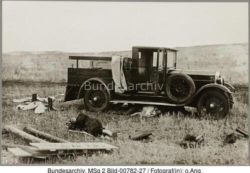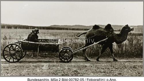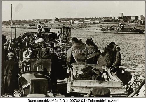 Советский Союз, в Вольске.- Тайное сотрудничество Рейхсвера и Красной Армии.- Испытательный полигон боеприпасов "Томка" для Рейхсвера и Красной Армии.- Переправа через Волгу с легковым автомобилем и верблюжьей упряжкой.