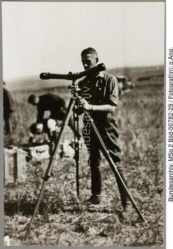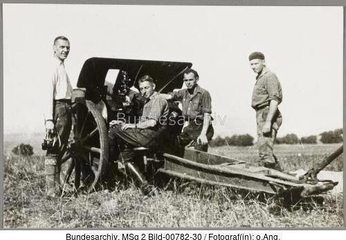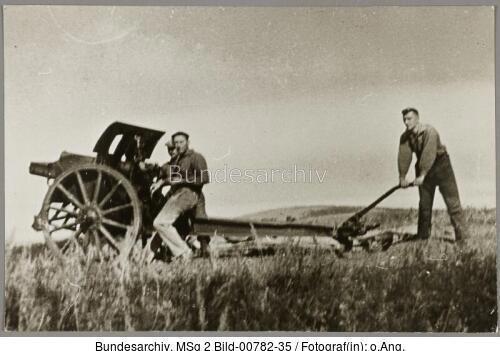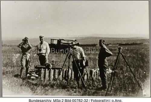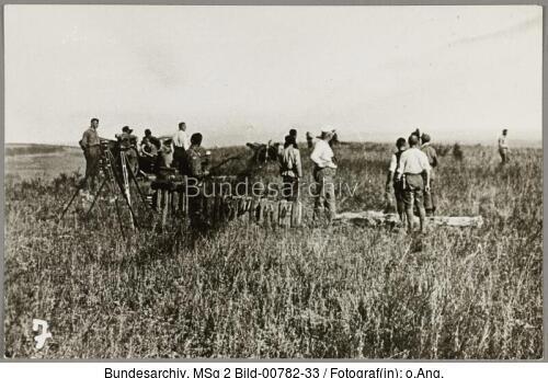 Подготовка к испытаниям на местности. Мужчины на геодезических работах (?), На заднем плане две 10,5-сантиметровые легкие полевые гаубицы