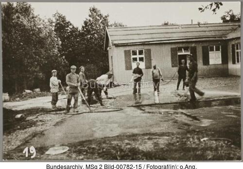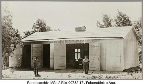 Казарма казино. Из березовых стволов русские умельцы соорудили нам изящный притвор. Так называемое казино состояло из большого зала, в котором мы, немецкие участники компании ("Томкинезен"), могли принимать пищу и, кроме того, проводить свободные часы. Вечернее, по-русски уютное сидение за жужжащим самоваром в течение нескольких часов может стать дорогой привычкой. Наступили холодные дни, все было выложено плиткой. Русские установили во всех бараках прочные печи: металлические кольца высотой 50 см и кирпичи, выложенные проверенным временем способом - для достижения максимального теплового эффекта - были идеальными распределителями тепла.