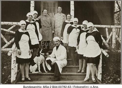 Российский обслуживающий персонал. На входе в барак казино как петух в корзине шеф-повар с Кавказа в профессиональной одежде - мастер по размахиванию ложкой и танцу на мечах. Сзади него "в штатском" две его постоянные кухонные феи. Левый и правый фланги: "Девушки в форме", одежда из Германии. Как и русские рабочие, эти универсальные служанки (горничные, помощницы на кухне, прачки, служанки) были назначены русским комендантом. На службе они появлялись только в полдень, когда их обслуживали. Личные контакты с ними нежелательны. Со временем эти правила ослабли; иногда девушку брали с собой в Вольск, если там жил возлюбленный.