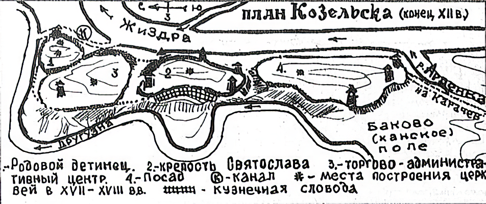 ВОТ исторический Козельск по археологии. Между трёх рек. Отделённый специальным рвом-каналом. Несколько укреплений с башнями на насыпях. Просто представьте себе, КАКОВО было брать ЭТО в весеннее, мать его, половодье! Кругленькая маленькая крепость там была, факт - старый детинец, стерегущий ров - но она там была НЕ ОДНА. Потому что русские оттого и имели оружие своё славнымЪ, что не были ИДИОТАМИ блин, а были умными и хитрыми фортификаторами и мастерами военного дела! Что ж вы так любите своих героических предков, что выставляете их маразматиками-дикарями, не понимающими, как город-то построить, а? А? Ы.