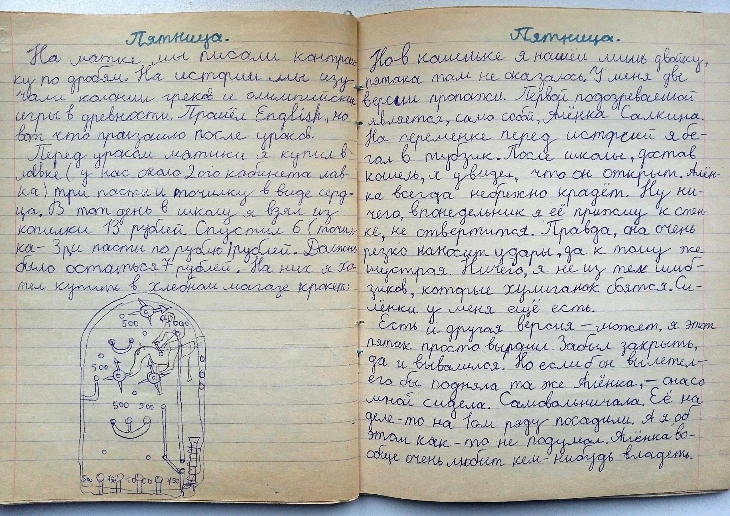 В возрасте 9 лет, послушавшись чьего-то совета, я начал вести дневник и занимался им несколько месяцев, описывая унылое житье-бытье в школе и дома. Нельзя сказать, что эксперимент удался на славу, — для чего и как ведутся дневники, я понимал плохо, — зато сохранившийся памятник дает возможность судить о прогрессе «генеративного интеллекта» и измерять былое уважение к букве Ё.