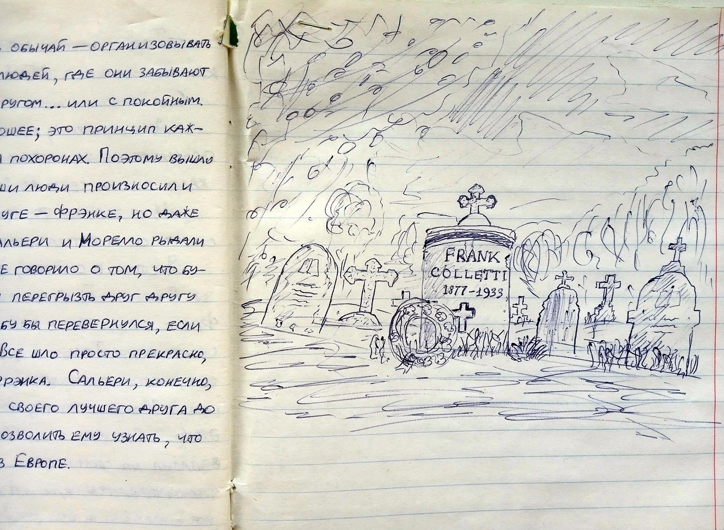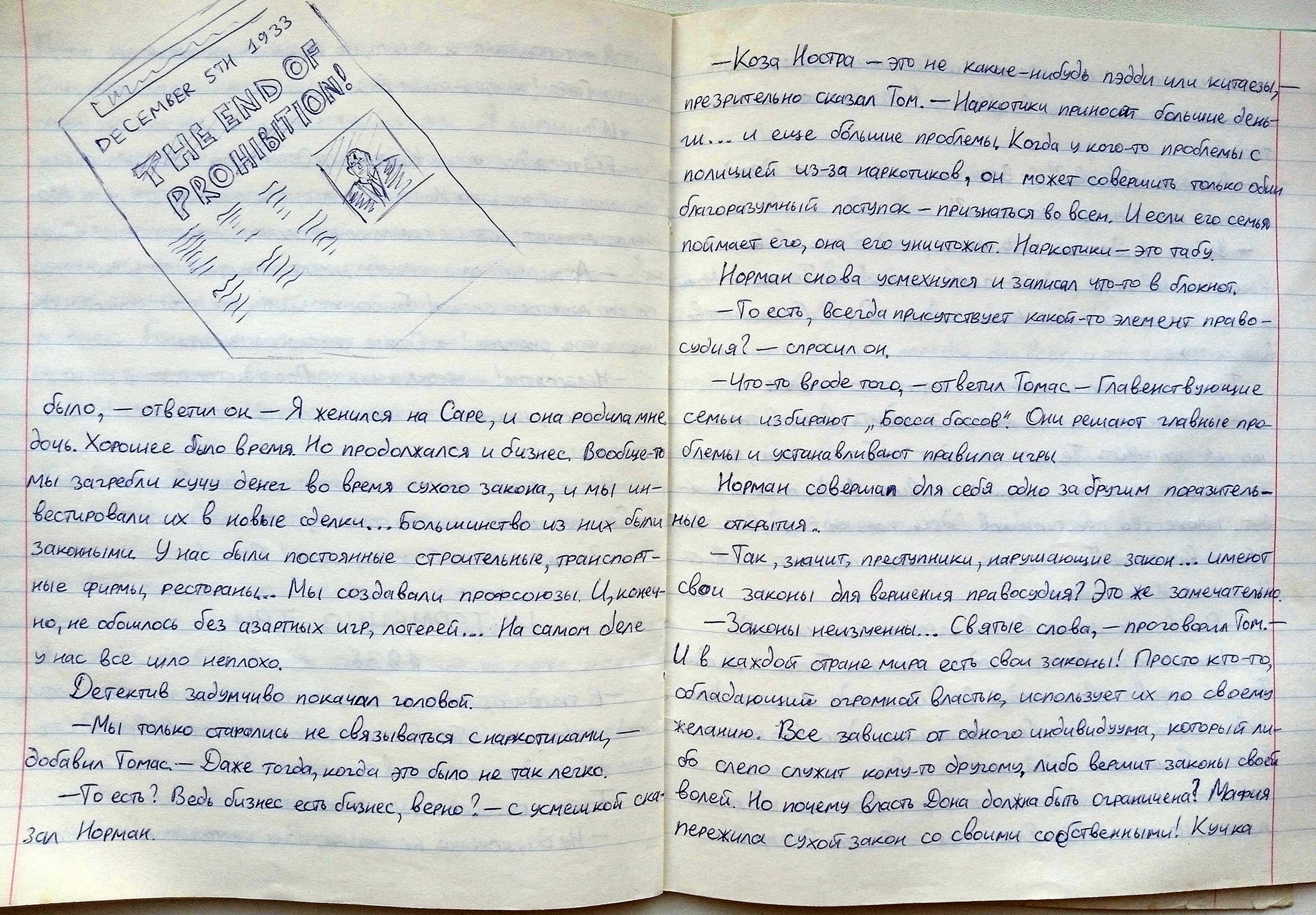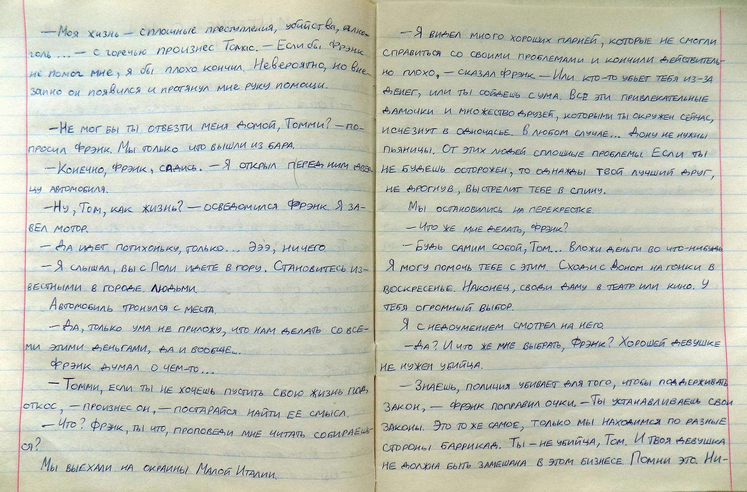 Попытка была очень милая, я думаю, вы с этим согласны. Но мне было не то 12, не то 13 лет от роду (еще не ломался голос, это точно), способности едва брезжили, умения не развились, да и материала недоставало для литературной формы, — короче говоря, те тринадцать глав, какими я перенес их на бумагу, мало что могли противопоставить закоренелым предрассудкам. Мама сказала: «Неплохо», и этим ограничилось. Что ж! Зато благодаря великой игре я до такой степени заинтересовался гангстерской романтикой, что выучился английскому и прочел первую книгу на этом языке — «Крестного отца». Знаете афоризм про второй язык и вторую душу? Чистая правда!