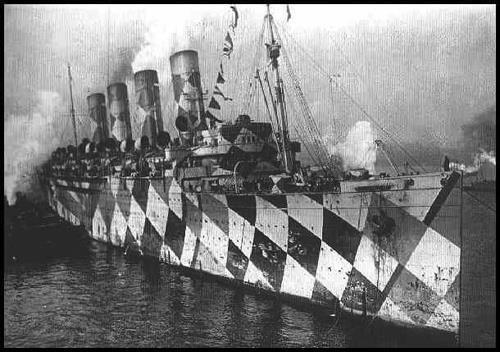 Автор: Алекс РусскихОдним из способов пассивной обороны кораблей в Первой и Второй мировых войнах от подводных лодок стала окраска корпусов "разбивающих" силуэт. В результате становилось непонятно в каком направлении корабль идет корабль, приближается он или удаляется. Тем более это было непонятно через окуляр перископа.