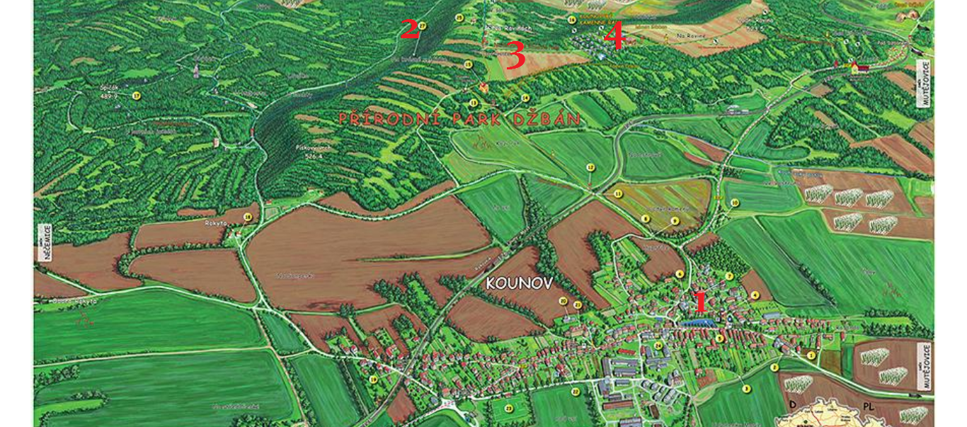 Хотели подняться на холм Джбан (Жбан), но тама природный парк и на всех дорожках висят кирпичи. Поэтому мы объехали Джбан до точки 2, где оставили машину и поднялись пешком на холм к деревеньке 3, а оттуда уже рядышком точка 4 - сами ряды.