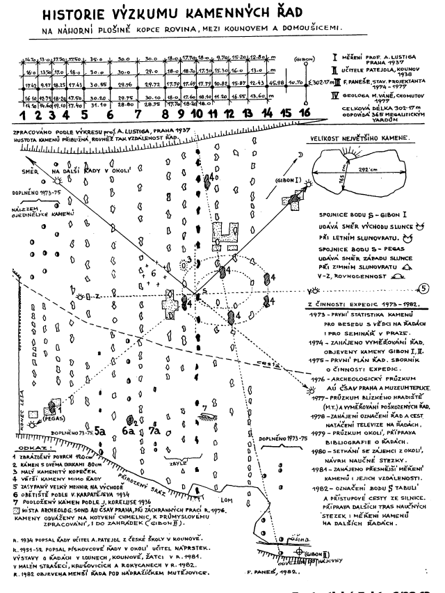 В 1934 году молодой учитель Антонин Патейдл обнаружил на холме Ровина, что севернее села Коунов, странные каменные ряды. О их существовании местные жители знали, но не считали их ничем примечательным. Но Падейдл понял, что это нечто неестественное. А когда произвел замеры и сосчитал камни, то по его спине учителя побежали мурашки. Ряды, укрытые в лесу, оказались гигантскими: несколько тысяч камней занимали площадь в несколько гектаров. Некоторые камни были так велики, что невозможно было себе представить ту силу, которая могла бы из сдвинуть. Ряды тянулись на несколько десятков метров, но самое удивительное - тянулись почти точно с севера на юг параллельно друг другу и в правильных интервалах. Падейл был уверен, что это не шутка природы, но дело человеческих рук. Но кто бы смог сотворить столь потрясающее творение и зачем?
