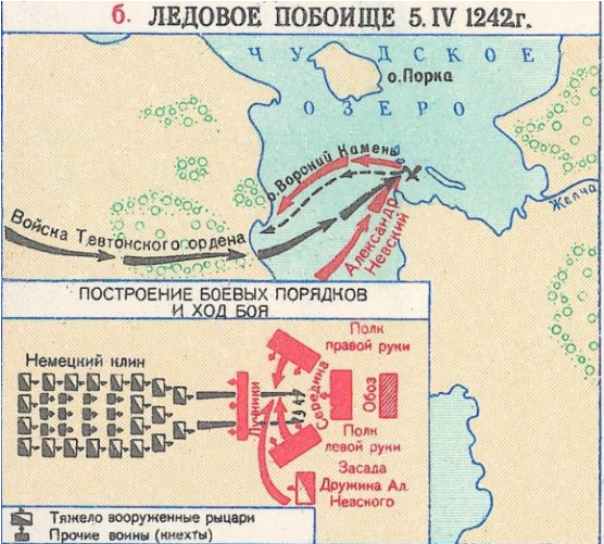 1) Построение русский войск с пехотным "щитом" в центре и конницей на флангах известно ещё с битвы при Листвене 1024 года, её автором считается Мстислав Храбрый. И как мы можем убедиться на схеме выше, Александр Невский в битве на Чудском озере про тактику далёкого родича вполне себе знал, только заметно её усовершенствовал.
