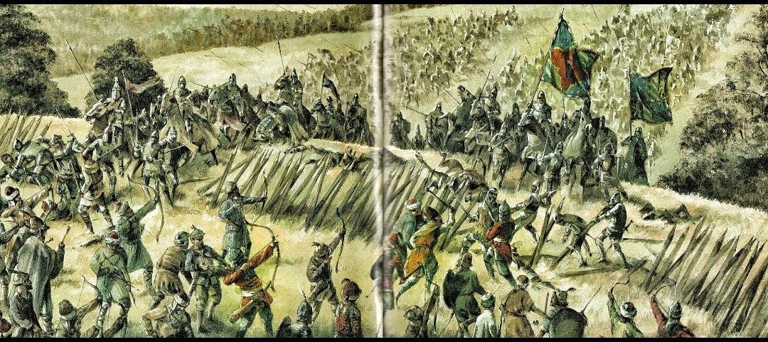 2) В описании битвы при Коломне, самого крупного сражения с ордынцами, в котором, напомню, погиб чингизид Кюльхан, темник и единственный сын Чингисхана в западном походе (находившийся со своими телохранителями однозначно в задних рядах тумена!) упоминаются полевые укрепления русичей - надолбы. Но друзья, надолбы - то есть заостренные колья, вкопанные в землю под углом к врагу - это полевые укрепления, предназначенные для защиты пехоты. Собственной коннице надолбы будут мешать!