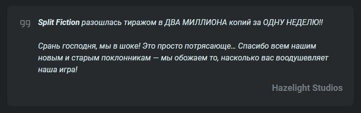 Автор: Анастасия МашевскаяИтак, в минувший четверг мы доиграли Split Fiction, и хотелось бы немного еще поговорить об этой игре по итогам прохождения, когда все эмоции уже немного улеглись. Аспекты, озвученные вот в этом посте, я повторять не буду. Однако некоторые мысли, которые я озвучу, родились у нас в беседах с прекрасным человеком и тиммейтом, с которым мы проходили игру. Гоголь говорил, что «обращаться со словами нужно честно», поэтому приписывать результат диалогов единолично себе, не возьмусь.