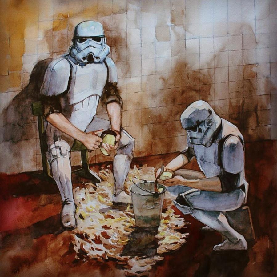 Автор: Алекс РусскихНе парадная сторона "звездных войн". Война войной, а обед положен по расписанию. Кстати, если картошку чистить световым мечом, то она получается сразу жаренная.