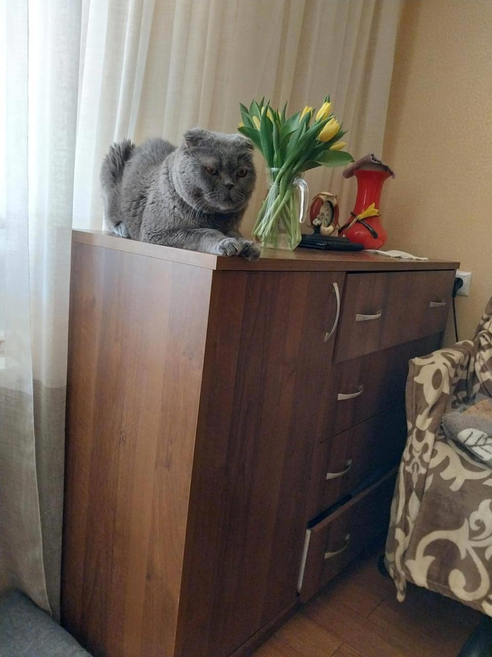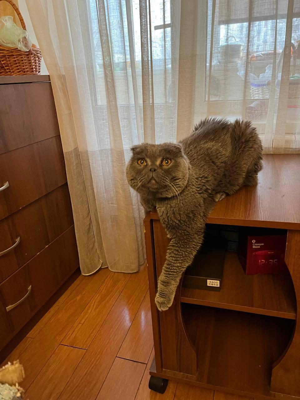 С местной кошкой и не общаются и не конфликтуют (надеюсь, мне не врут, но кошка взрослая и британка, должна быть спокойна и флегматична. В любом случае, более лучшая компания, чем игривая и любопытная Кнопка.)