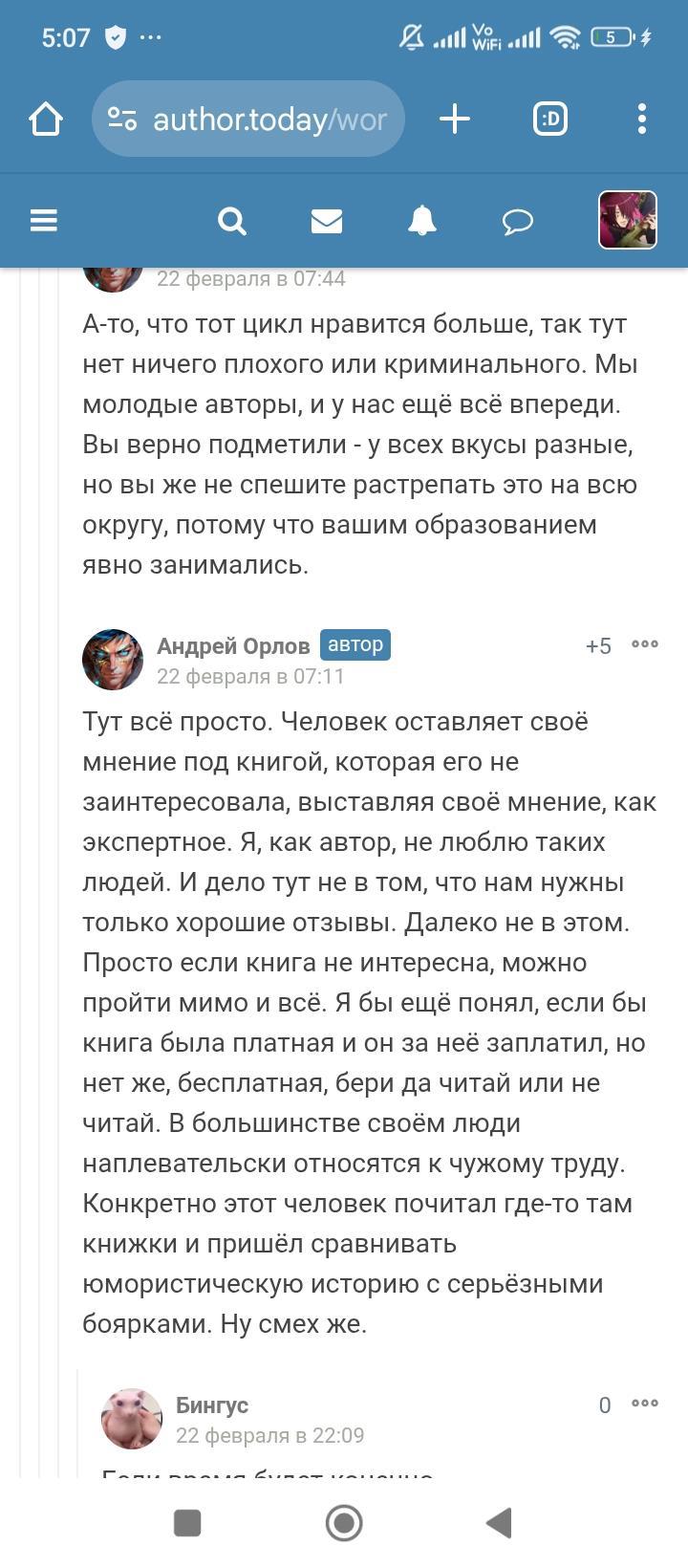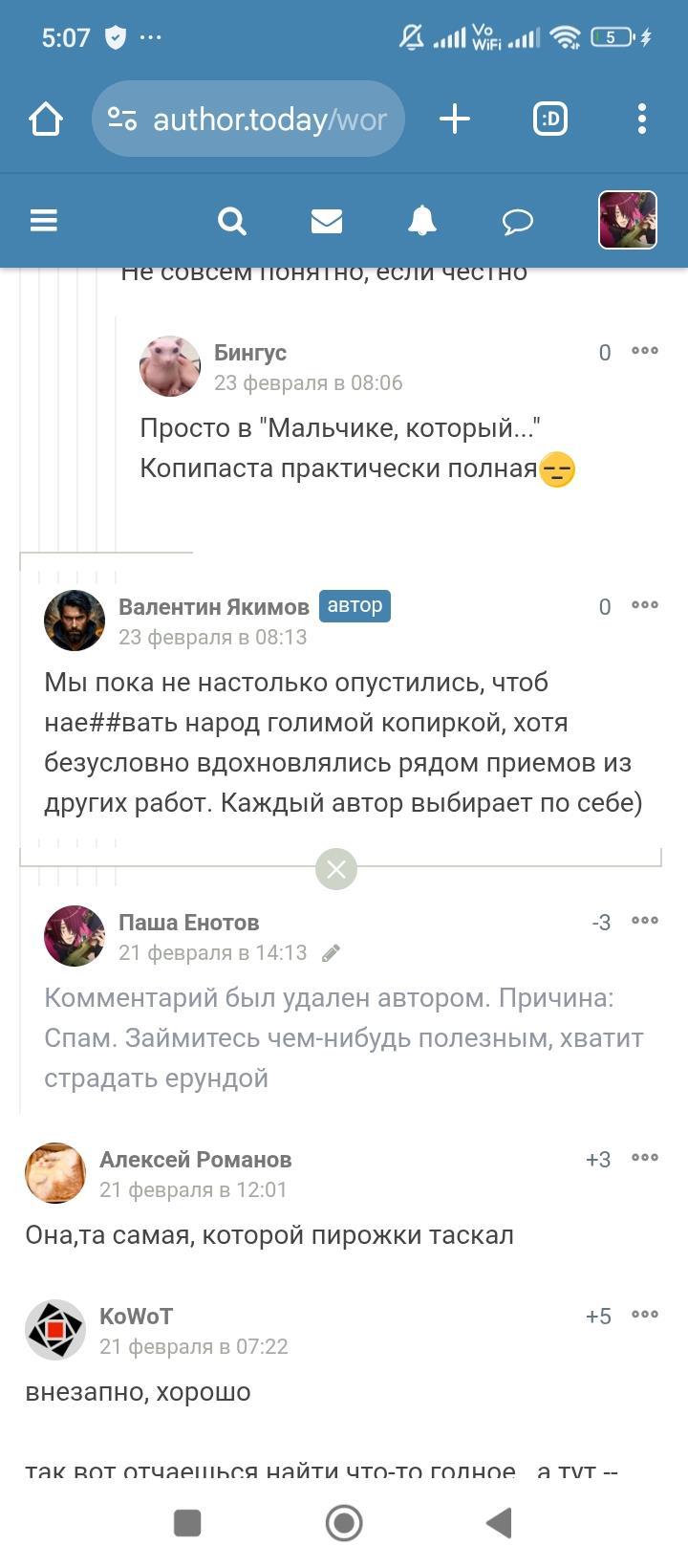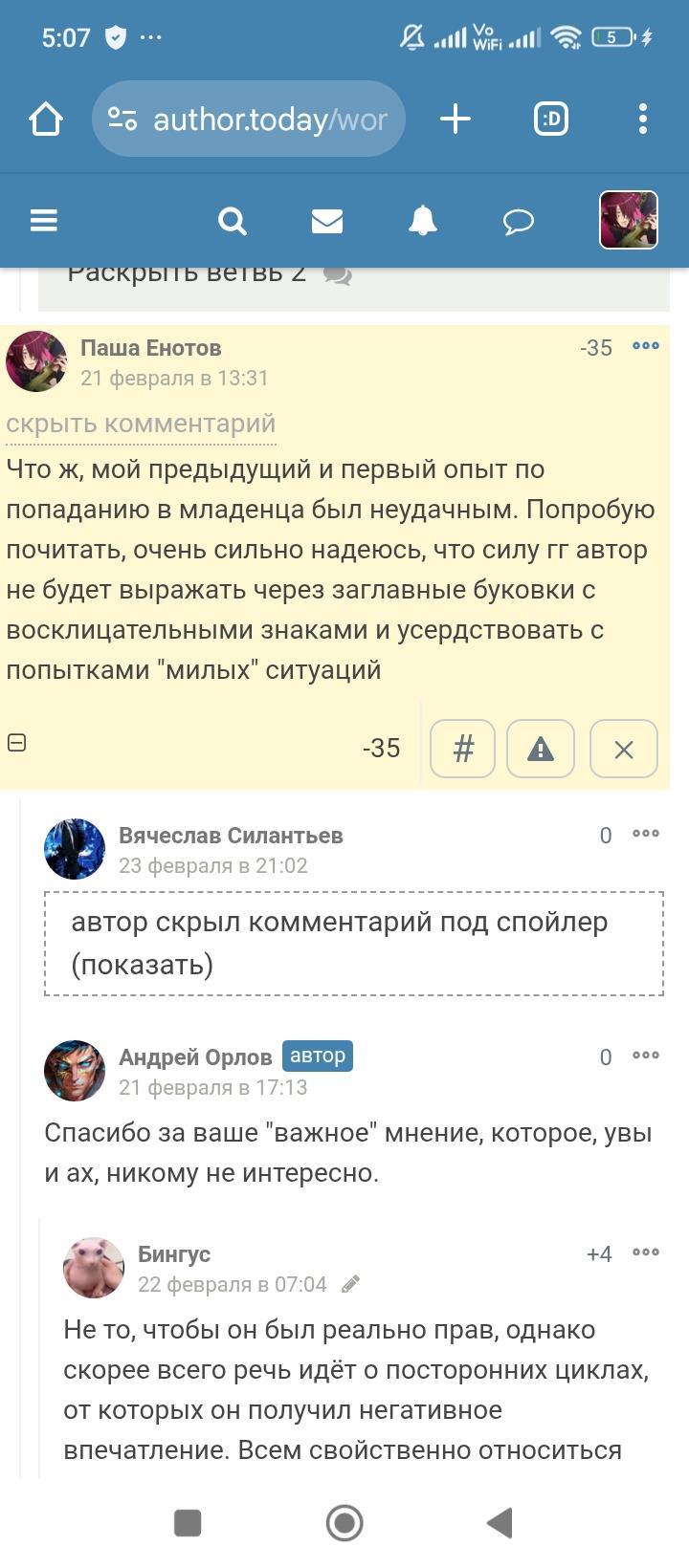 Автор: Паша ЕнотовВсем привет. В этом посте поделюсь своим первым негативным опытом с общением (скорее негативной ответной реакцией на мой комментарий) с автором на АТ. Конечно я знал, что идеальных людей не существует, но до этого встречал авторов, банящих, спорящих с читателями, оставившими негативные отзывы, только со стороны и не видел каких-то совсем уж неадекватных реакций. И так - в феврале я наткнулся на боярку в младенца, мне не понравилось и спустя через неделю в реках наткнулся на схожую боярку. И решился попробовать почитать, решил, что вполне вероятно мне попался "слишком" боярный автор. Соответственно написал об этом комментарий - "Ранее читал подобное - не понравилось, попробую вот это, надеюсь ... не будет как в прошлом случае". И вот блин, засада, ситуация повторилась, мне не понравилось и практически по тем же причинам. Соответственно под своим комментарием, я и оставил итог моего ознакомления с произведением. Мол так и так, 'мне не понравилось *спойлер* почему мне не понравилось, конкретные моменты *спойлер* увы но такое не для меня, желаю всем удачи'. Т.е достаточно дипломатично и без откровенного хейта, просто комментарий с негативным мнением, которое я еще и аргументировал и подчеркнул, что это мое мнение и мой вкус. Как оказалось, автор считает свои произведения - верхом искусства, а комментарии под ними - полем битвы. Ответную реакцию пересказывать не буду. На скринах все будет, чтобы не искажать ситуацию.