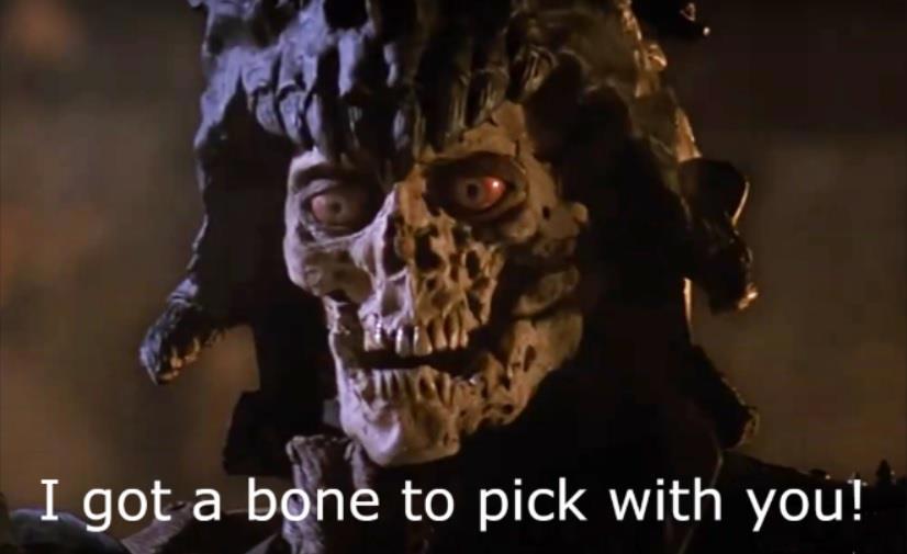 Особенно мне понравился эпизод, где обратившийся в скелет предводитель Армии Тьмы перелазит через парапет и грозит главному герою: "I got a bone to pick with you!"