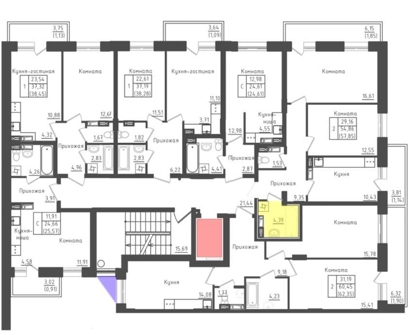Ну и по мелочам — в целом очень странная планировка. Выделенная желтым площадь логичнее бы смотрелась в квартире с коридором, и таких «врезок к соседям» — в трех из шести квартирах на этаже.