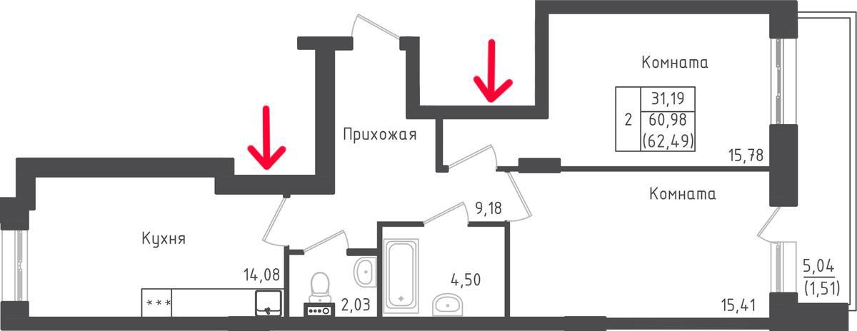 Квартира — две комнаты и кухня, ничего особенного, кроме нелепого коридора (правая стрелка). Коридор узкий, на ширину двери — то есть даже полочку не повесишь. Если его прирезать к прихожей, на его место получится впихнуть какой-нибудь шкаф, например. Ну и зачем этот коридор вообще нужен?