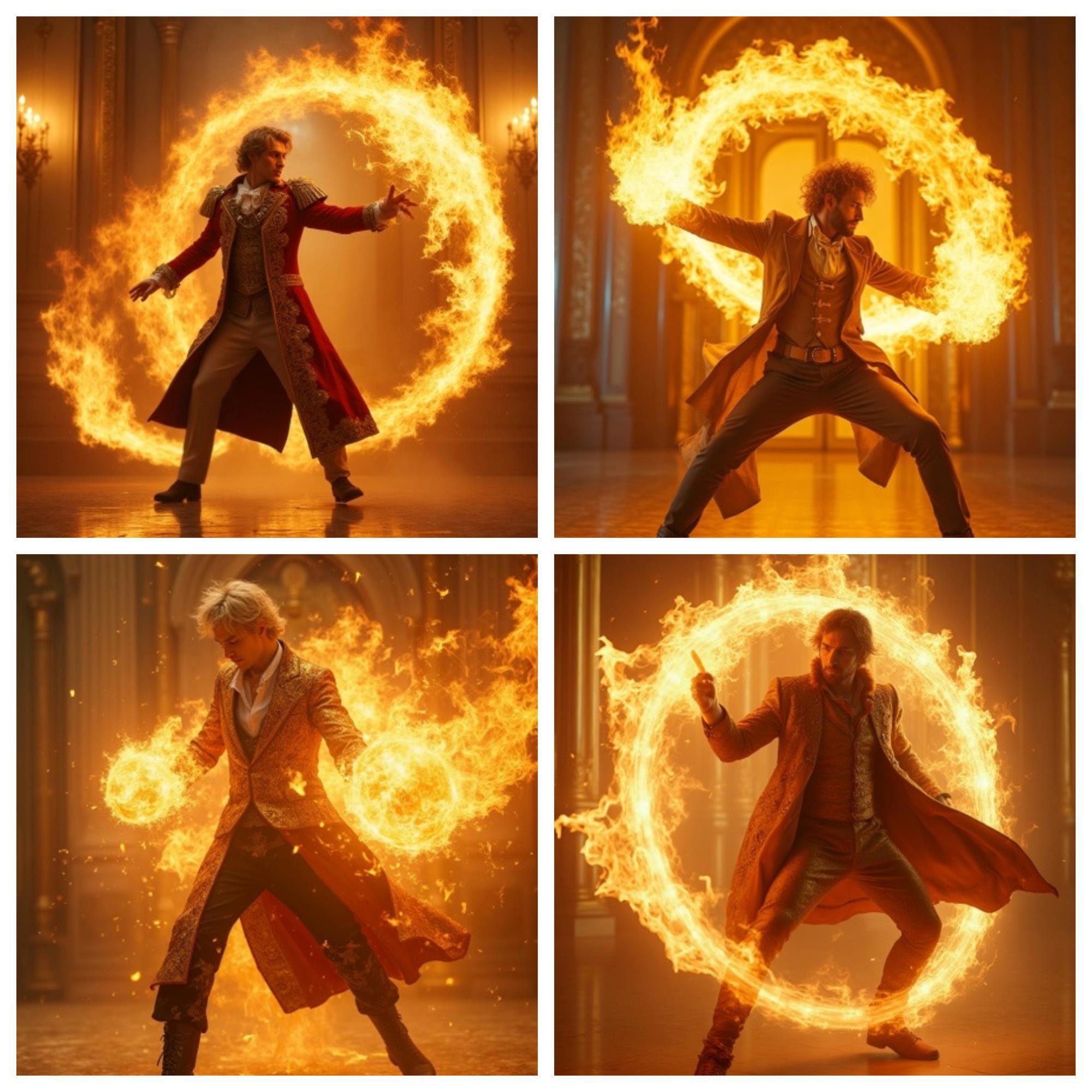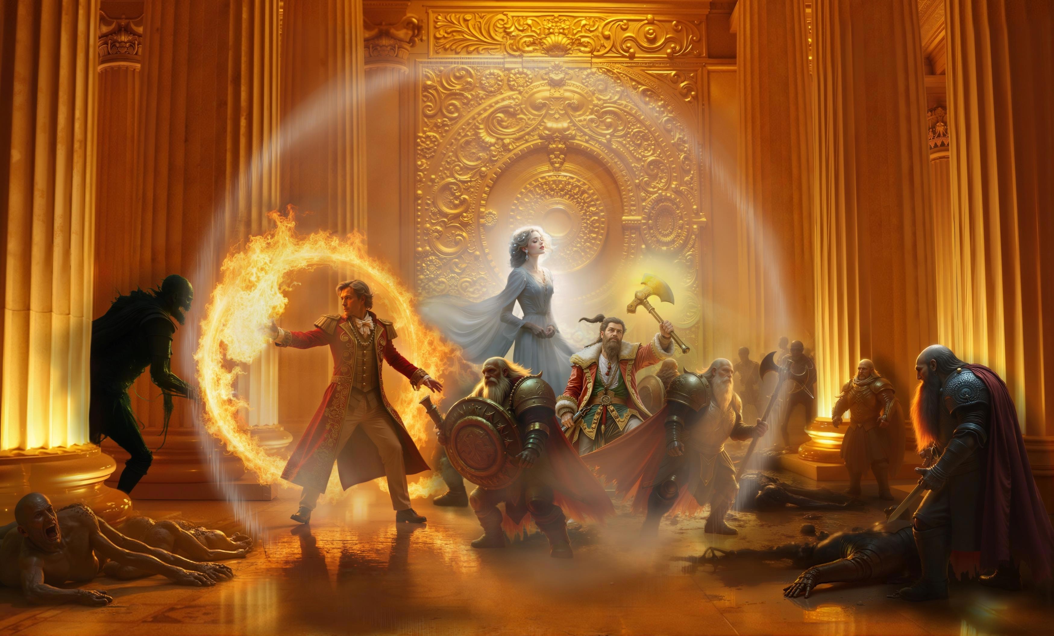Общую композицию я прогнала через ИИ, чтобы сцепить элементы и улучшить детали. Увы, нейросеть не лучшим образом прошлась по внешности отдельных героев, испортила пламя и местами магический щит. Поэтому примерно треть обработанного арта я стёрла, оставляя только то, что мне было необходимо для цельной картины.