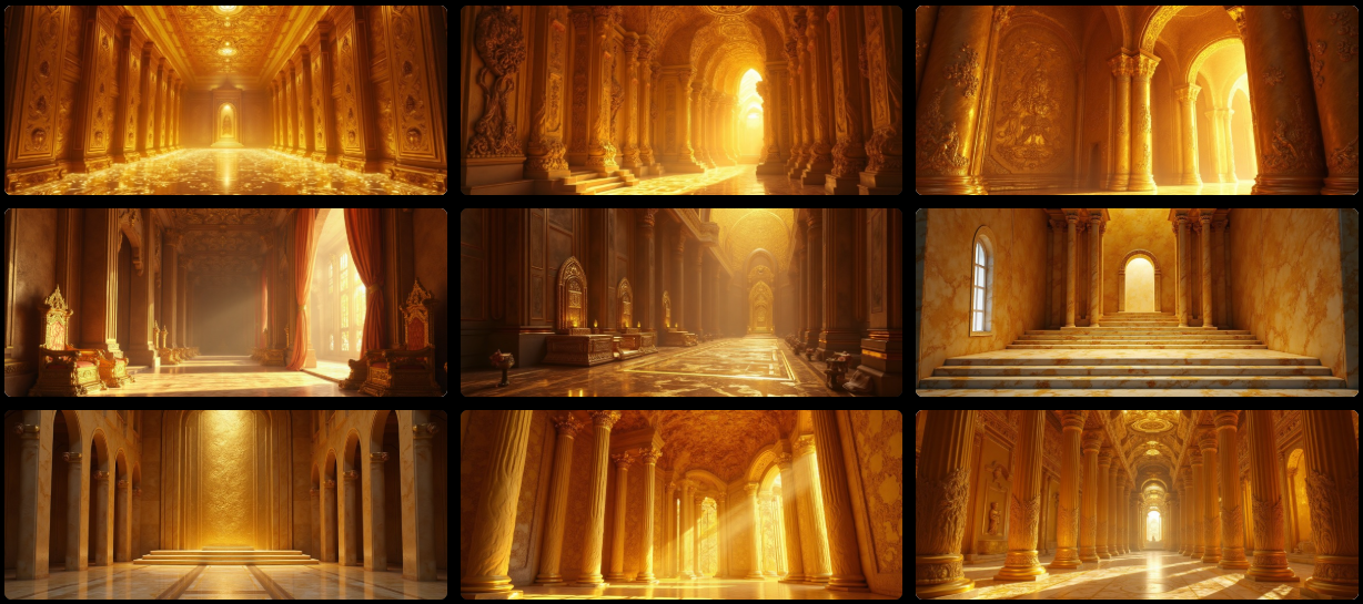 Всё началось с фона, а именно тронного зала. Нагенерировав десятка три вариантов, я недовольно кусала губы, пытаясь понять, как мне дожать ИИ, чтобы получилось хоть что-то подходящее под образ в моей голове. Увы, при запросе «тронный зал» или просто «зал» нейросеть всегда создавала картинки со стороны входа, а мне нужен был ракурс сбоку.