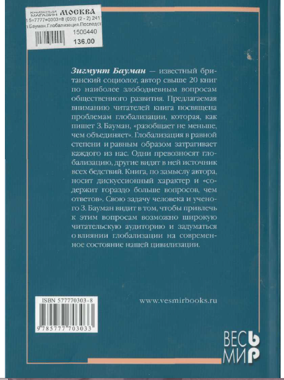 Автор: Игорь АретаноПопалась мне в руки книга — Зигмунт Бауман (1925-2017, Британия) "Глобализация. Последствия для человека и общества".