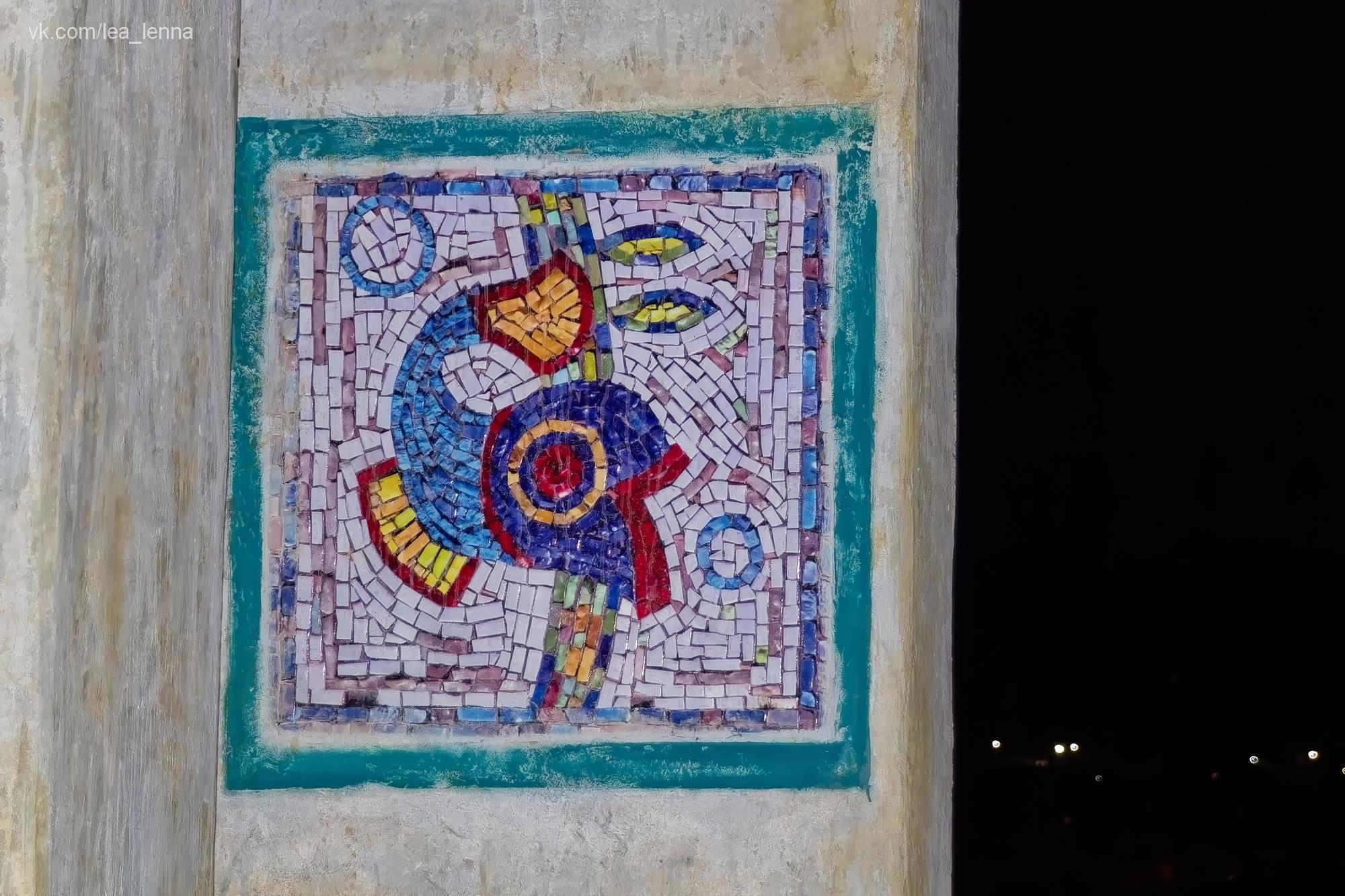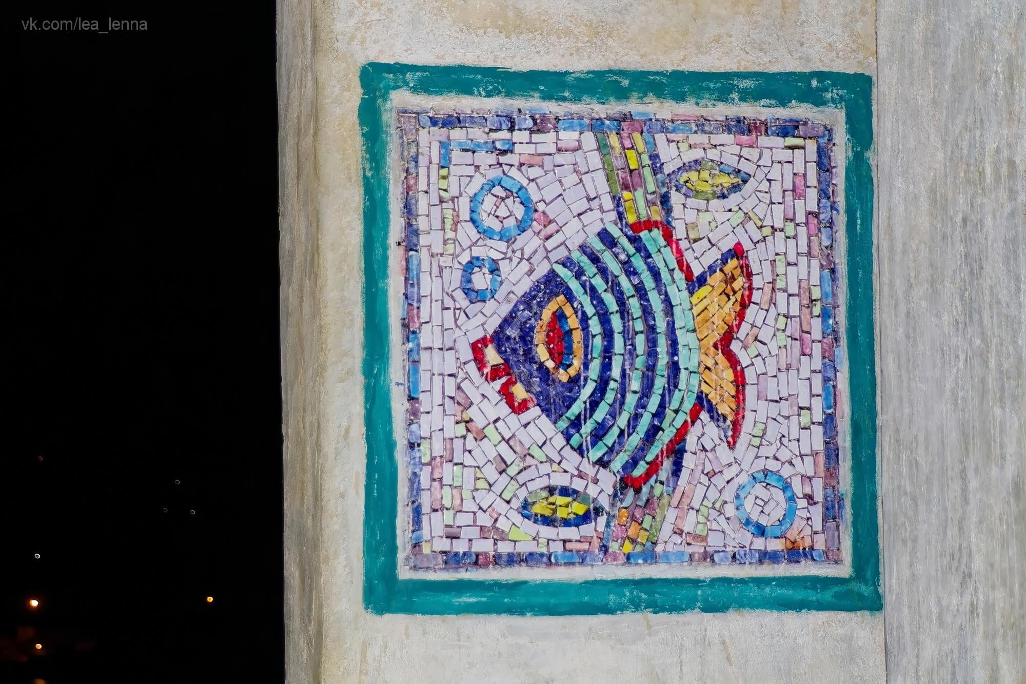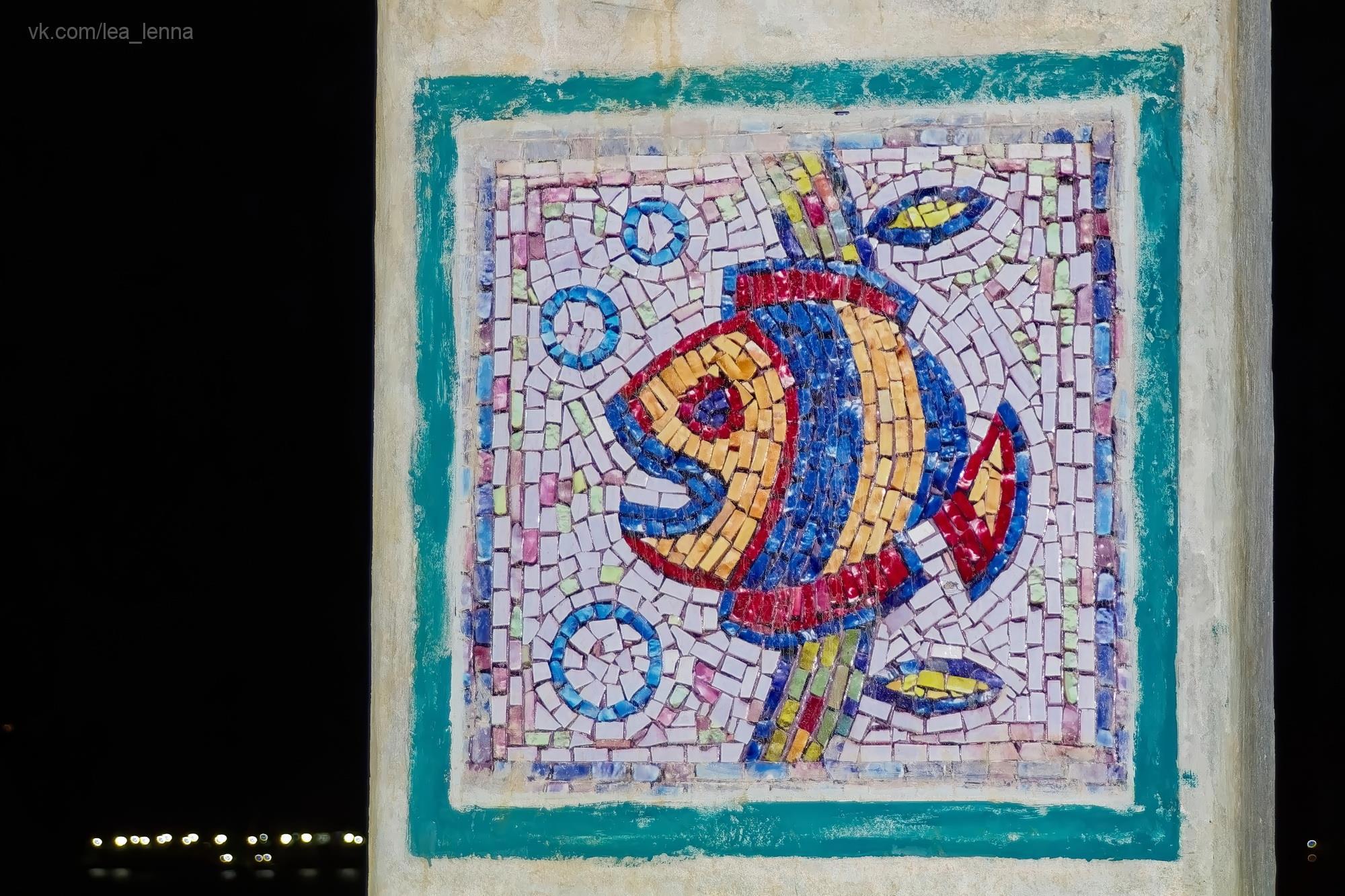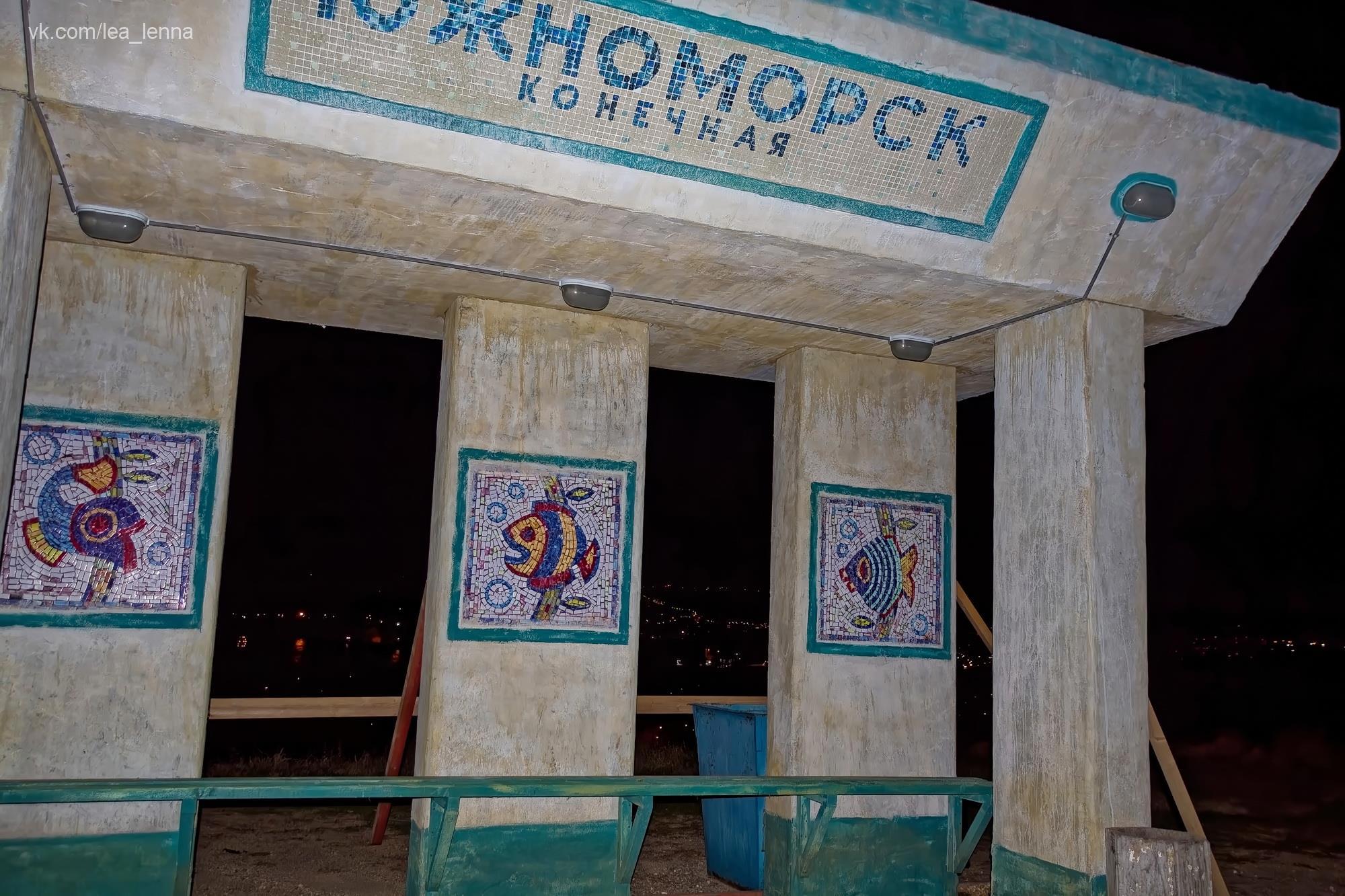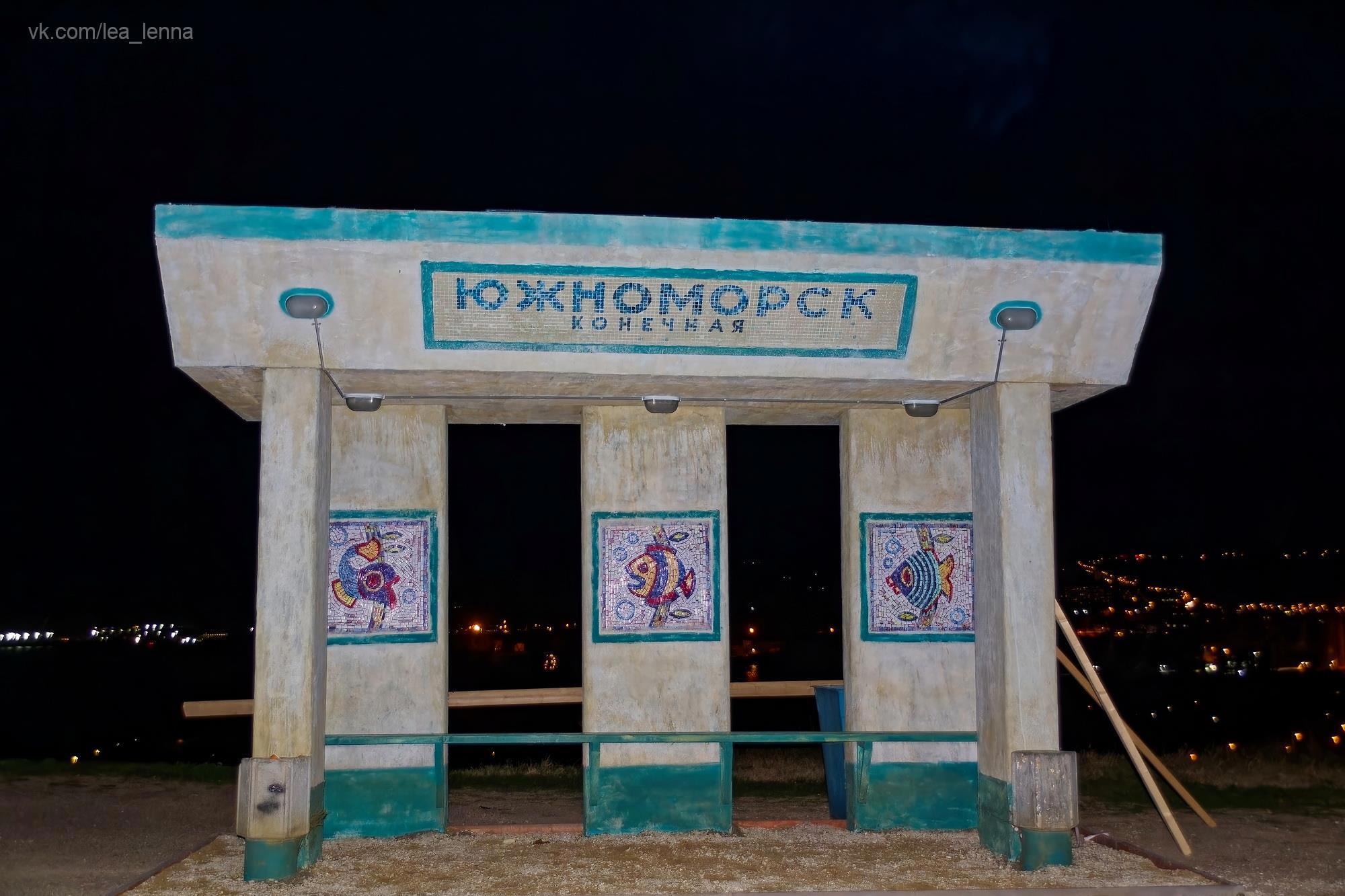 А потом случился кусочек сказки, я про это писала давно, еще в фб наверное. Октябрьским вечером 2016 года после заката я решила пройтись с диких холмов на цивильную смотровую и спуститься в город по лестнице, а не тропинками всякими. Темнота полная, внизу городские огни, совершенно пусто наверху, ветер гуляет. Я одна. И вдруг, там, где недавно было просто пустое место - стоит освещенная автобусная остановка. Над городом. Классическая такая наша - каменная коробка с лавкой внутри и с мозаичными стенками. А на мозаиках - цветные рыбы... И название остановки: "Южноморск".