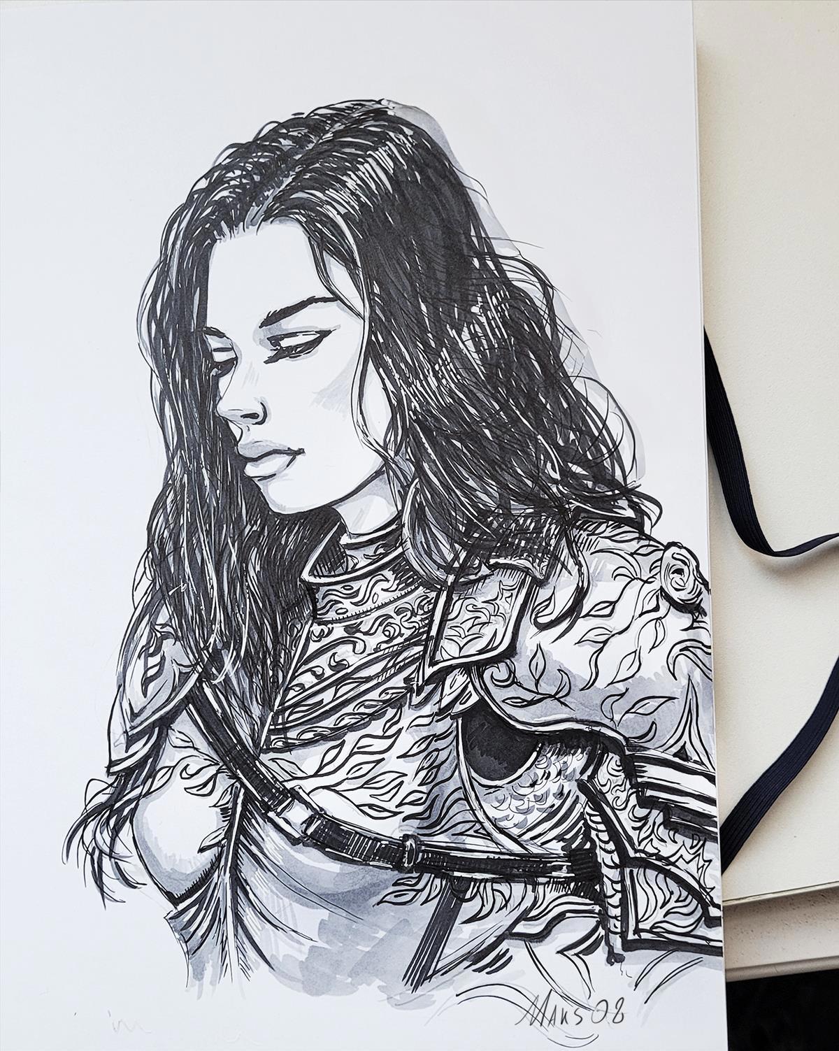 Автор: Макс РостовскийРисунок девушки маркерами в модном скетчбуке.