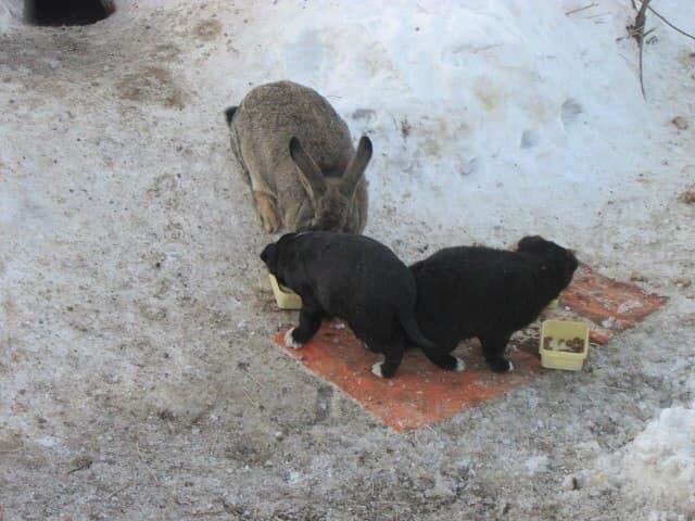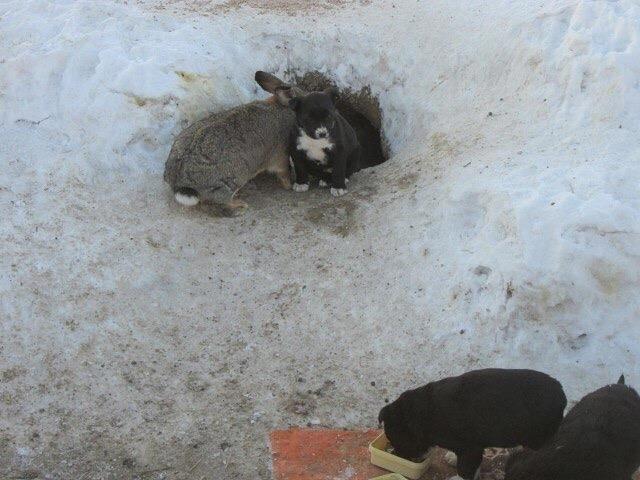Увидев замерзающих щенят, кролик поступил как настоящий Человек с большой буквы, он приютил их в своем жилище, перетащив туда по одному за хвосты.