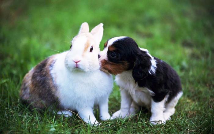 Благодаря воспитанию кролика щенята стали добрыми и домашними.