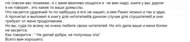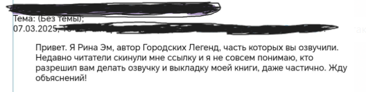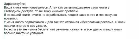 Три дня я искала контакты этого чтеца. Написала в комментариях под озвученной книгой: «свяжитесь со мной, я автор!» Но никто мне не ответил. Ладно. Всё-таки нашла его почту. Далее скрины, чтобы не быть голословной.