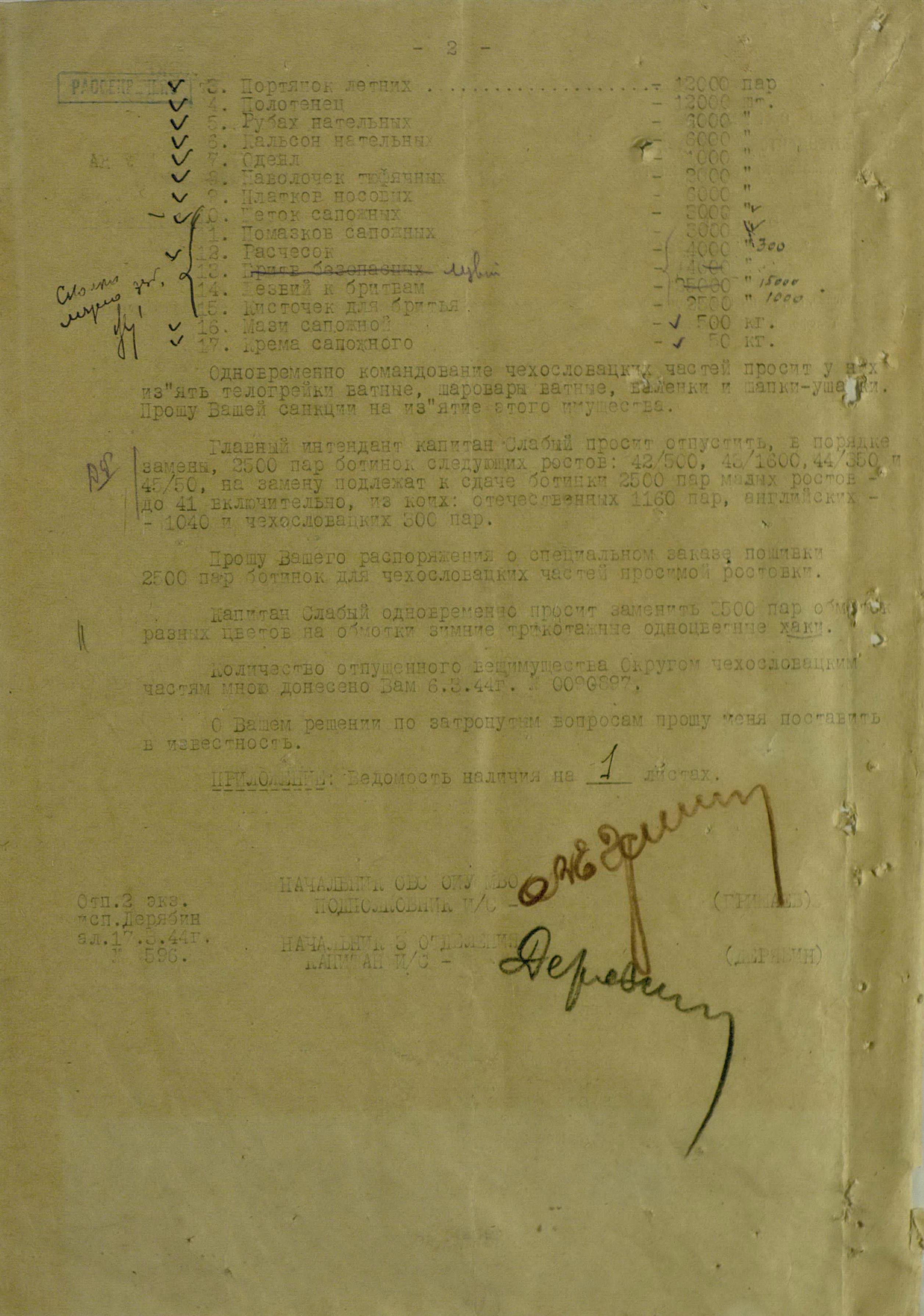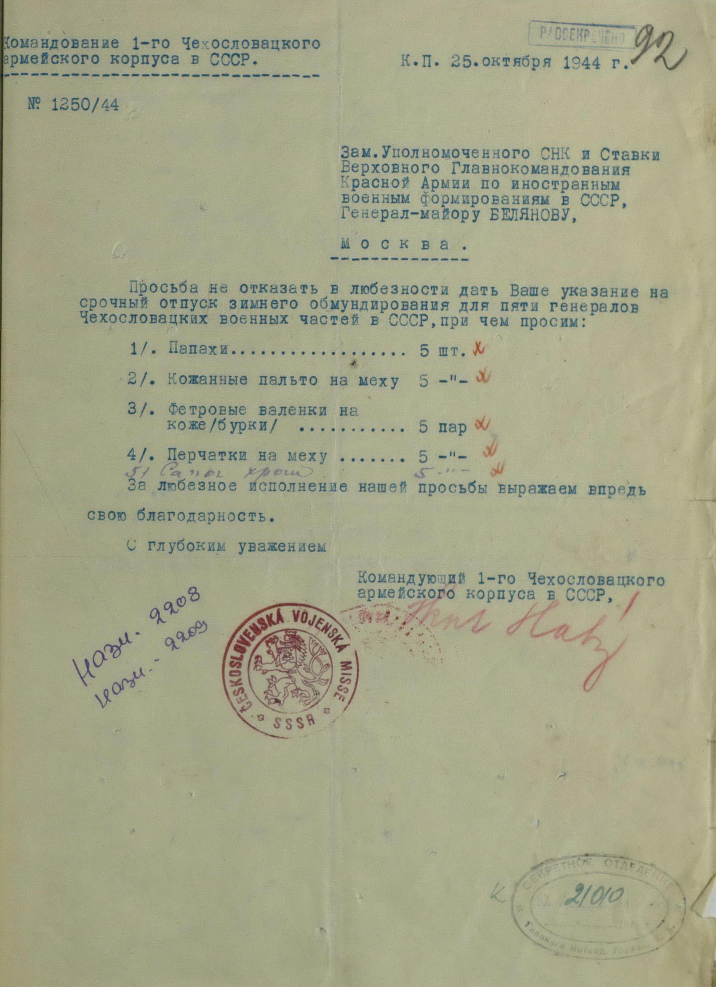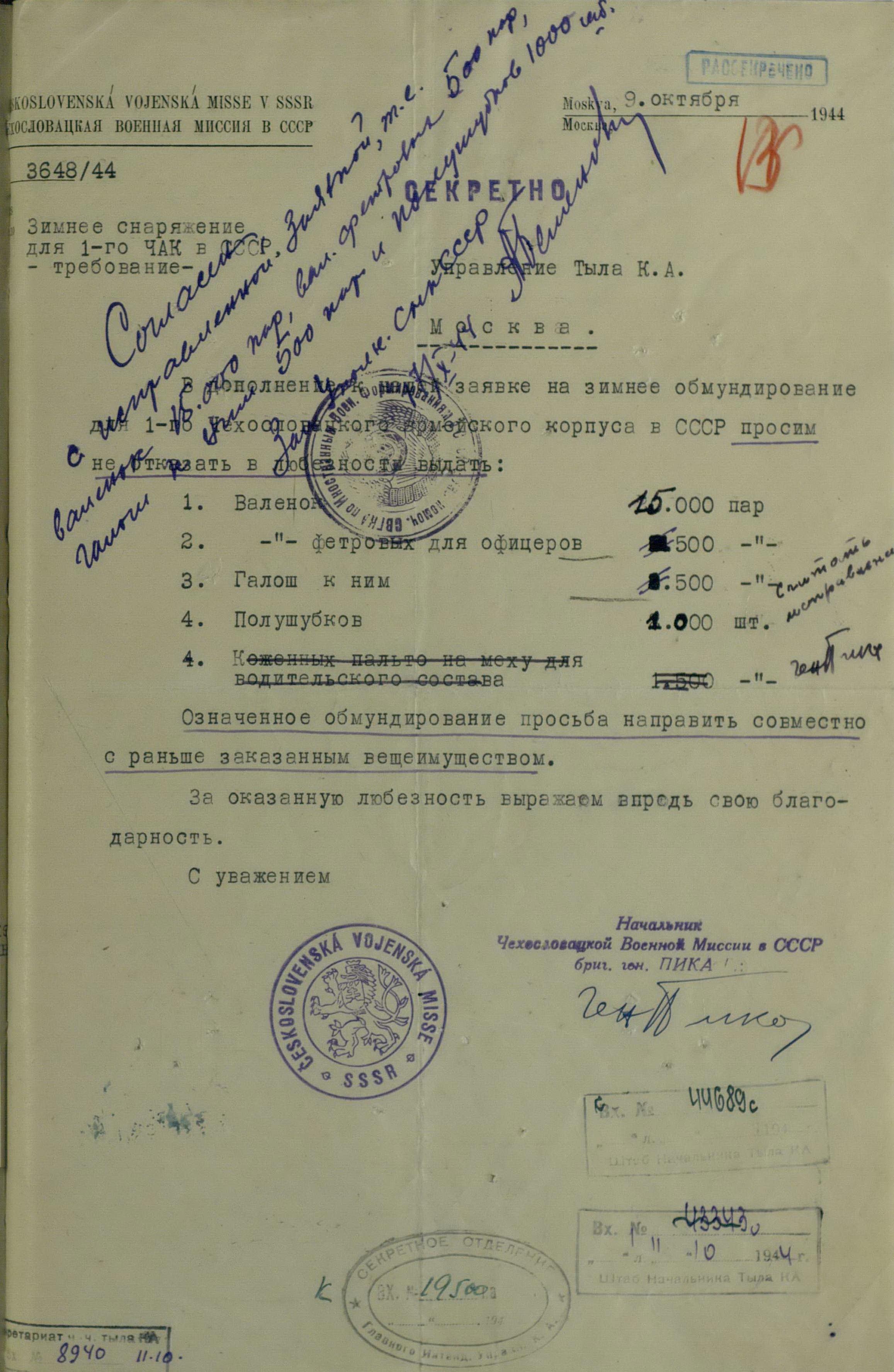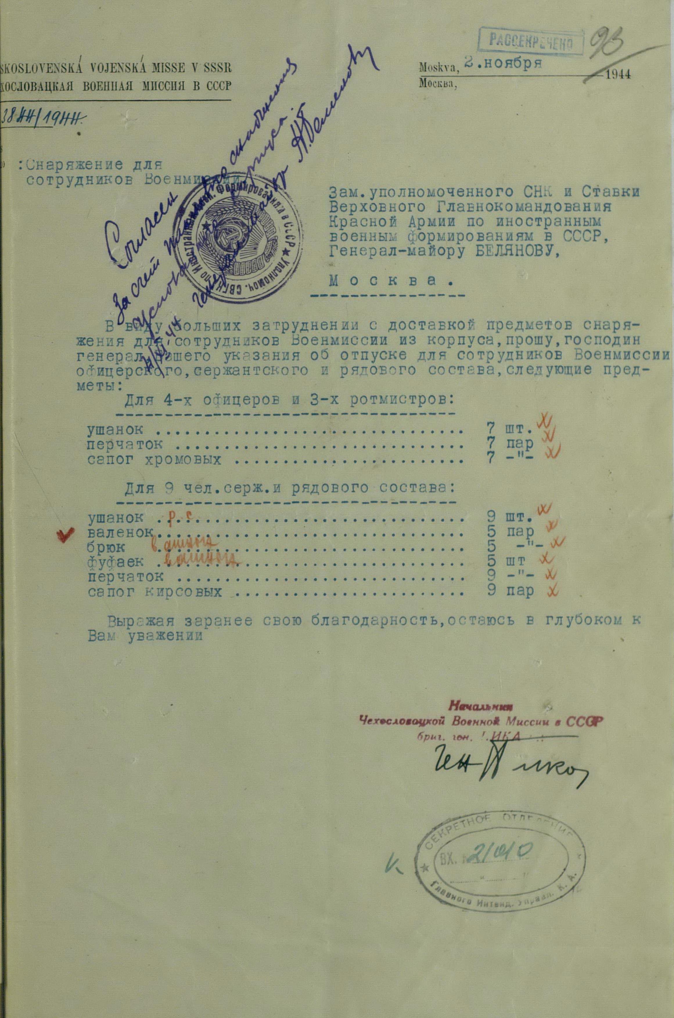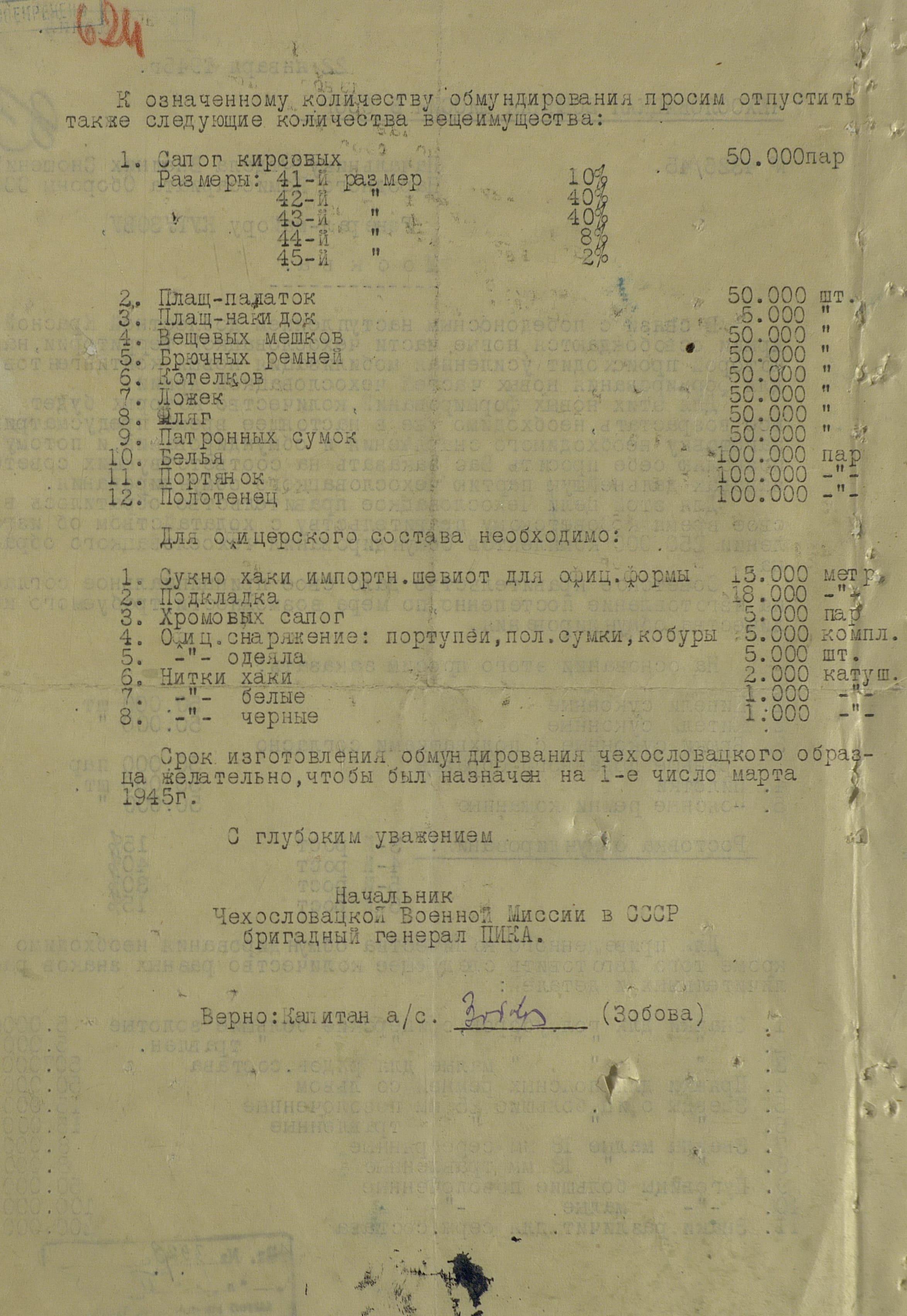 Но просьбы и пожелания о выдаче тех или иных предметов для генералов или миссий не была большой проблемой. Основную головную боль советским интендантам доставляли постоянные устные и письменные заявки на обеспечение войск. Командиры объединений и соединений присылали свои пожелания, без каких-либо обоснований численности, а ведь там счёт уже шел на тысячи, а то и десятки тысяч ппредметов. Бесспорно, для сражающихся войск всё это нужно, важно, особенно зимние вещи, вот только складывается впечатление, что заявки готовились с прицелом на будущее, на обеспечение ещё не существующей, но планируемой к созданию армии Чехословакии.