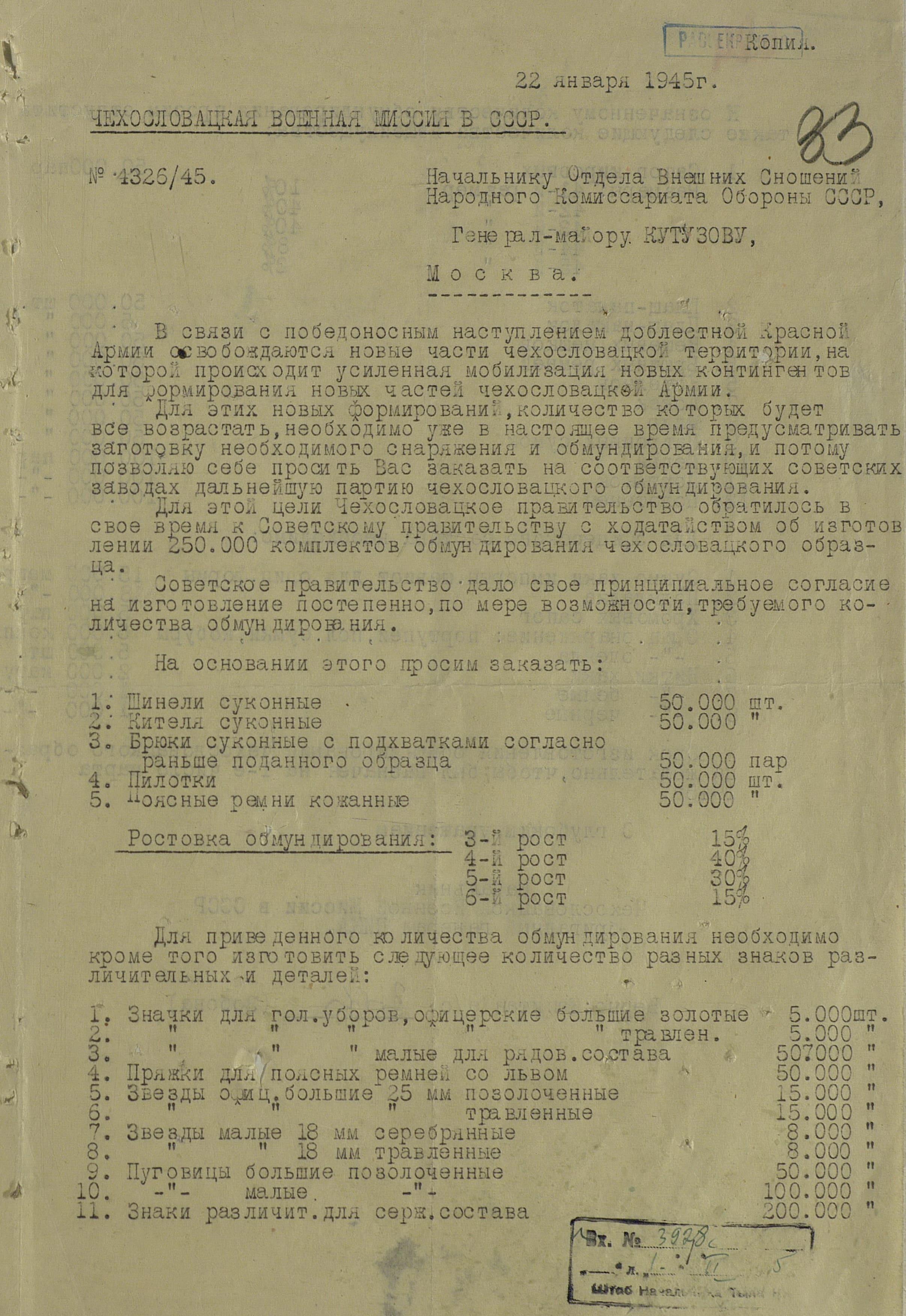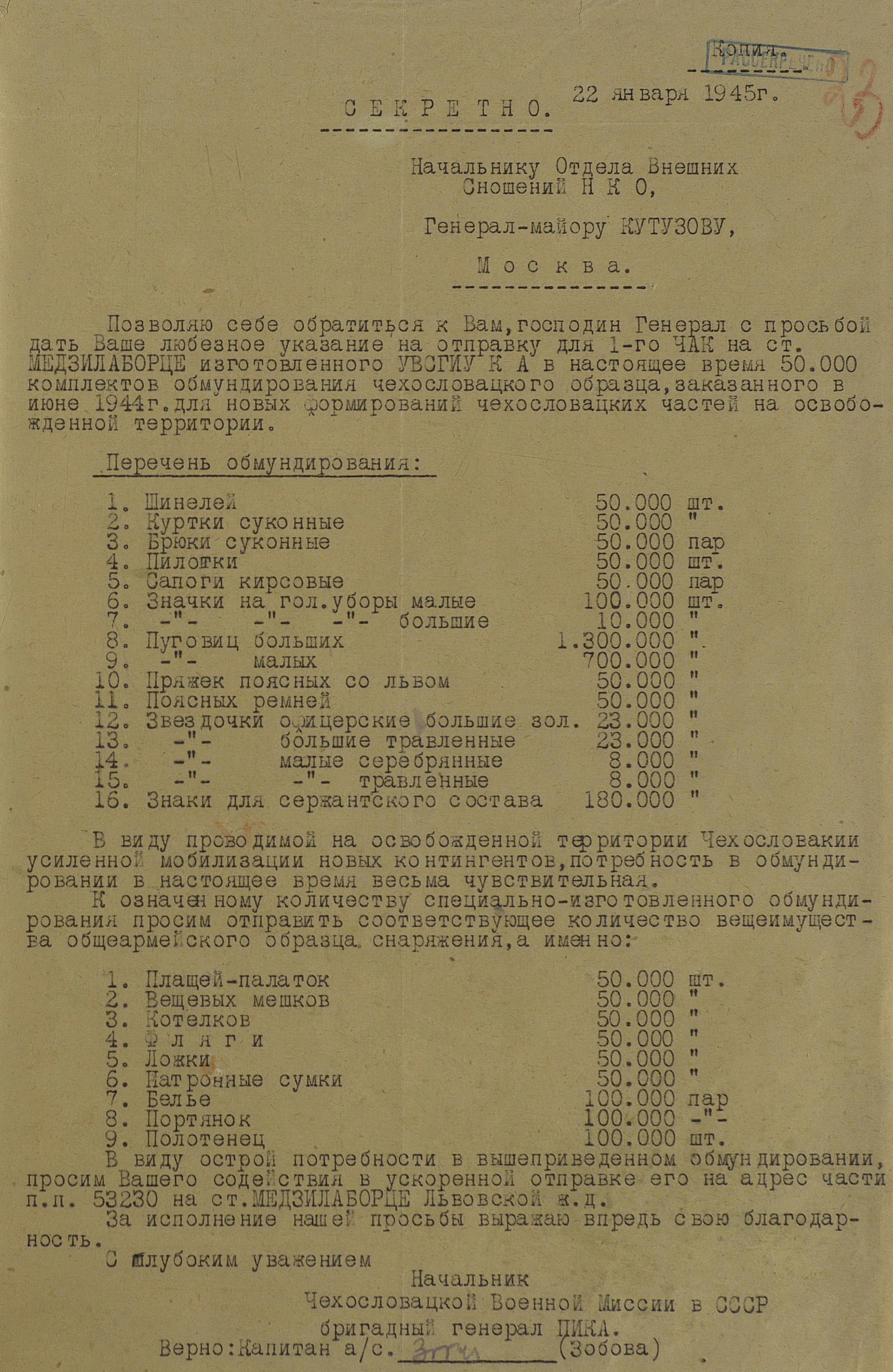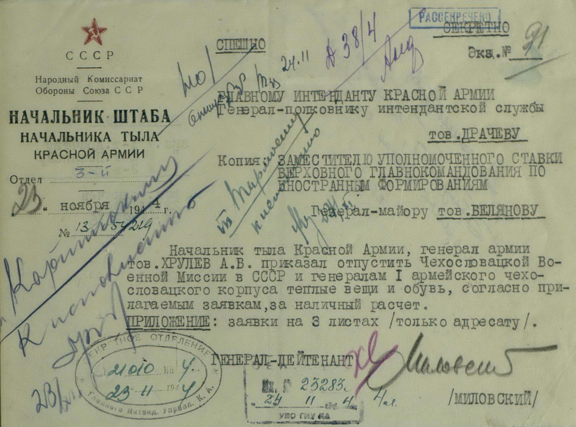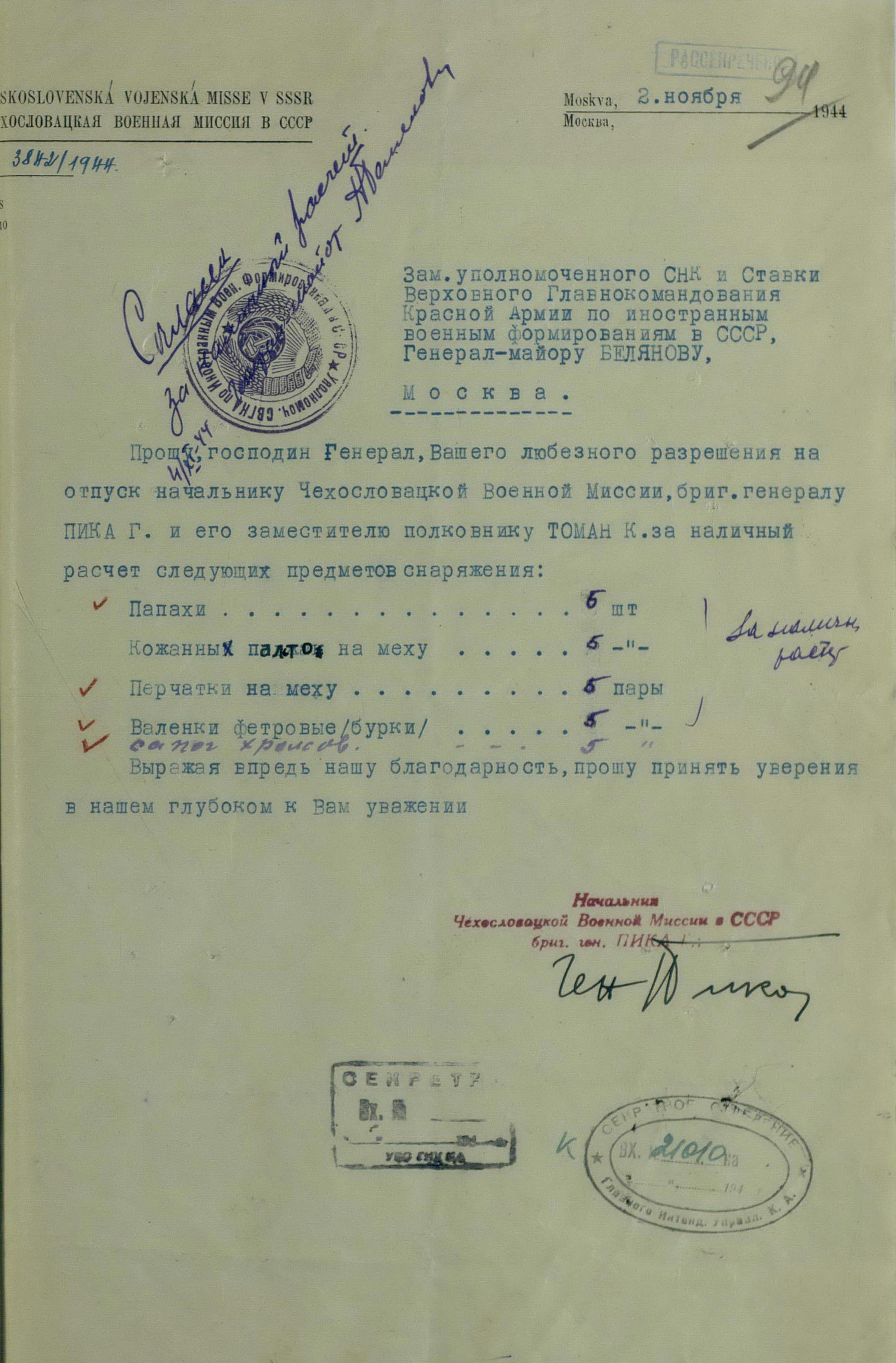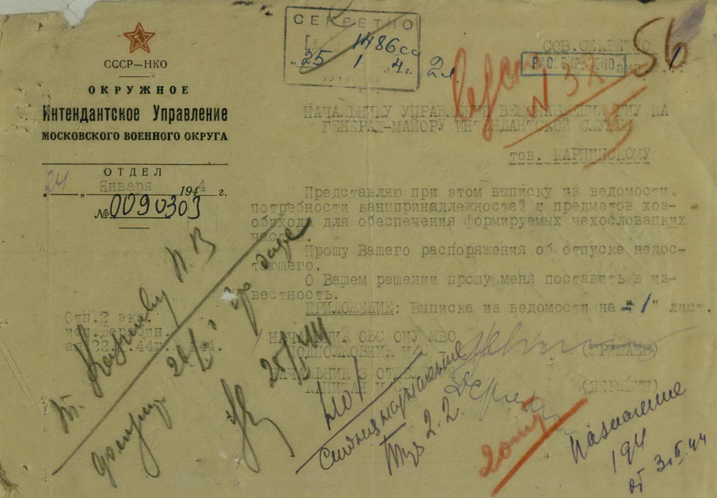 Но просьбы и пожелания о выдаче тех или иных предметов для генералов или миссий не была большой проблемой. Основную головную боль советским интендантам доставляли постоянные устные и письменные заявки на обеспечение войск. Командиры объединений и соединений присылали свои пожелания, без каких-либо обоснований численности, а ведь там счёт уже шел на тысячи, а то и десятки тысяч ппредметов. Бесспорно, для сражающихся войск всё это нужно, важно, особенно зимние вещи, вот только складывается впечатление, что заявки готовились с прицелом на будущее, на обеспечение ещё не существующей, но планируемой к созданию армии Чехословакии.