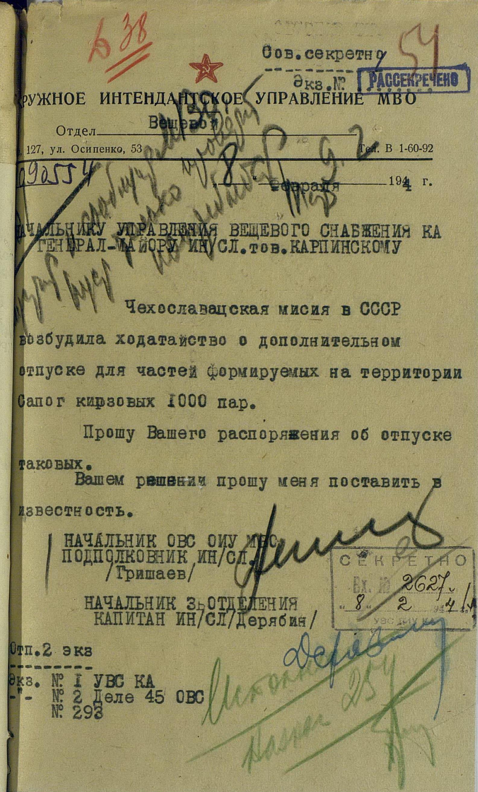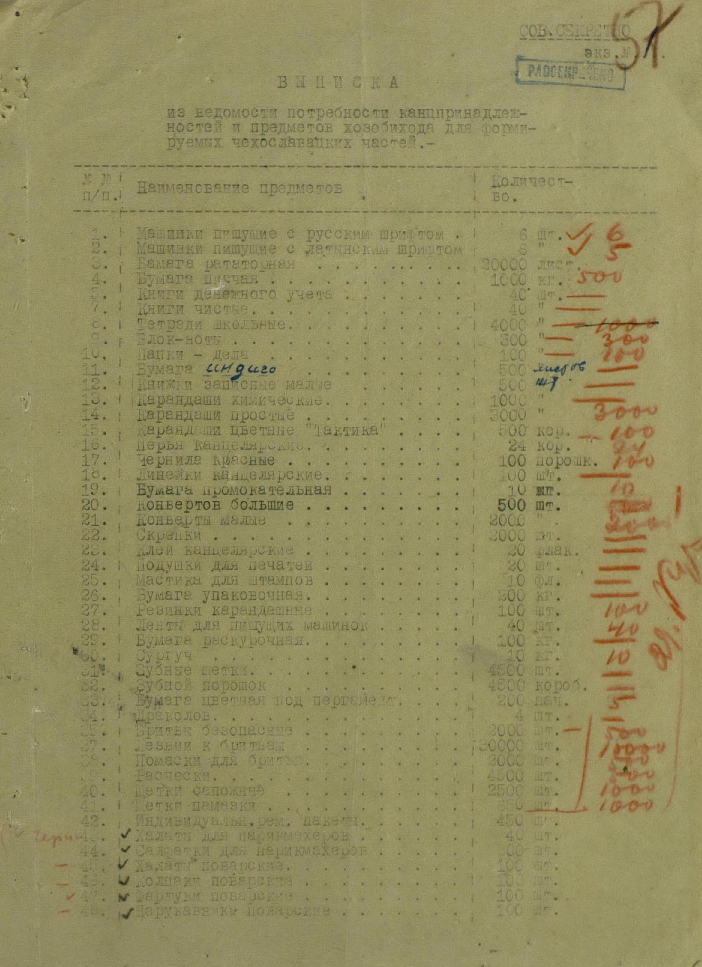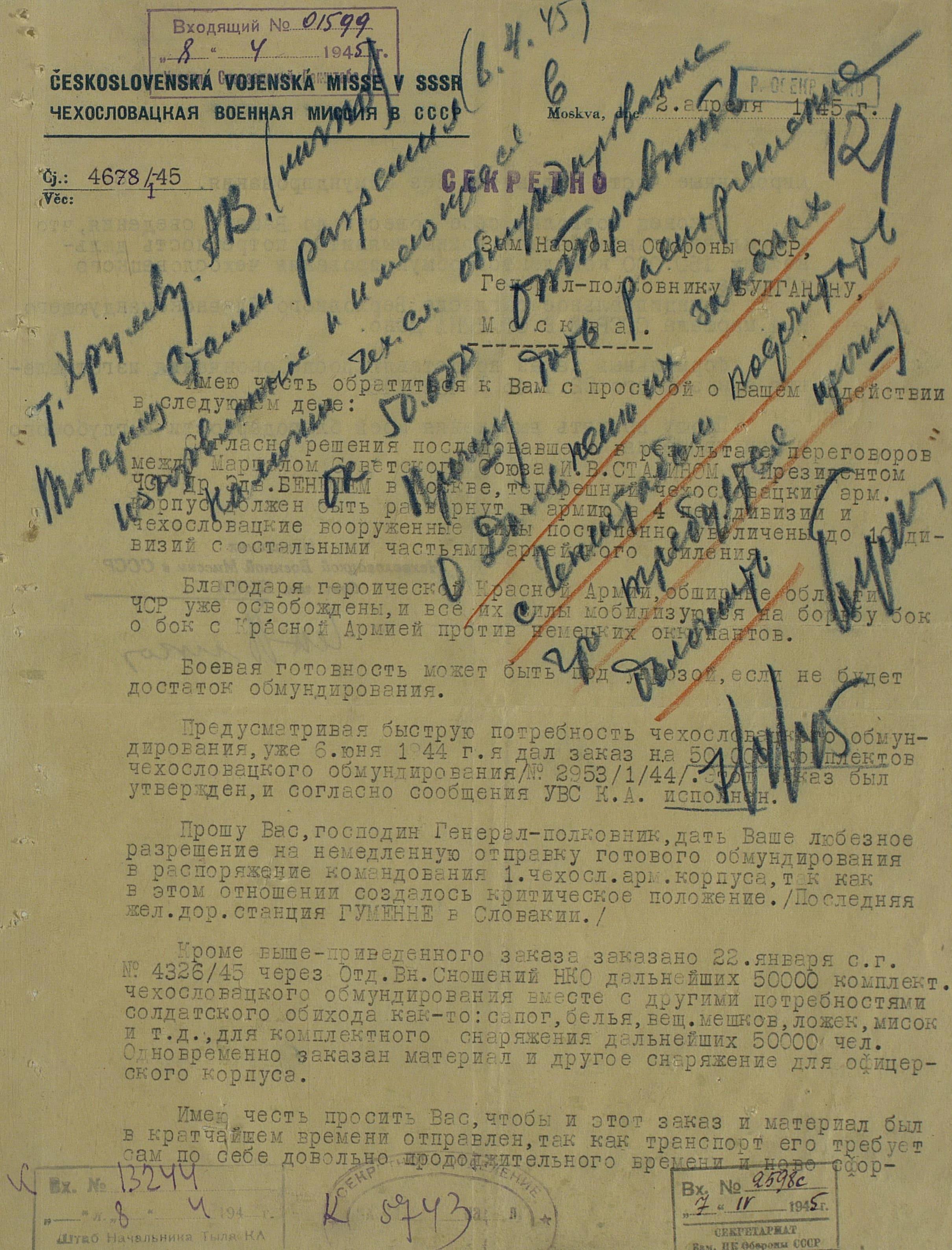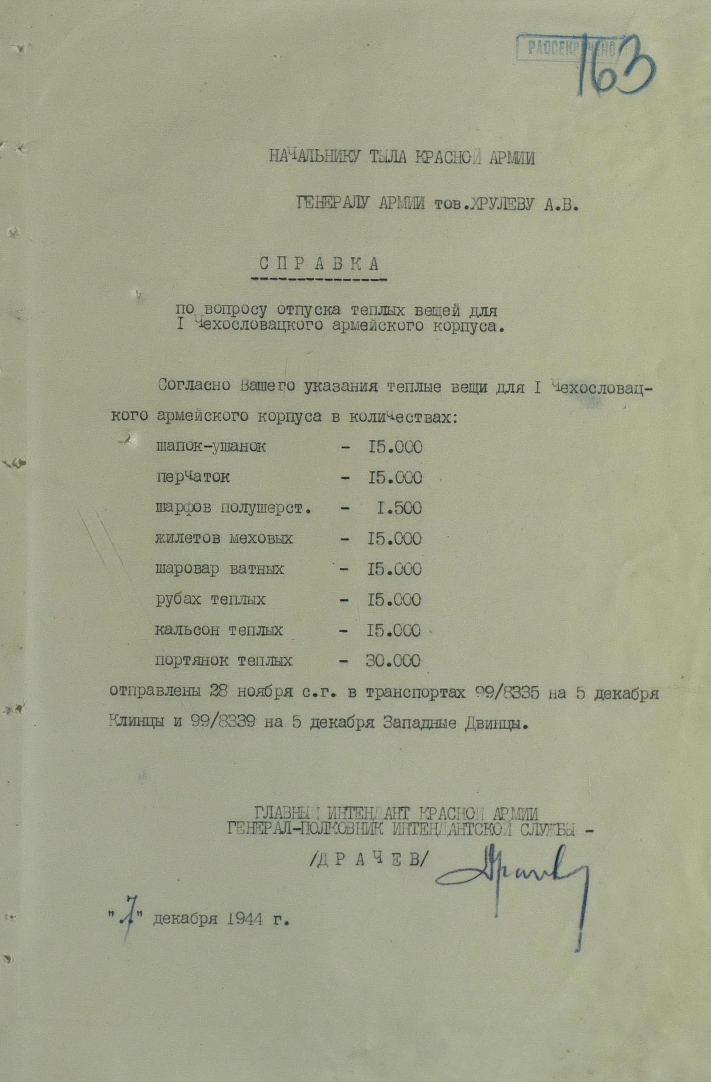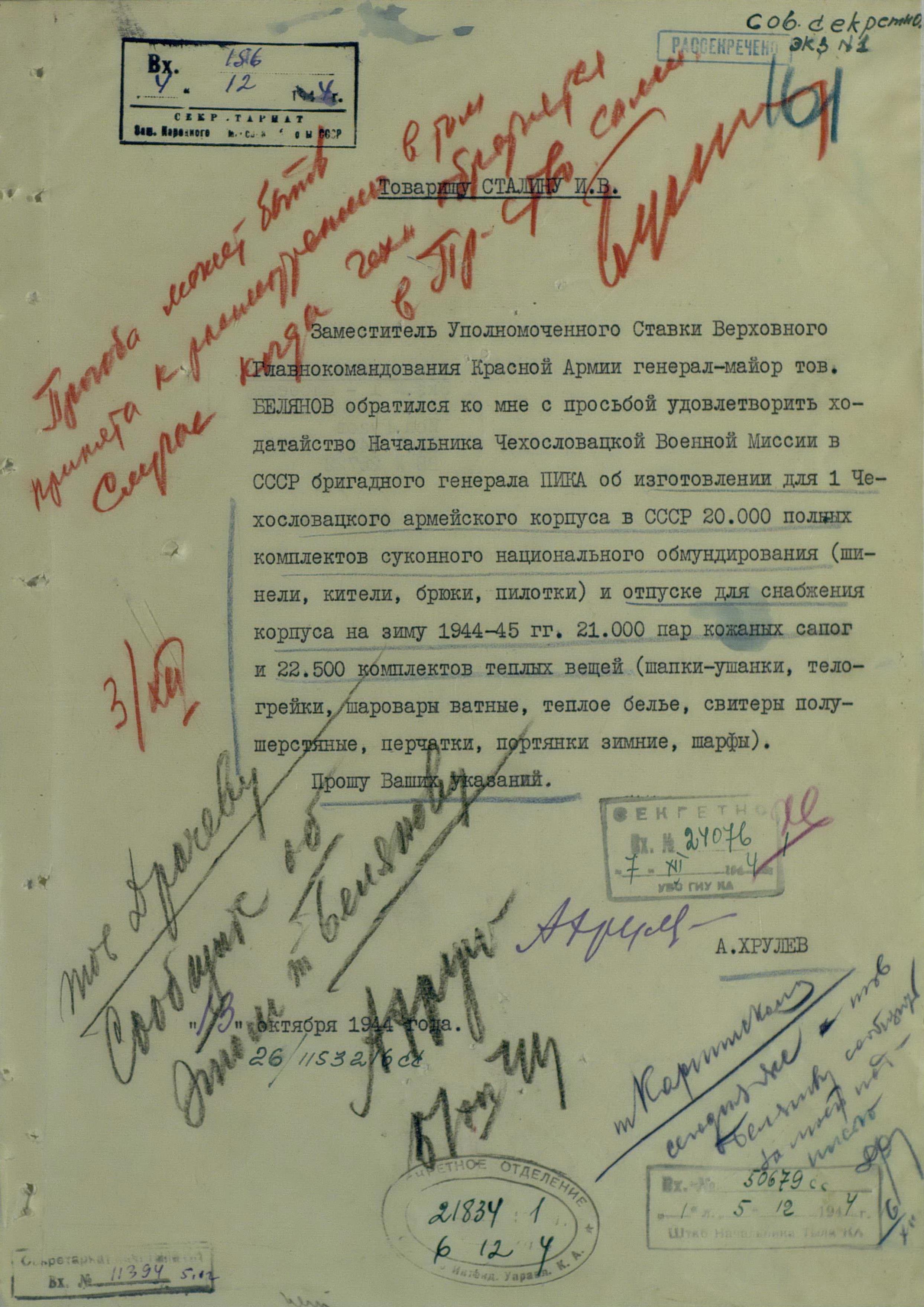 Но просьбы и пожелания о выдаче тех или иных предметов для генералов или миссий не была большой проблемой. Основную головную боль советским интендантам доставляли постоянные устные и письменные заявки на обеспечение войск. Командиры объединений и соединений присылали свои пожелания, без каких-либо обоснований численности, а ведь там счёт уже шел на тысячи, а то и десятки тысяч ппредметов. Бесспорно, для сражающихся войск всё это нужно, важно, особенно зимние вещи, вот только складывается впечатление, что заявки готовились с прицелом на будущее, на обеспечение ещё не существующей, но планируемой к созданию армии Чехословакии.