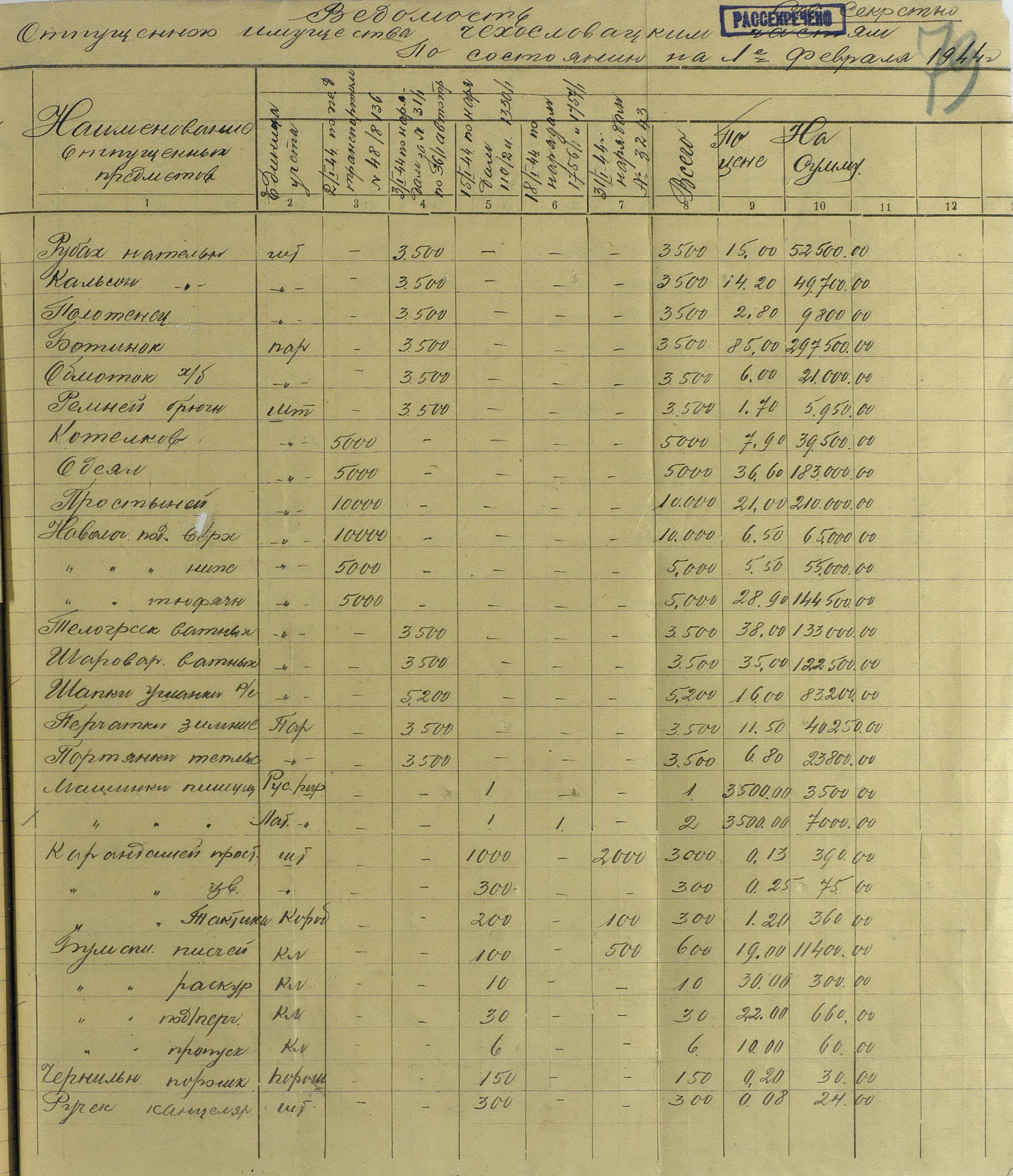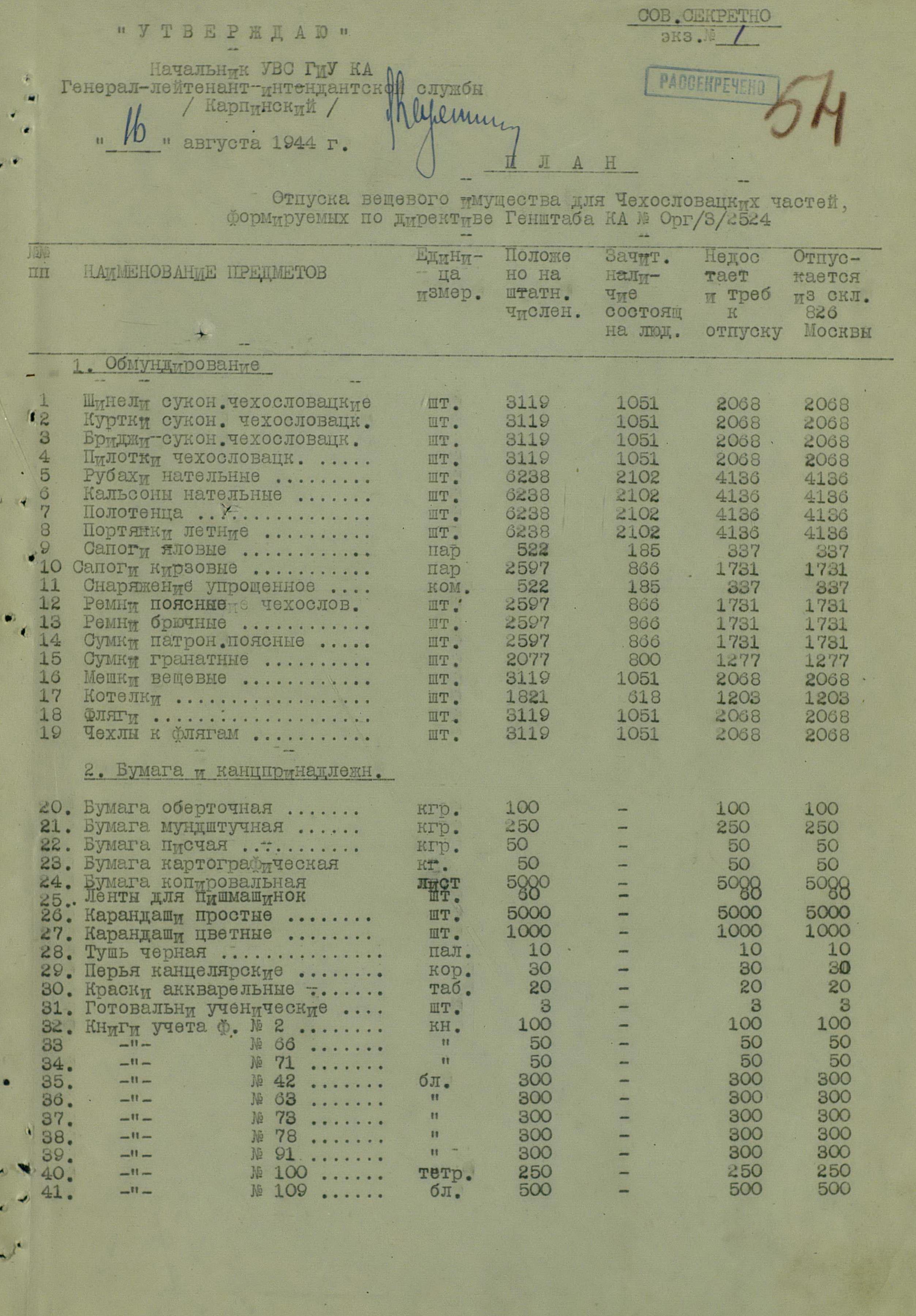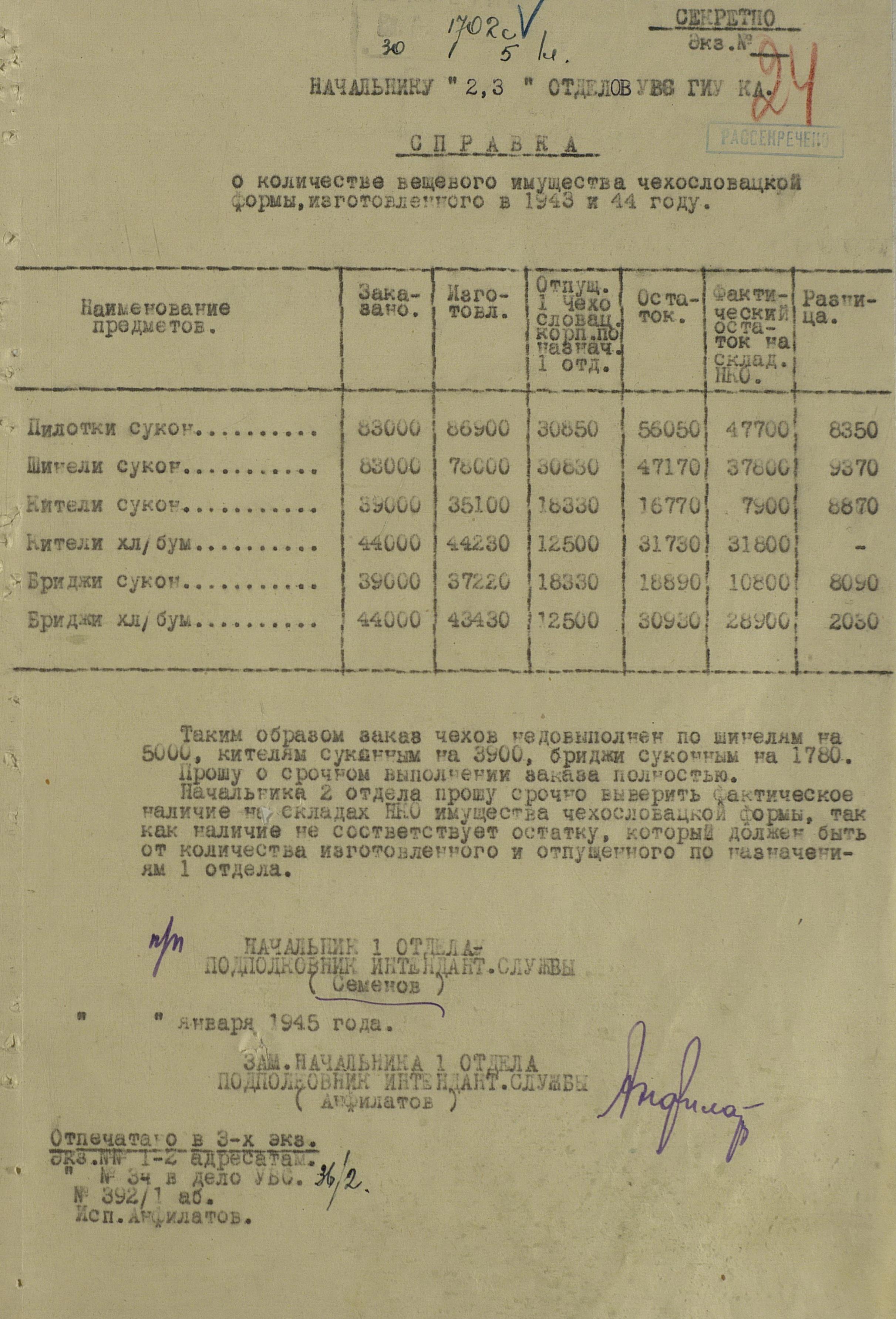 Не менее интересны и сведения о количестве вещевого имущества, заказанного и поставленного чехословацким частям в 1943 – 1944 г.г. Корпус заказал для себя 83 тысячи комплектов национальной формы. Либо это была штатная численность, либо, и это скорее всего – в заявку вошли плановые цифры, в расчёте на то, что часть военнопленных согласится перейти в состав чехословацких частей. Во-всяком случае, пишут, что 2-я воздушно-десантная бригада комплектовалась солдатами 1-й словацкой пехотной дивизии, сдавшихся Красной Армии под Мелитополем и перешедших на нашу сторону. В итоге, корпус забрал себе около 31 тысячи комплектов, то есть это и была примерная списочная численность, хотя скорее всего и она была меньше. Какой – никакой запас тоже нужен. Но, не удивлюсь, если увижу данные, что летом 1944 года корпус насчитывал 83 тысячи человек. Почему тогда интенданты настаивают на скорейшем выпуске недостающего? Так справка подготовлена в январе 1945 года, так что это имущество предназначено для граждан Чехословакии, активно призываемым в состав корпуса по мобилизации. И что интересно: если прямой призыв советских граждан командирами воинских частей Красной Армии (минуя военкоматы) некоторыми либеральными историками осуждается довольно давно (так называемые «чернопиджачники» или «черносвитники»), то про точно такой же формат, принятый на вооружение офицерами чехословацких, польских или румынских частей никакого негатива не вызывает.