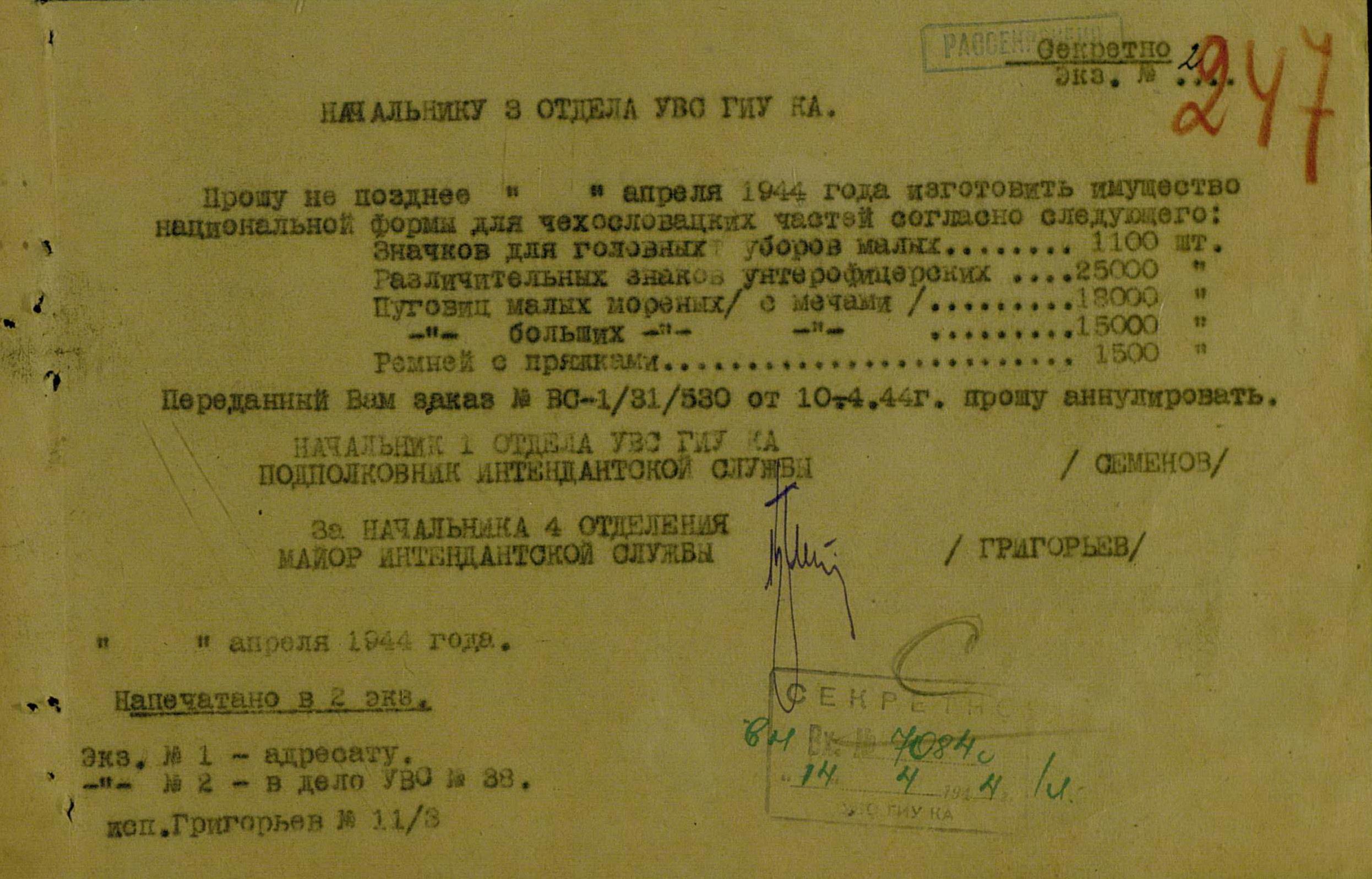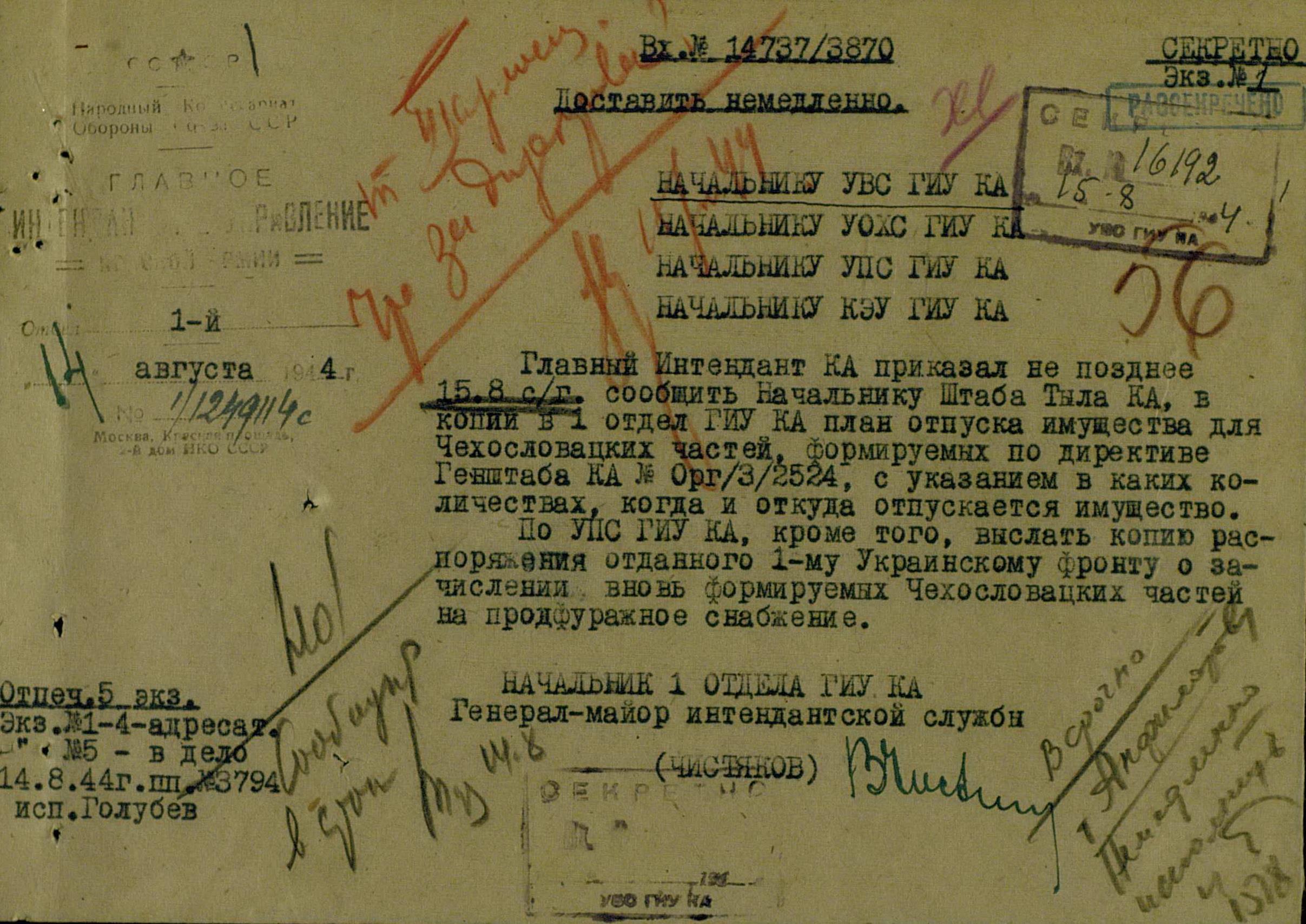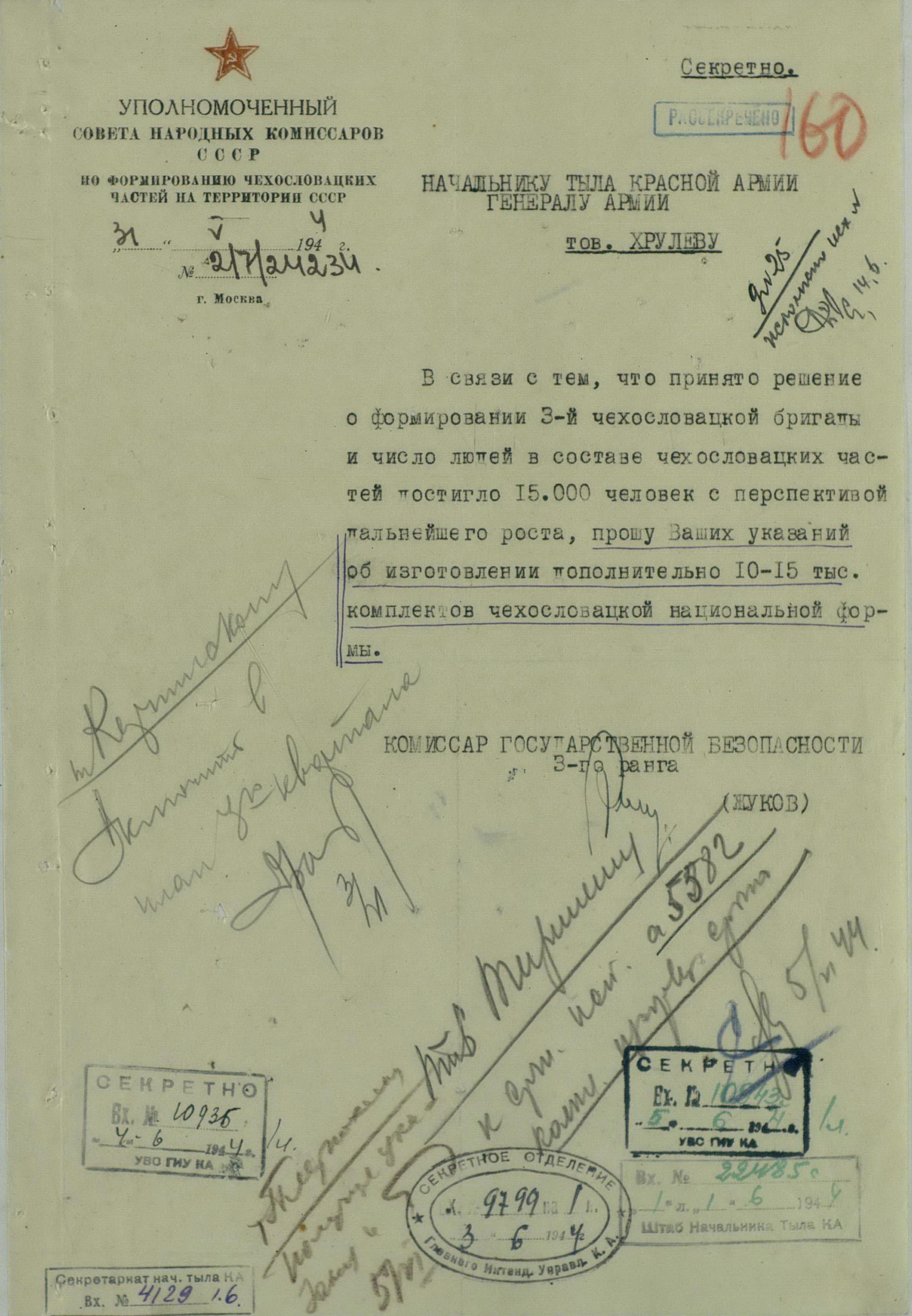 Всё бы хорошо, только директива Генерального штаба Красной Армии о создании 3-й отдельной пехотной чехословацкой бригады была издана 19 мая 1944 г., и срок окончания формирования был установлен 15 июня. А в документах интендантов он начинает фигурировать только с осени 1944 г. При том, что активное снабжение вновь формируемых частей и подразделений началось в конце мая.