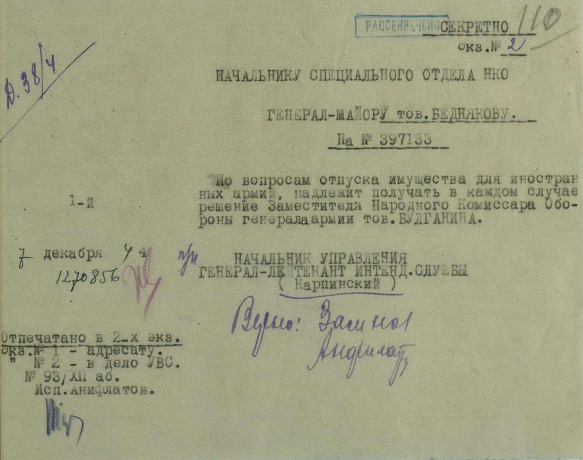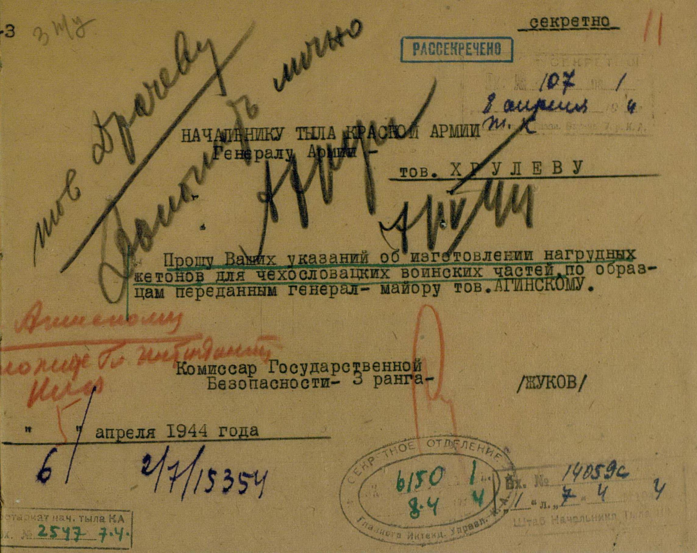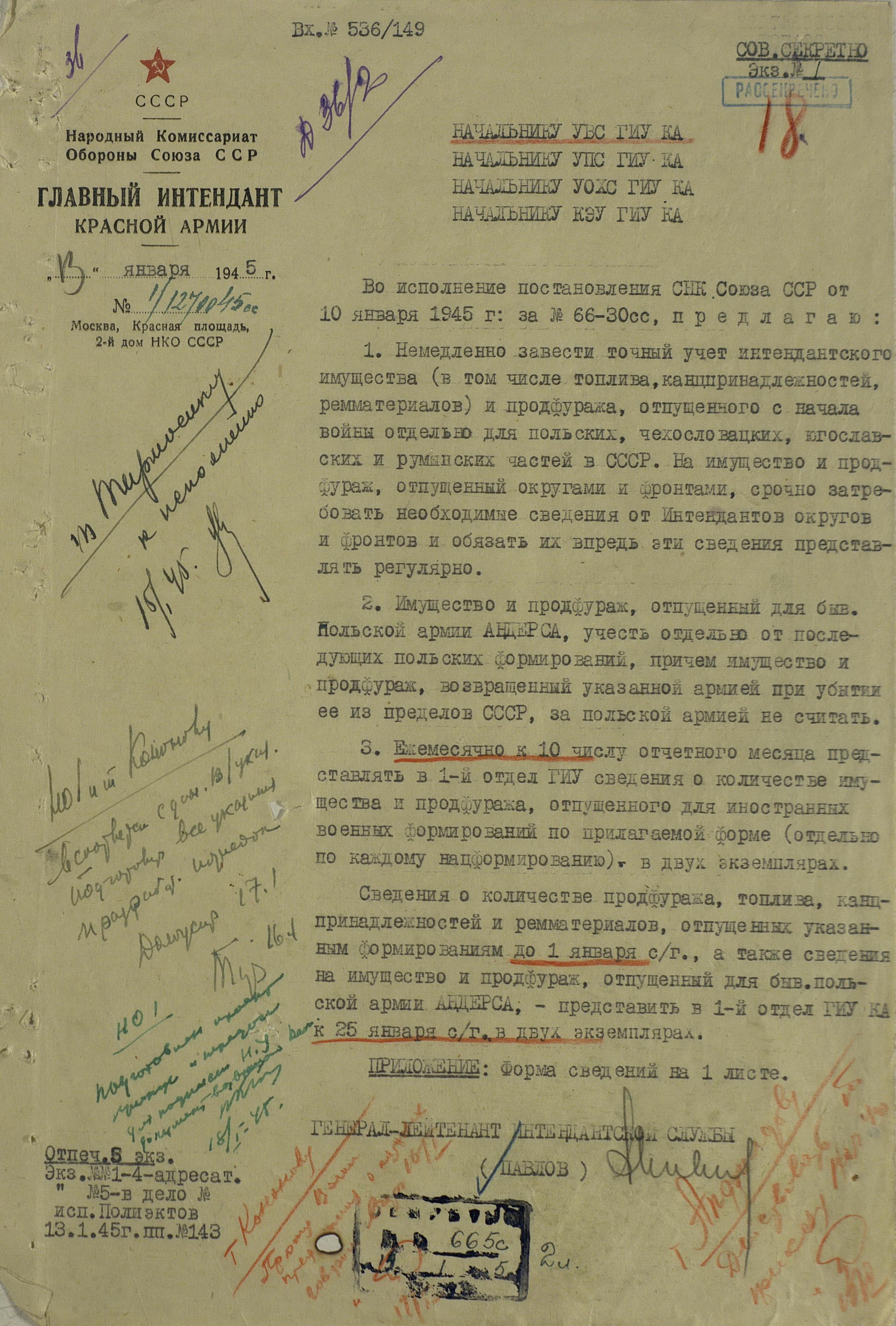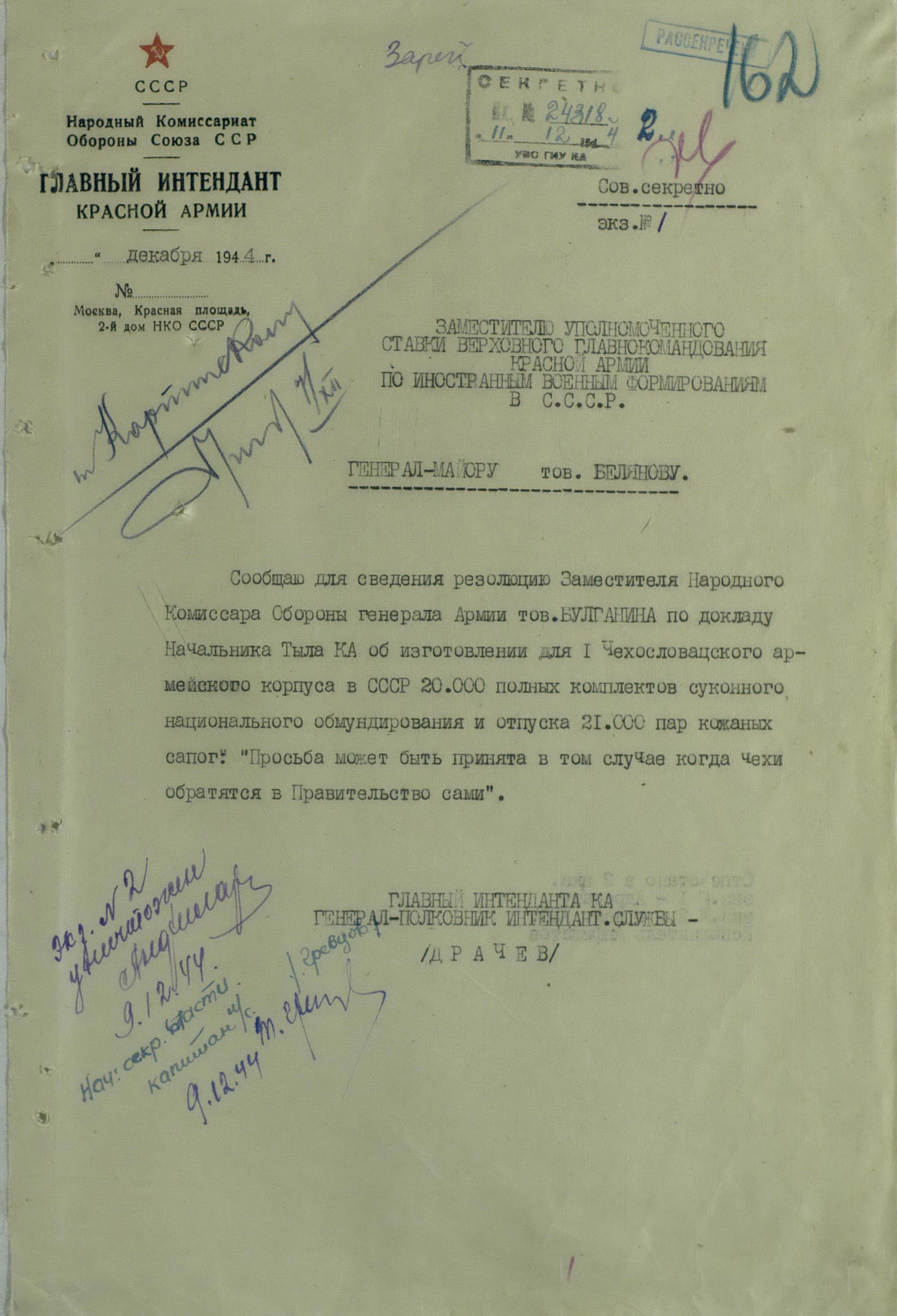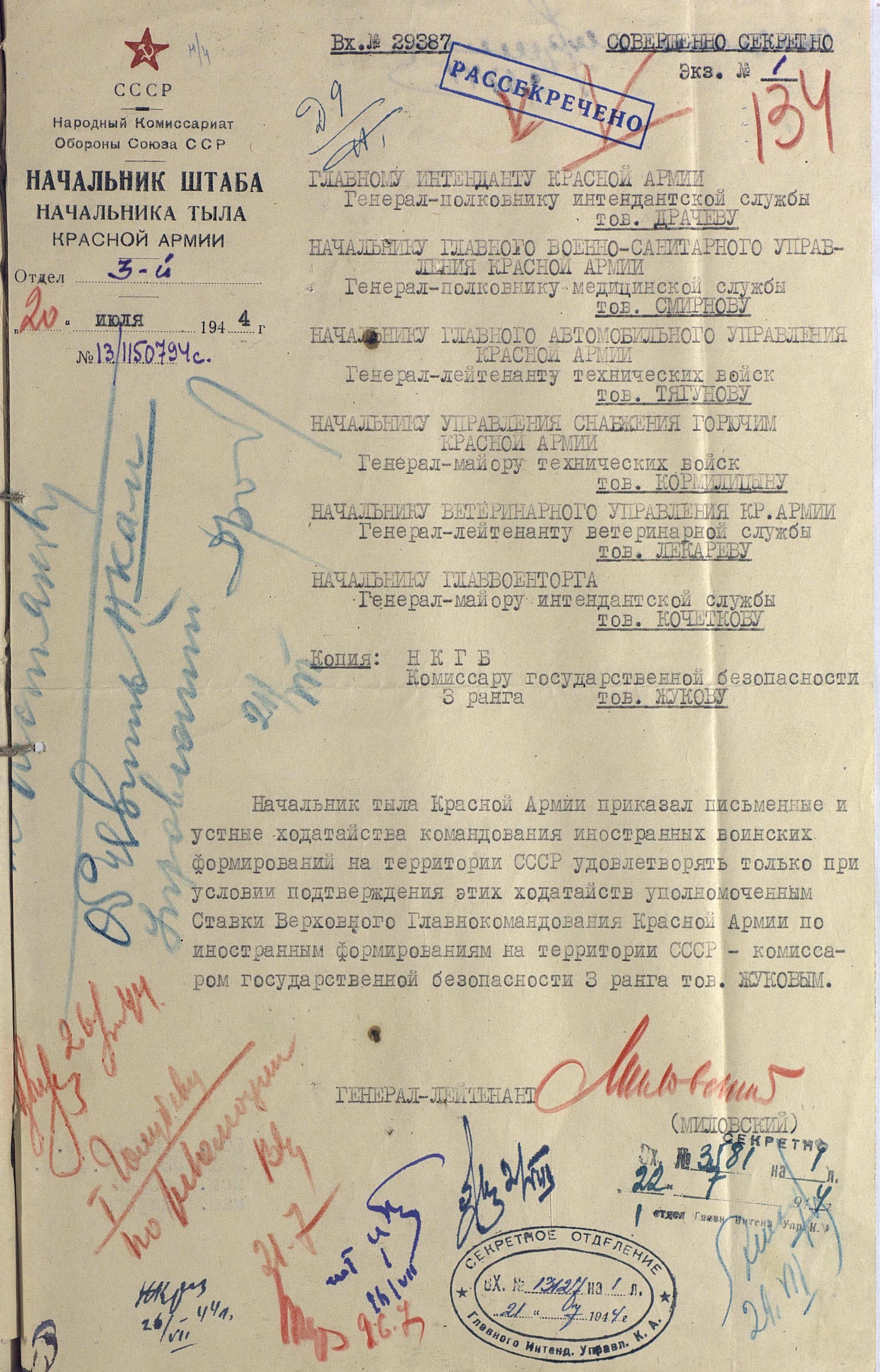 В конечном итоге, было принято решение, что все заявки от представителей иностранных формирований будут обеспечены только после того, как их рассмотрит заместитель Наркома обороны генерал армии Н.А. Булганин. По всей видимости, принятое в июле 1944 года решение, об удовлетворении устных и письменных ходатайств командования иностранных формирований при условии подтверждения их уполномоченным Ставки ВГК комиссаром госбезопасности 3 ранга тов. Жуковым не только не упорядочило снабжение иностранцев, сократив переписку, а скорее привело к обратному: вседозволенности и потаканию любым пожеланиям поляков, чехов, румын.