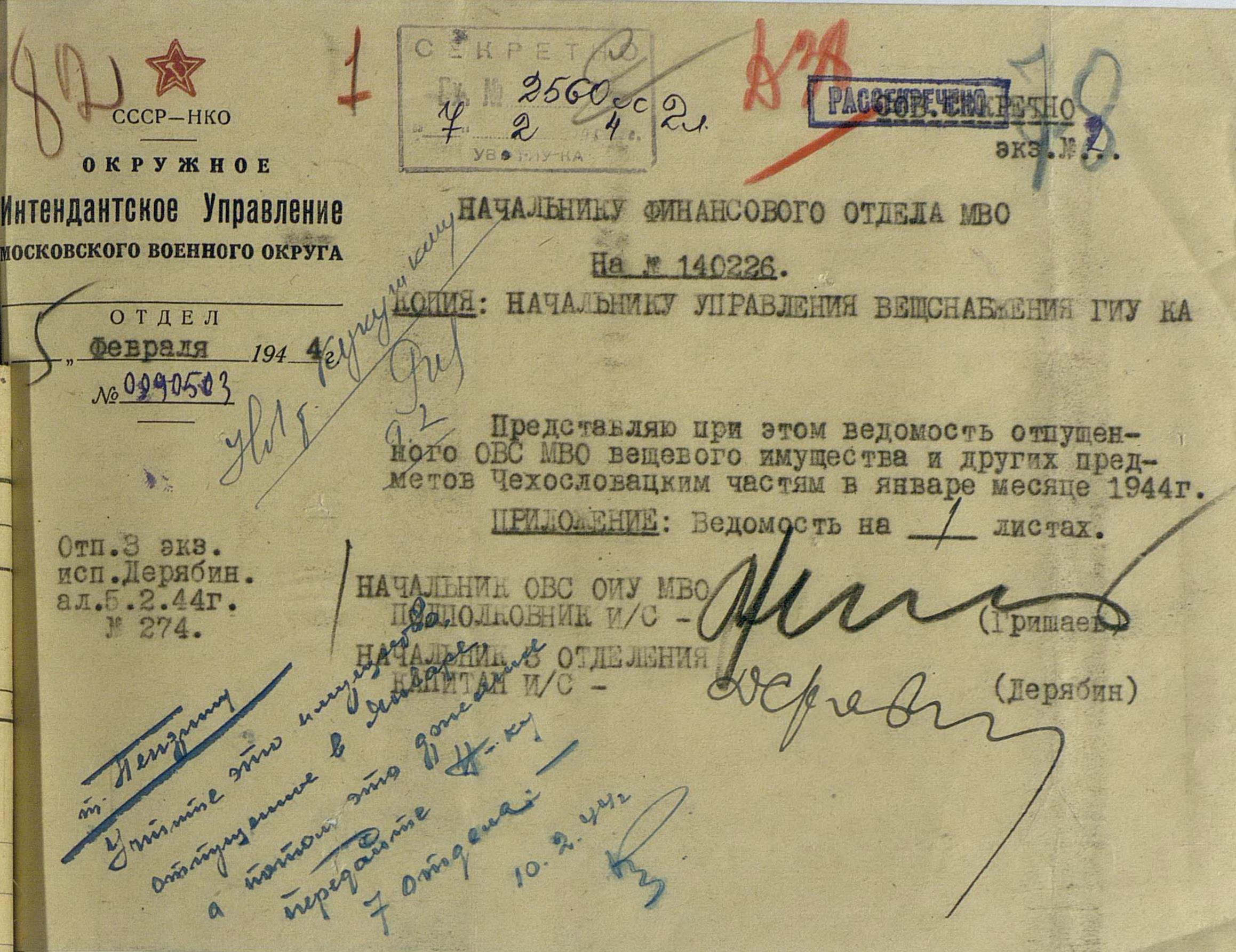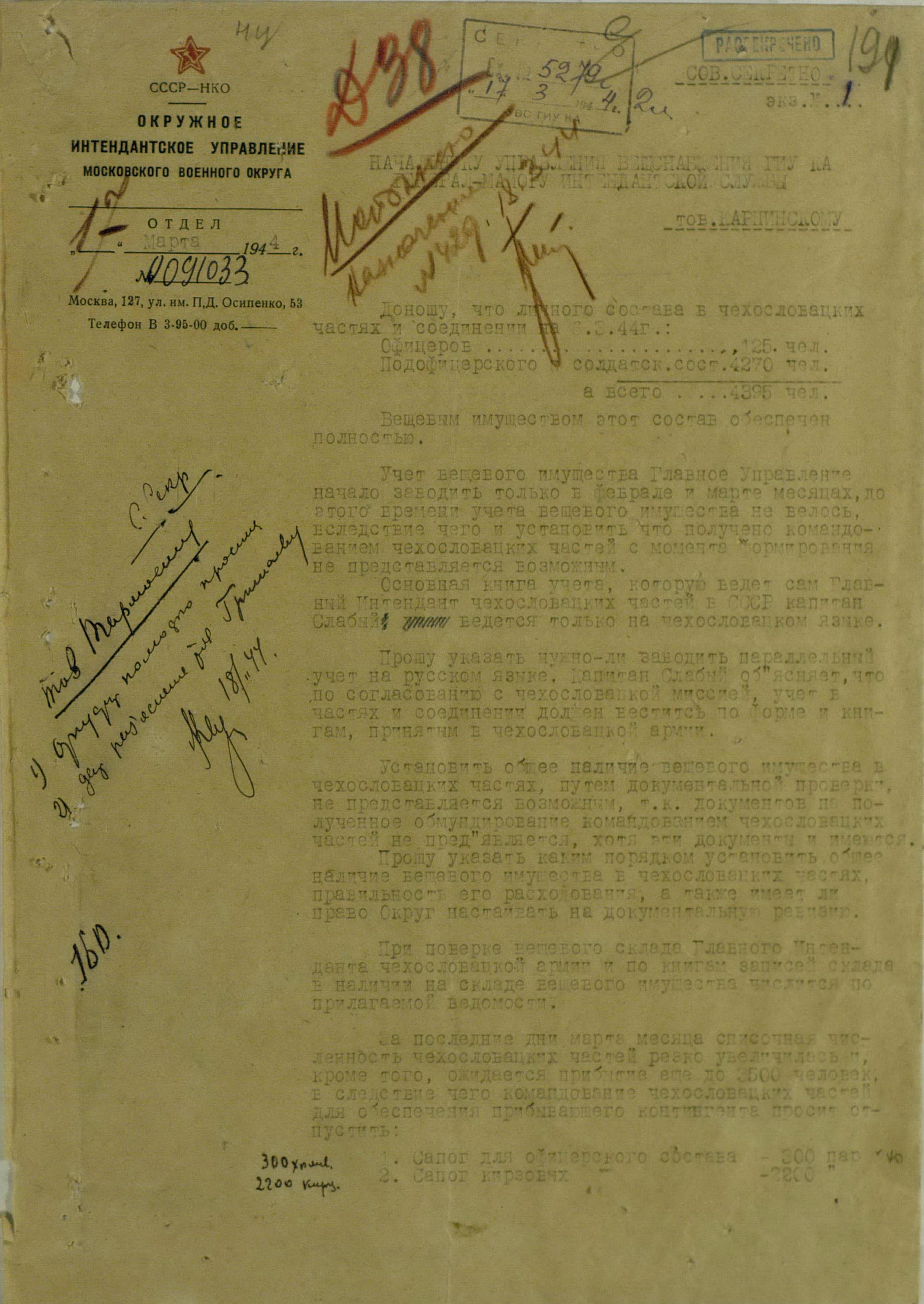 Это подтверждается и докладом, представленным начальником вещевой службы МВО подполковником и/с Владимиром Ефимовичем Гришаевым. По состоянию на 6 марта 1944 г., общая численность личного состава в чехословацких частях составляла 4 395 человек, в том числе 125 офицеров. С учётом санитарных и безвозвратных потерь, эти данные вполне коррелируются с количеством ранее отпущенного вещевого имущества. Правда, они не учитывают численность 2-й чехословацкой воздушно-десантной бригады. Пишут, что в это время она ещё проходила обучение, и знамя ей вручили только 17 апреля 1944 г. При этом штатная численность десантников составляла около 2700 военнослужащих. Точнее можно будет узнать, подняв переписку с Главупраформом Красной Армии, на сегодняшний день копий этих документов у меня нет. Равно как нет и документов проверок чехословацких частей. Но, это уже не моё упущение. Похоже, что попытка подполковника и/с В.Е. Гришаева провести ревизию закончилась ничем и в последующем чехословацкое командование приняло меры по недопущению представителей Красной Армии до инспектирования. Ведь союзнику надо верить на слово.
