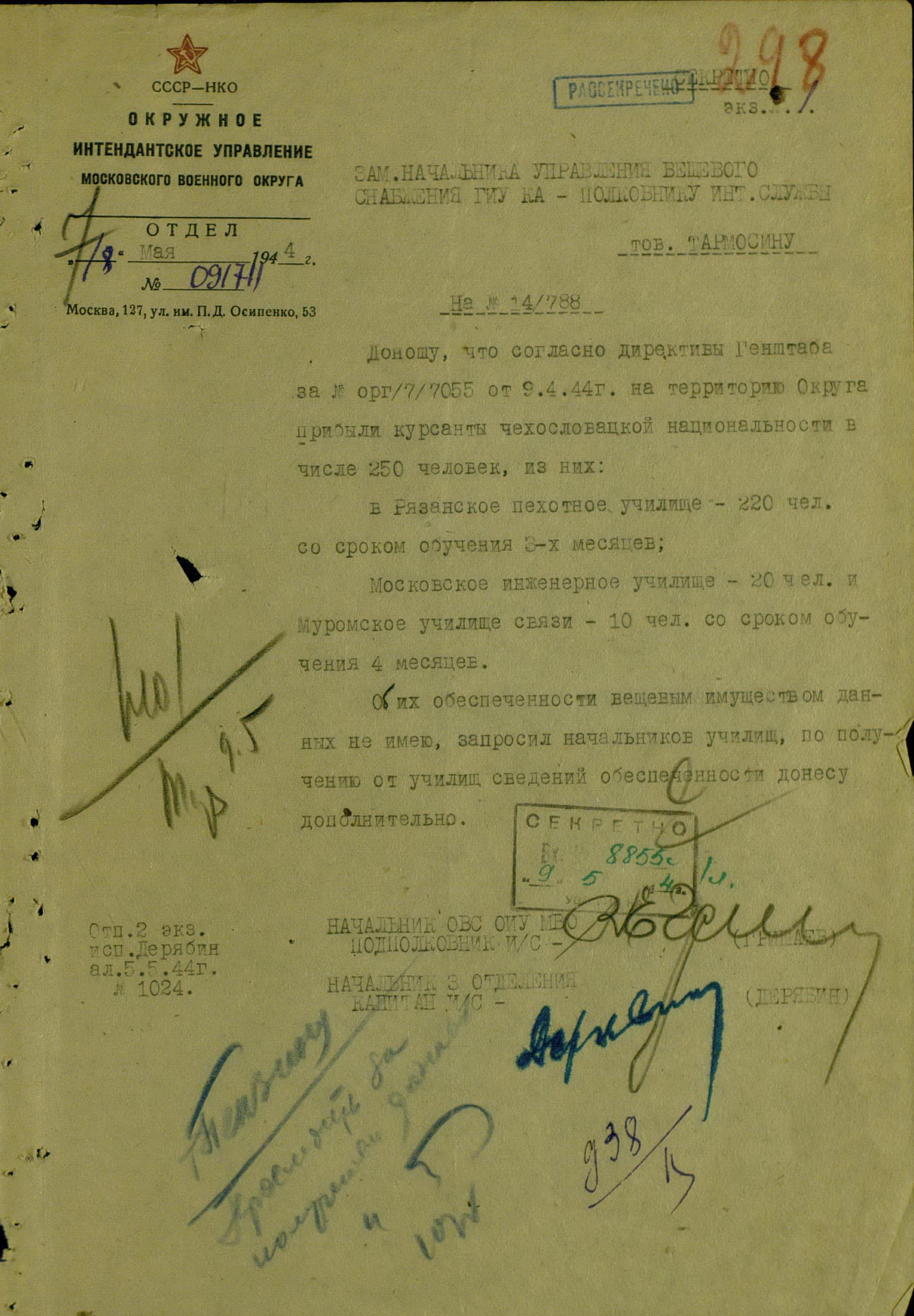 Готовил Советский Союз и офицеров для чехословацких частей. В апреле 1944 года, 250 курсантов «чехословацкой национальности» были зачислены в три учебных заведения: Рязанское пехотное и Московское инженерное училища, а также в Муромское училище связи.