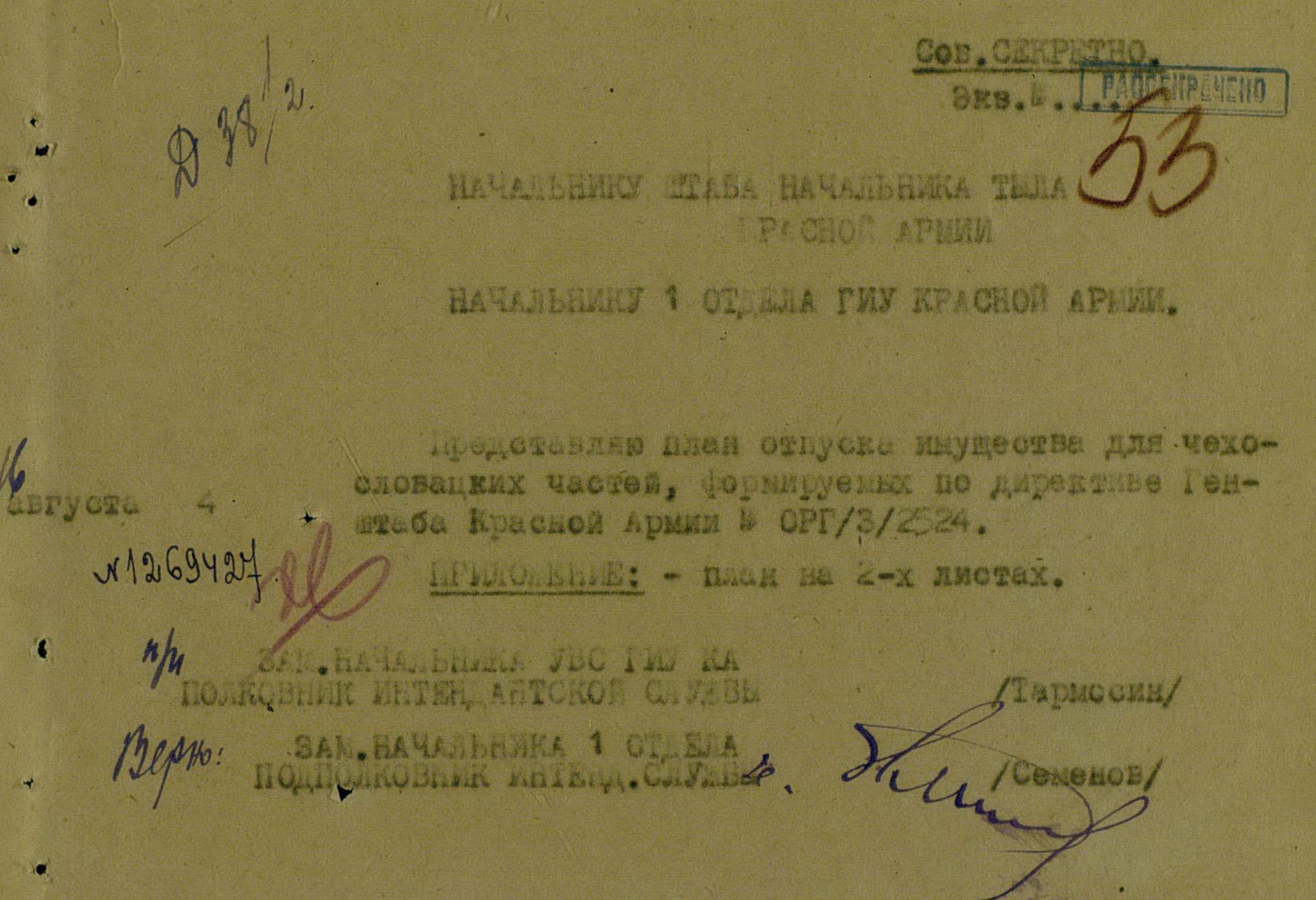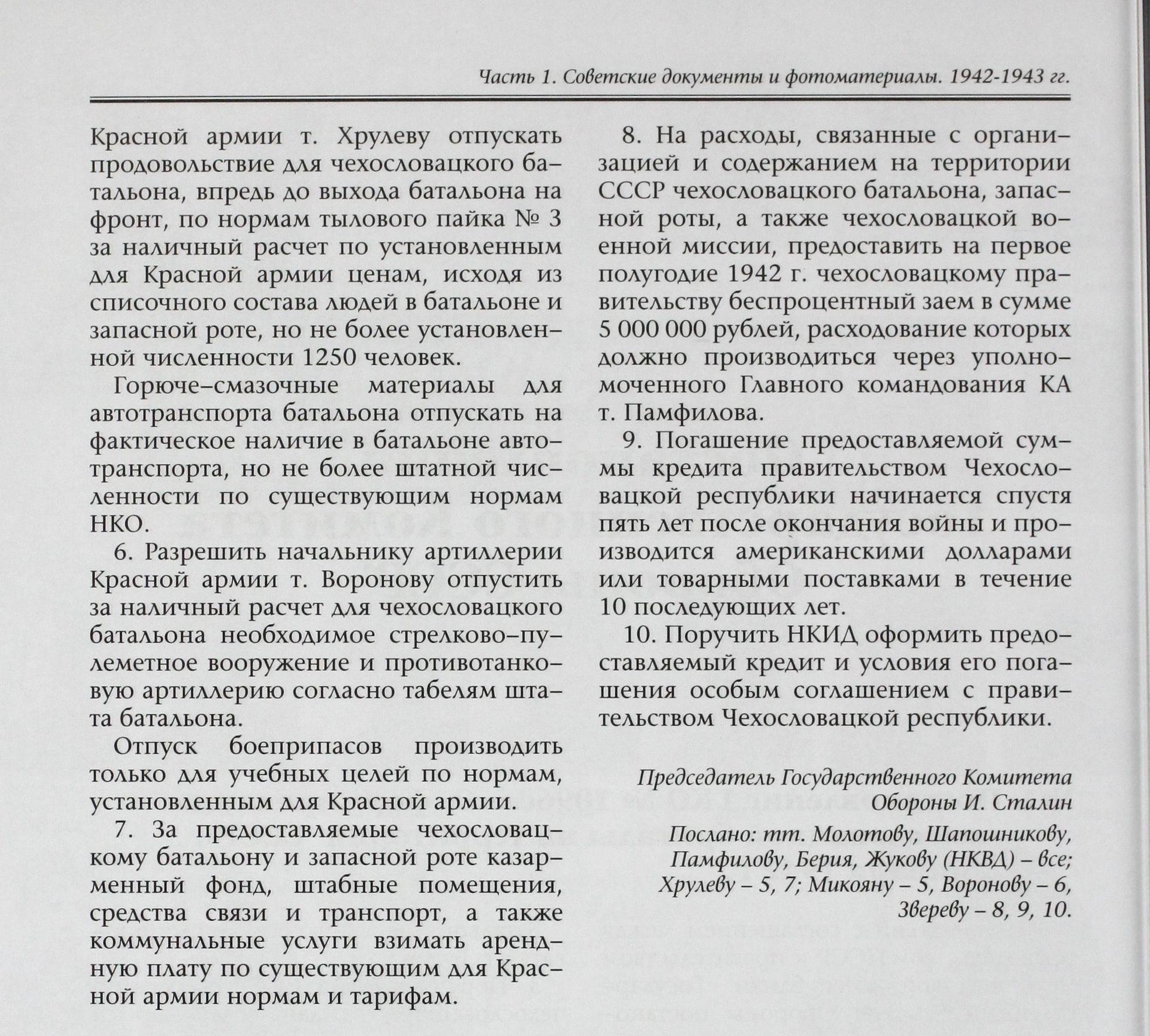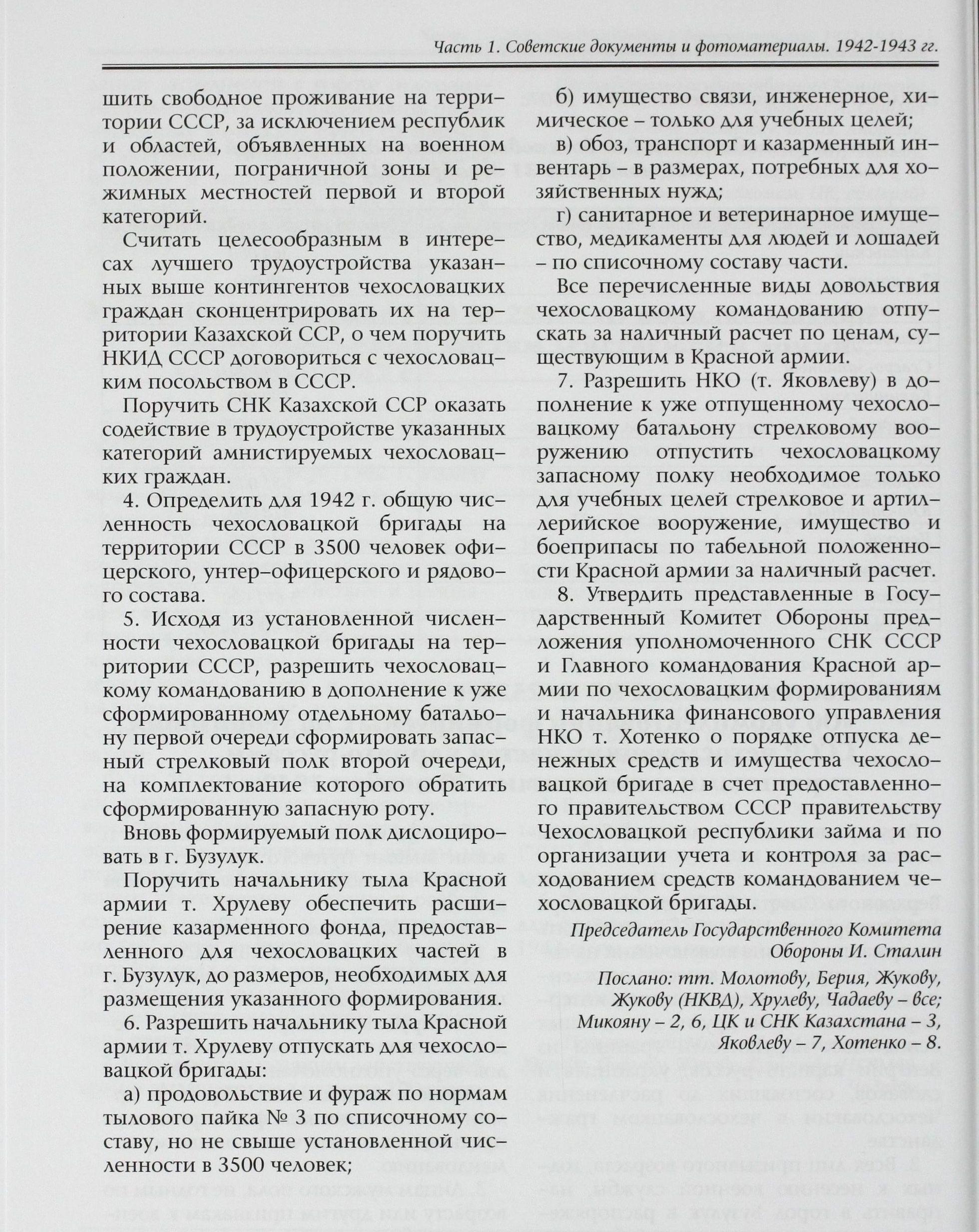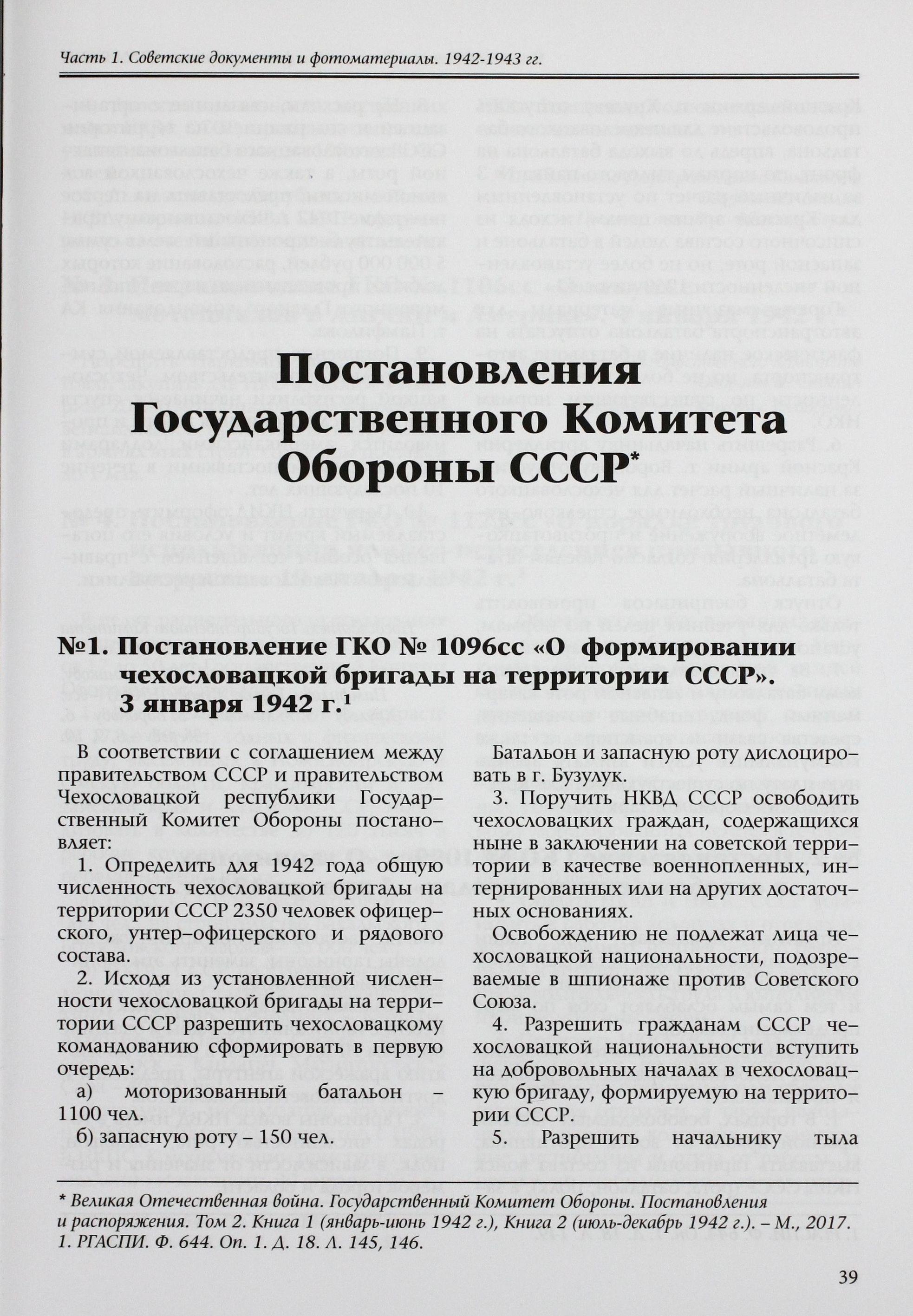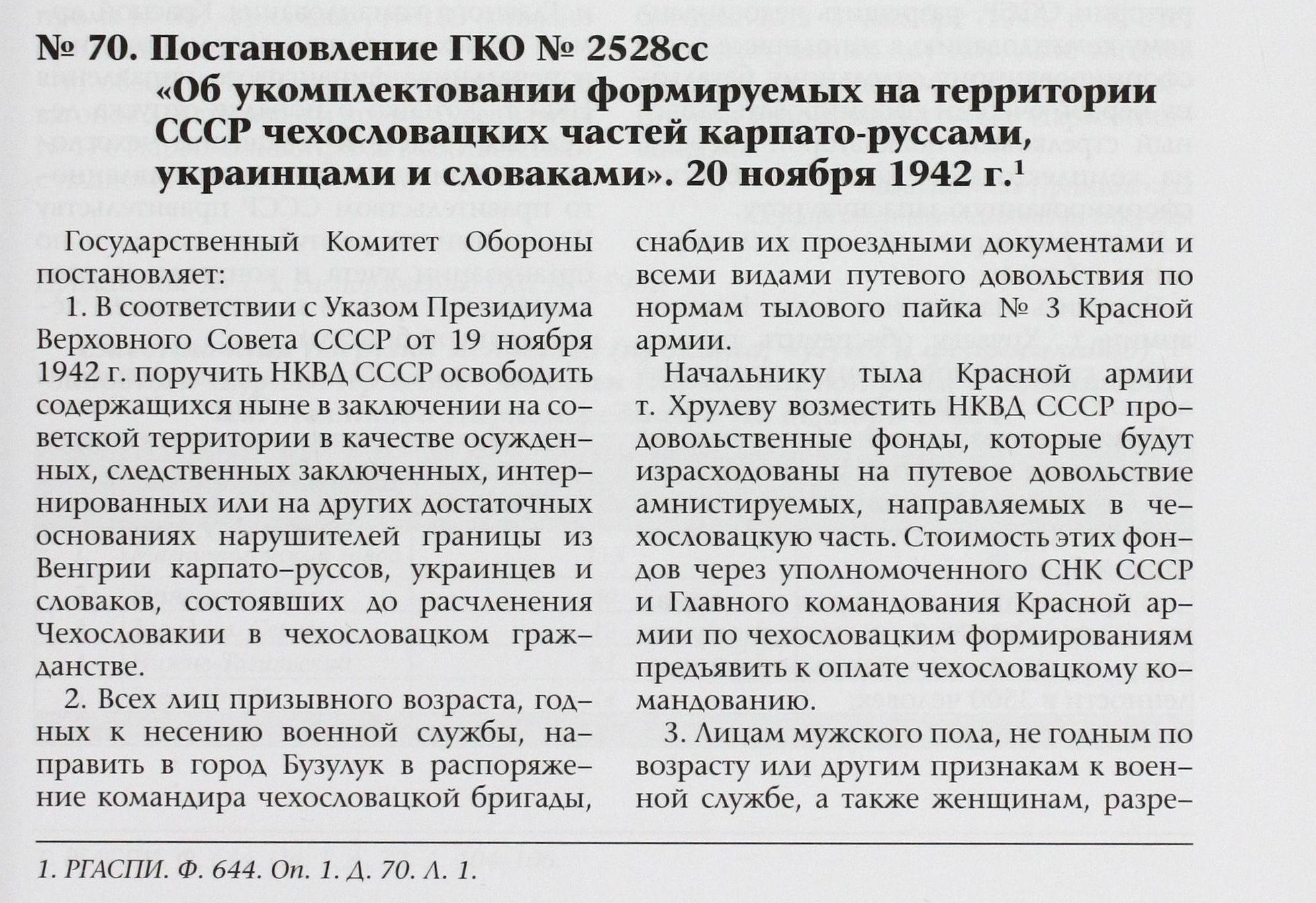 Как известно, на основе подписанного в июле 1941 г., с находившимся в Лондоне эмигрантским правительством Чехословакии Э. Бенешем, соглашения о военном сотрудничестве, с 5 января 1942 г., в г. Бузулуке начал формирование и обучение 1-й отдельный чехословацкий пехотный батальон, под командованием подполковника Л. Свободы. Постановлением ГКО от 3.01.1942 г. № 1096сс «О формировании чехословацкой бригады на территории СССР» была определена её численность (2350 человек офицерского, унтер-офицерского и рядового состава), а также порядок комплектования. Призыву в национальное формирование подлежали не только граждане СССР чехословацкой национальности, решившие добровольно вступить в чехословацкую бригаду, но даже военнопленные, интернированные и осуждённые граждане Чехословакии, за исключением подозреваемых в шпионаже против СССР.