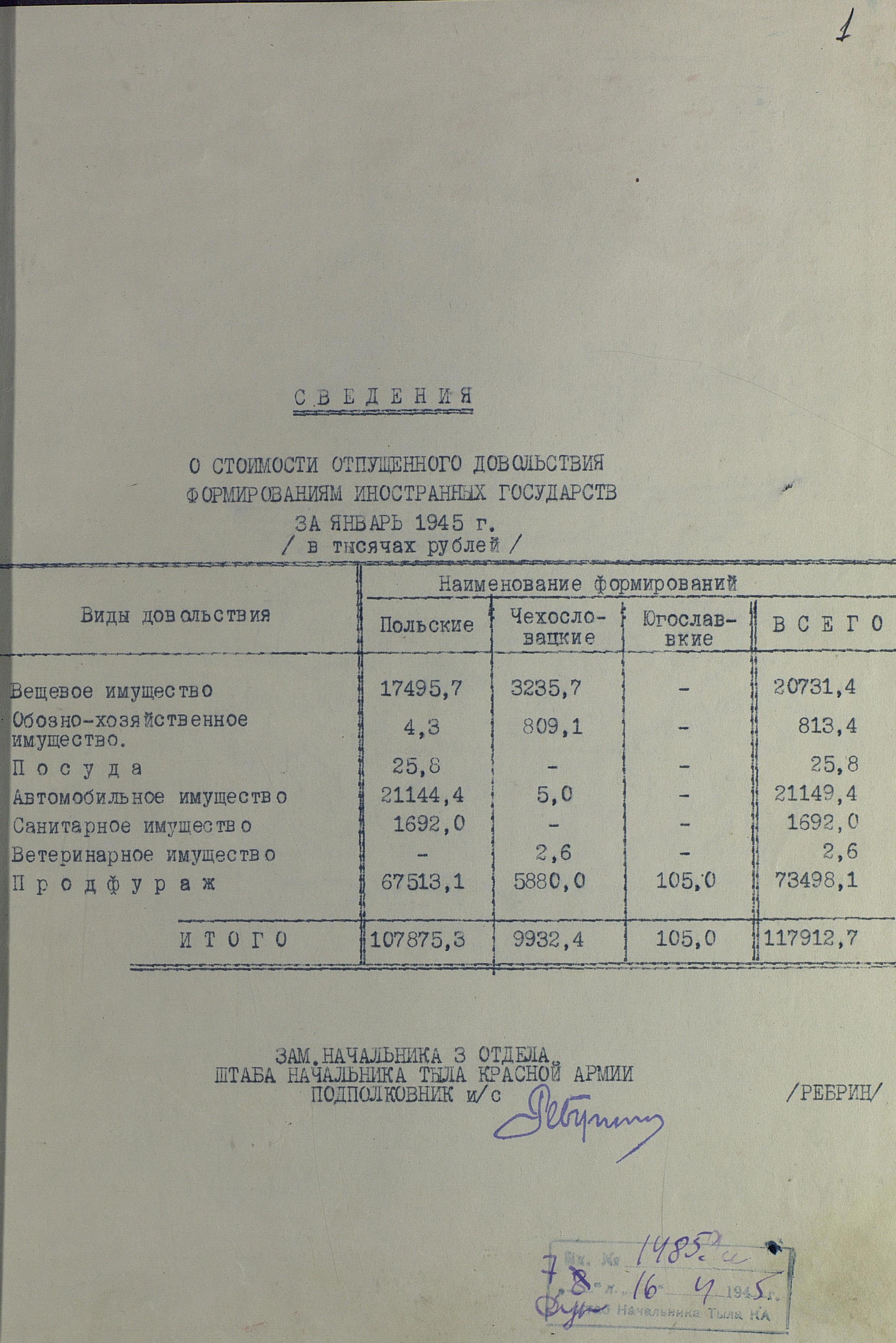И в заключение, буквально пара документов из сводных сведений об отпущенном довольствии формированиям иностранных государств. Официально эти сведения начали вести только с января 1945 г., во исполнении постановления СНК СССР от 10 января 1945 г. № 66-30 сс, а неофициально – вели с самого начала формирования тех или иных иностранных частей и соединений. Мне удалось найти эти данные по сентябрь 1945 года, и если вам, уважаемые читатели, эта тема интересна, то могу выложить и их.