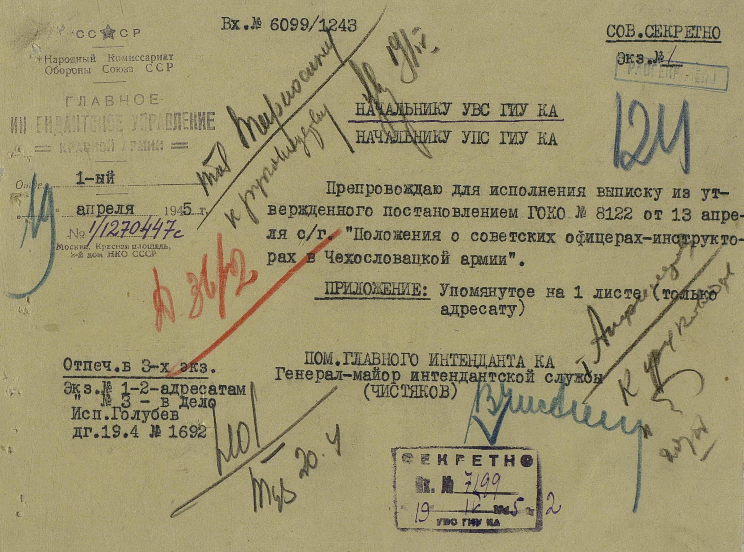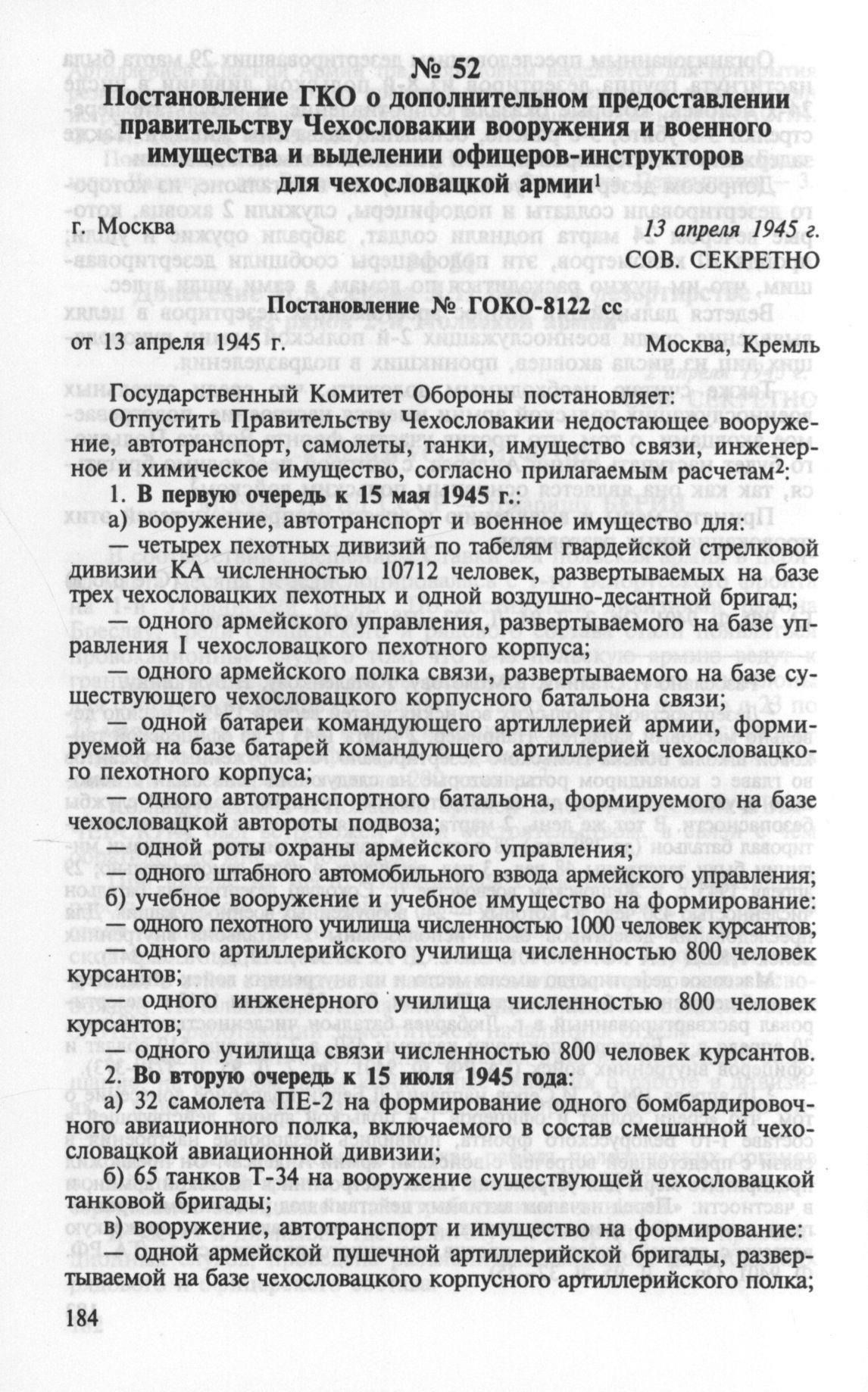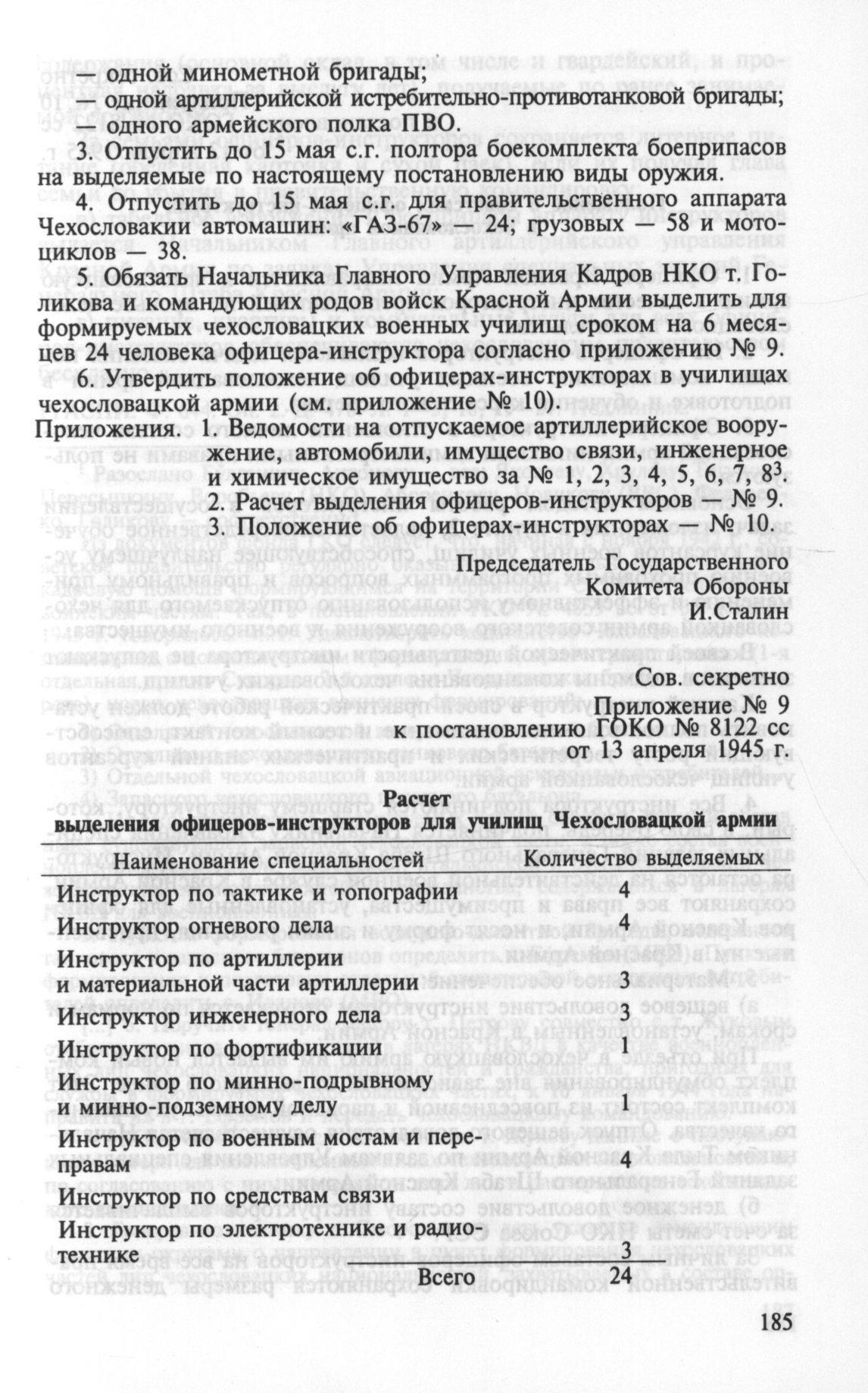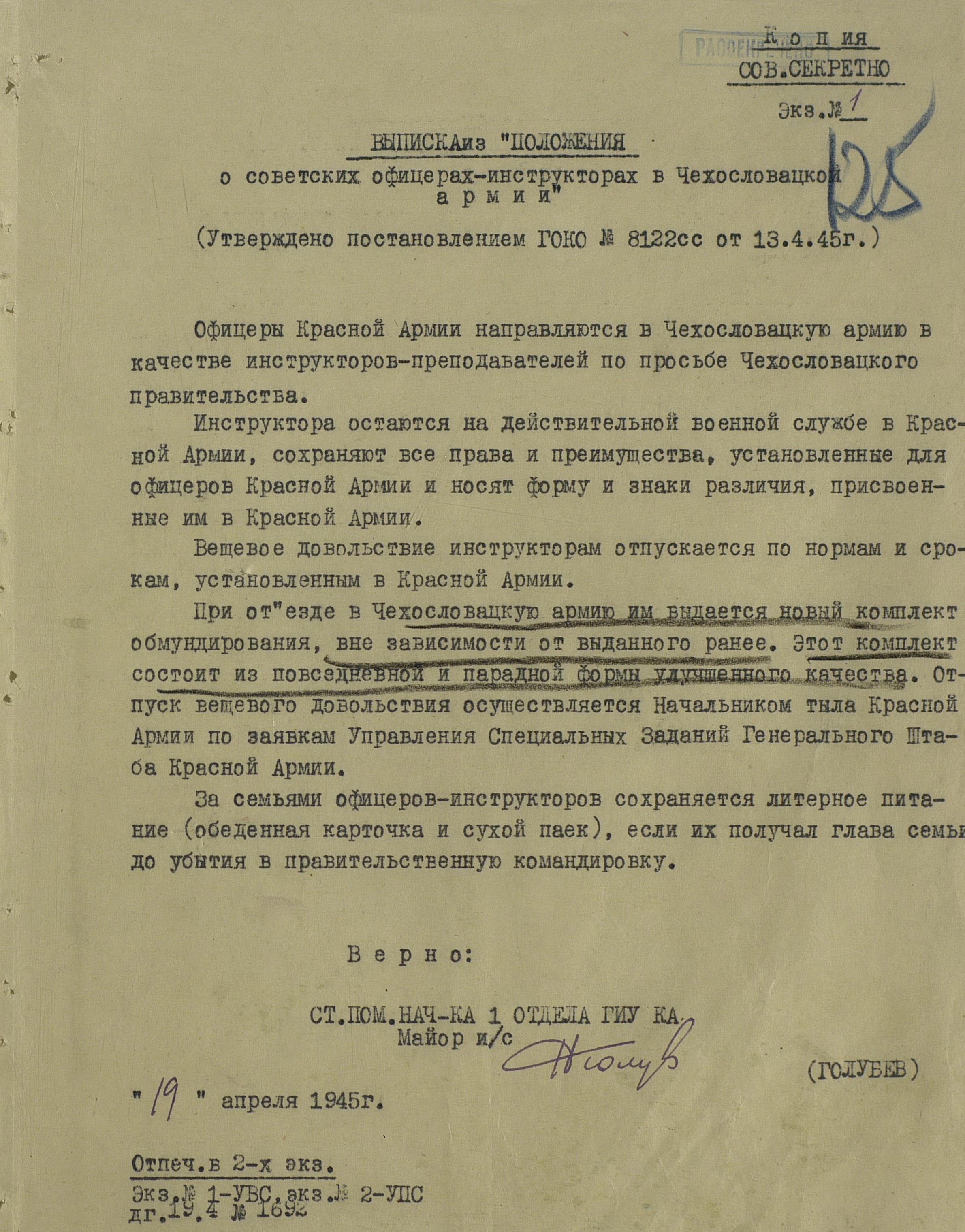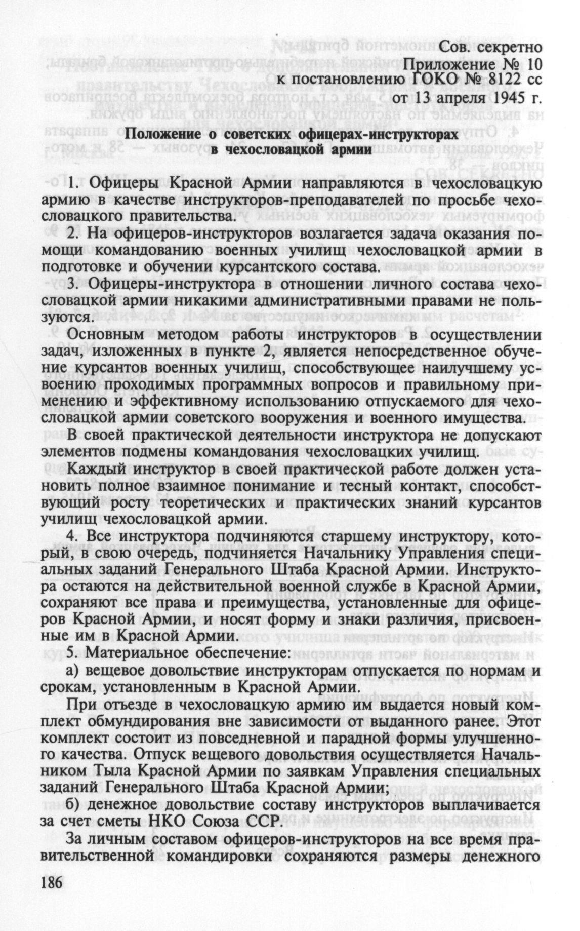 Пока же предлагаю ознакомиться с выпиской из постановления ГОКО № 8122 сс от 13.04.1945 г. «Положение о советских офицерах-инструкторах в Чехословацкой армии» (само постановление под спойлером). Инструкторов было немного, всего 24 человека, и направлялись они в создаваемые для Чехословацкой армии военные училища сроком на полгода.