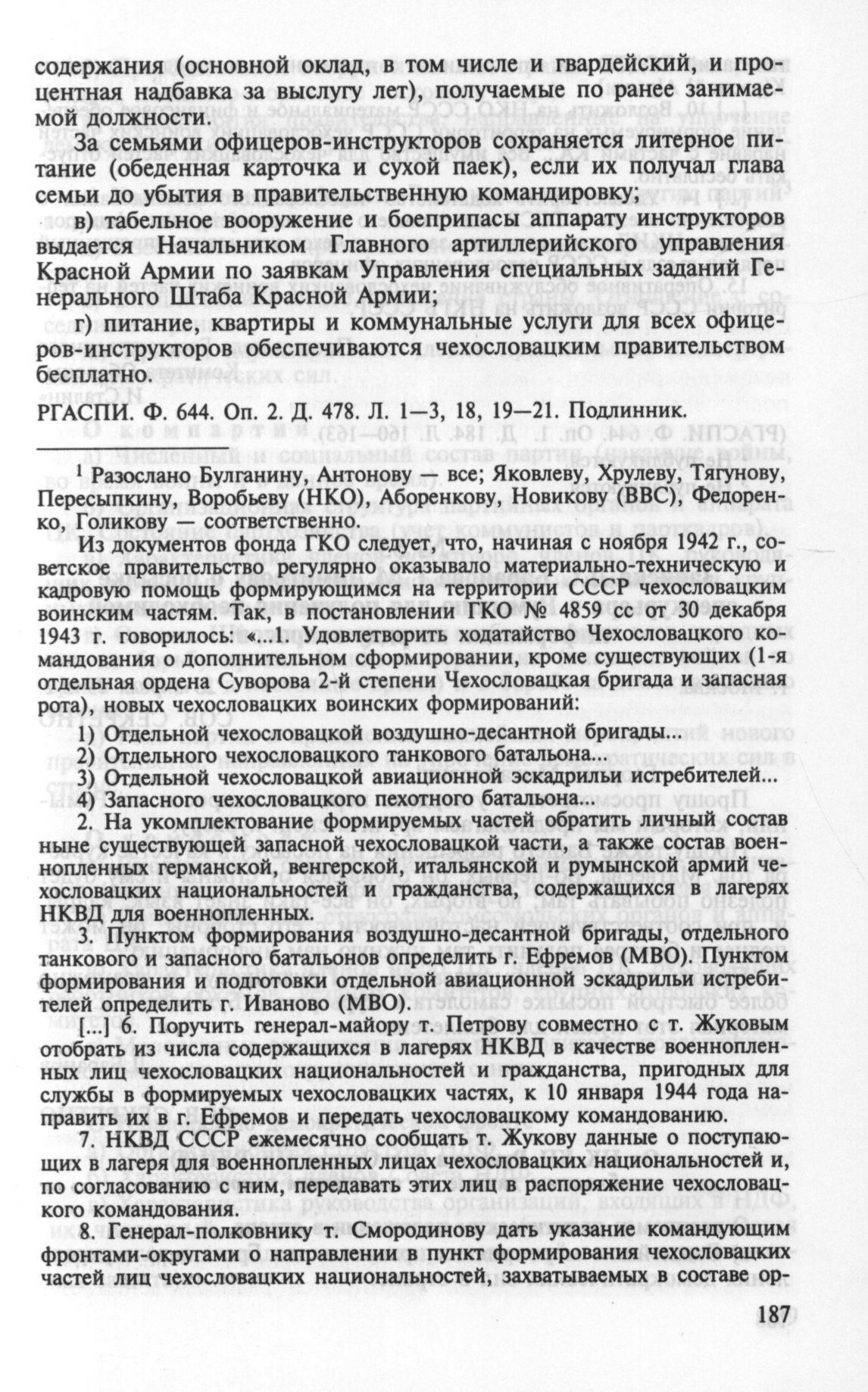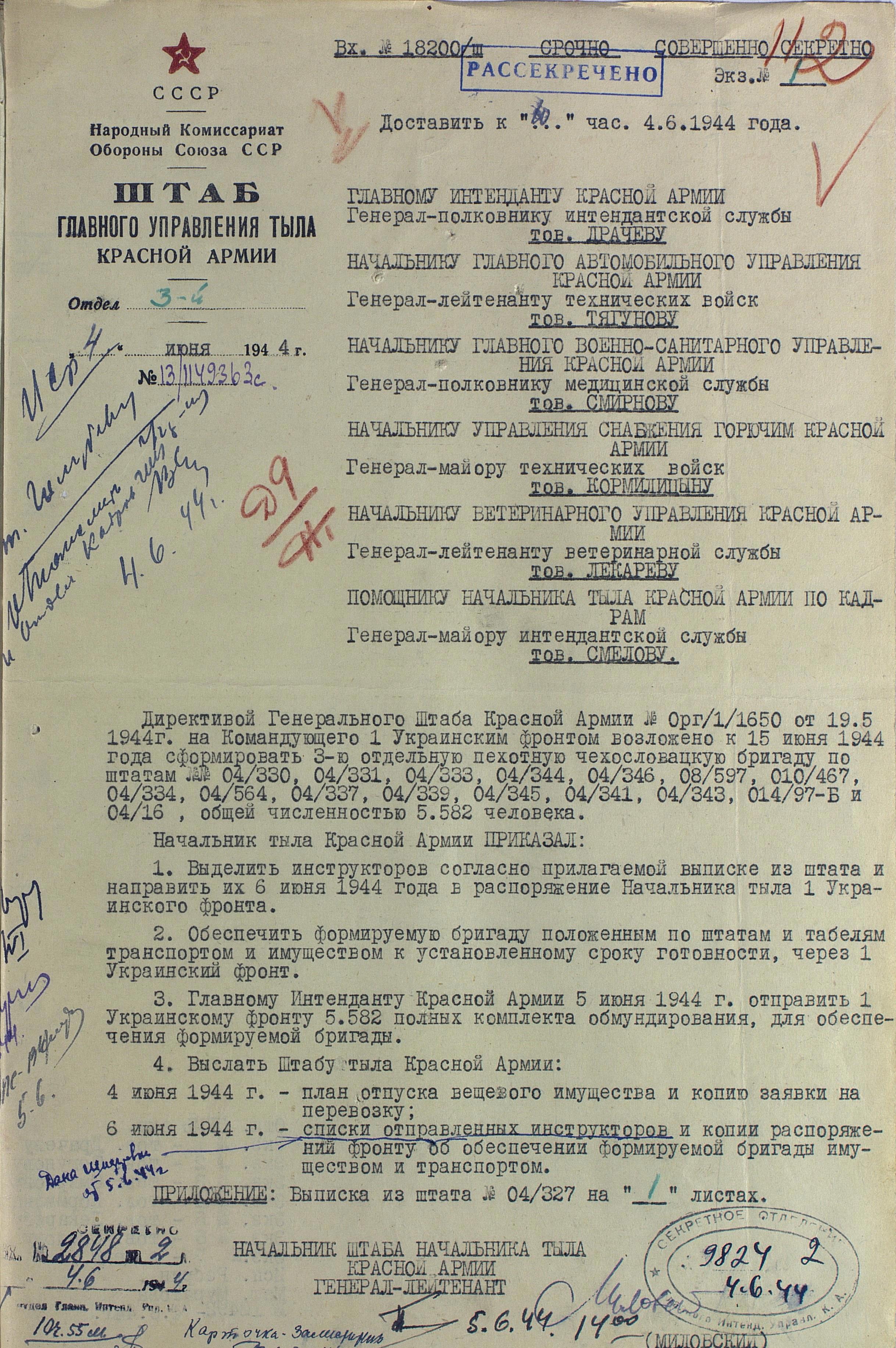 Буквально несколько слов о советских инструкторах, входивших в состав иностранных формирований. Именно про них говорится в пункте 1 распоряжения начальника Тыла Красной Армии от 4 июня 1944 г. о формировании 3-й чехословацкой бригады. Точного количества советских военнослужащих, воевавших в составе иностранных воинских частей я пока не нашёл, но постараюсь узнать.