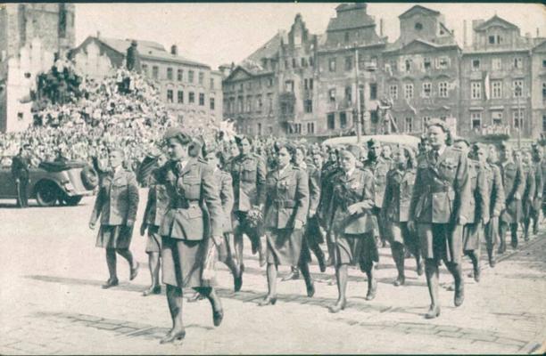 Женщины-добровольцы Чехословацкой Армии, воевавшие бок о бок с Советской Армией против оккупантов. Демонстрация 17 мая 1945 г. На Староместской площади в Праге.