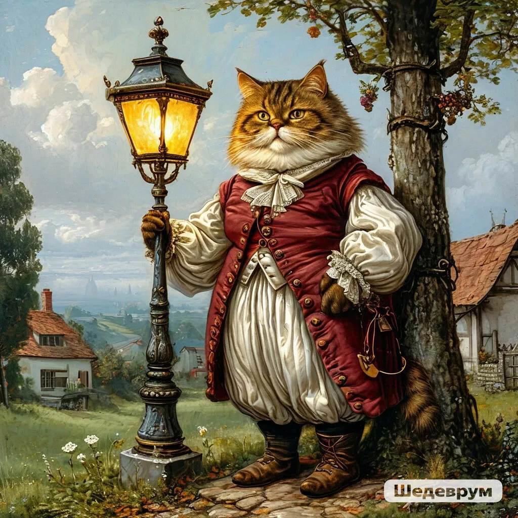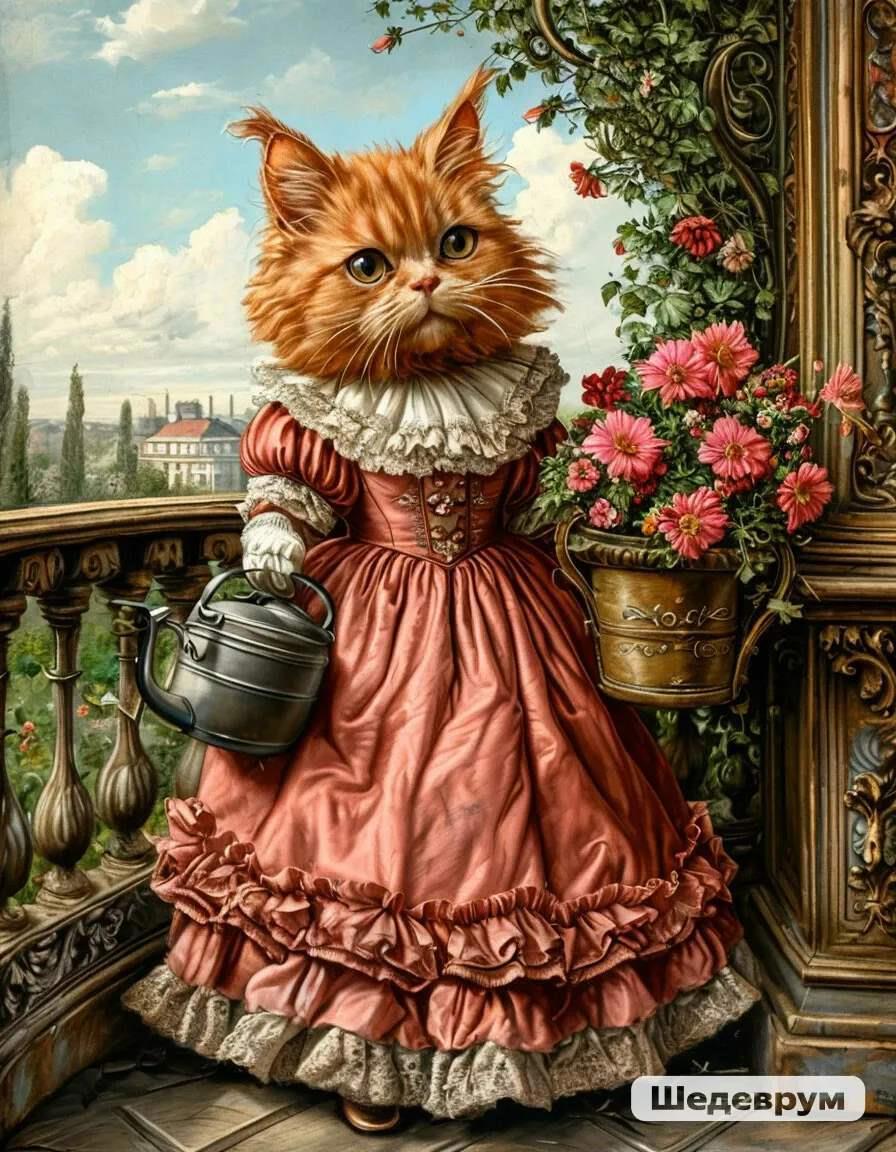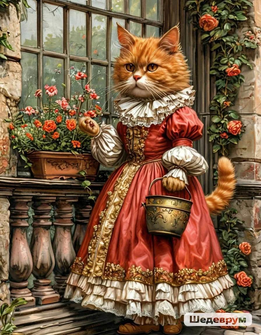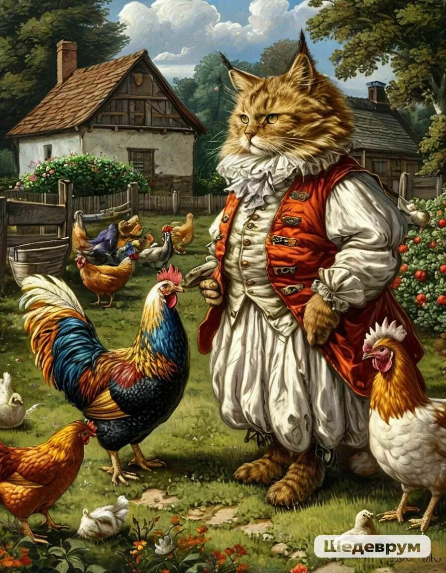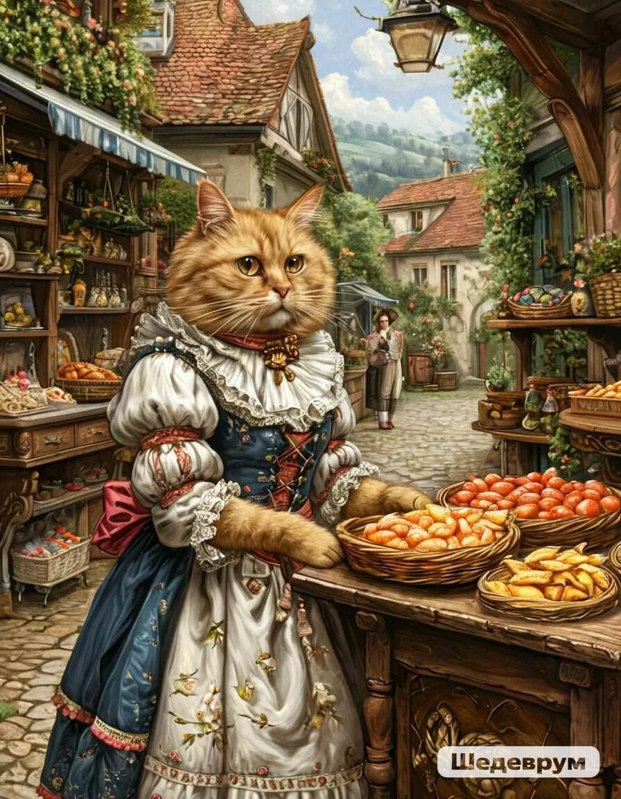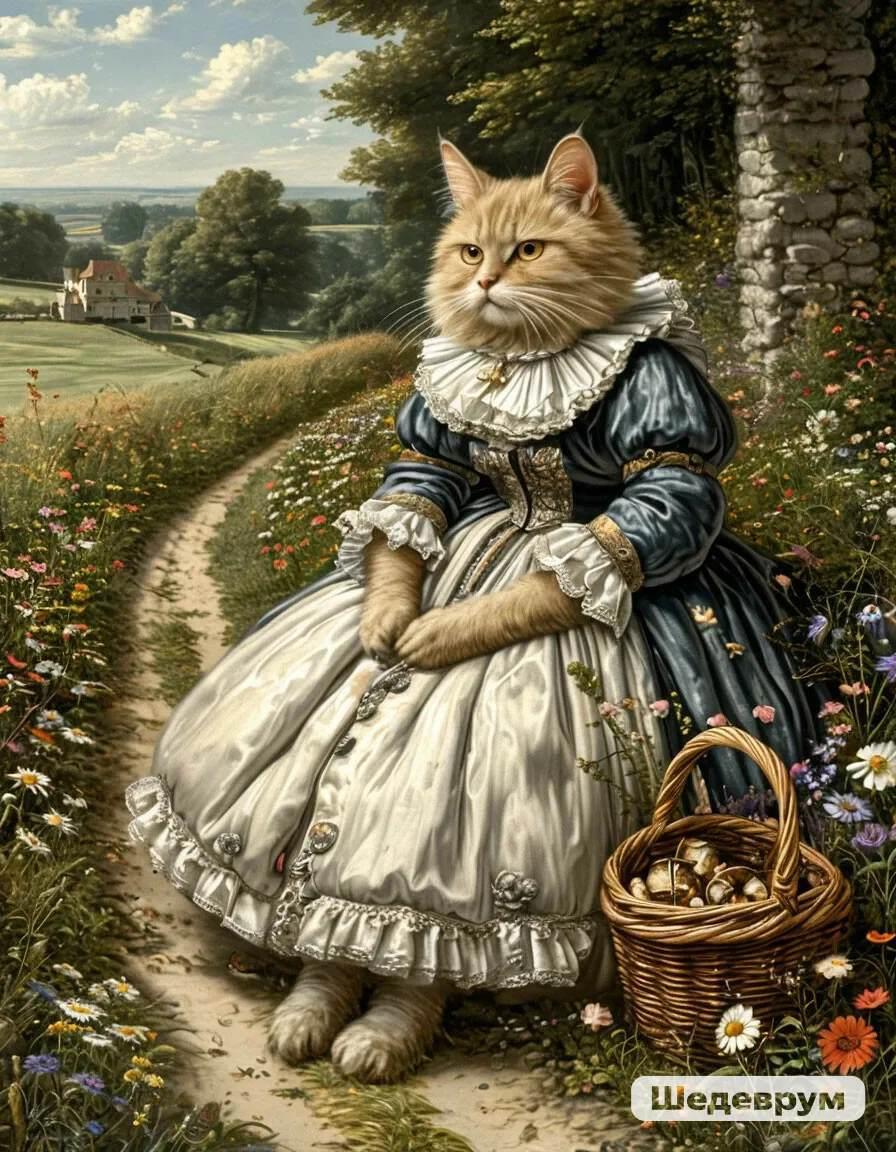 Кошка с корзиной грибов. По промпту там была рыба, но нейросетка так видит.)