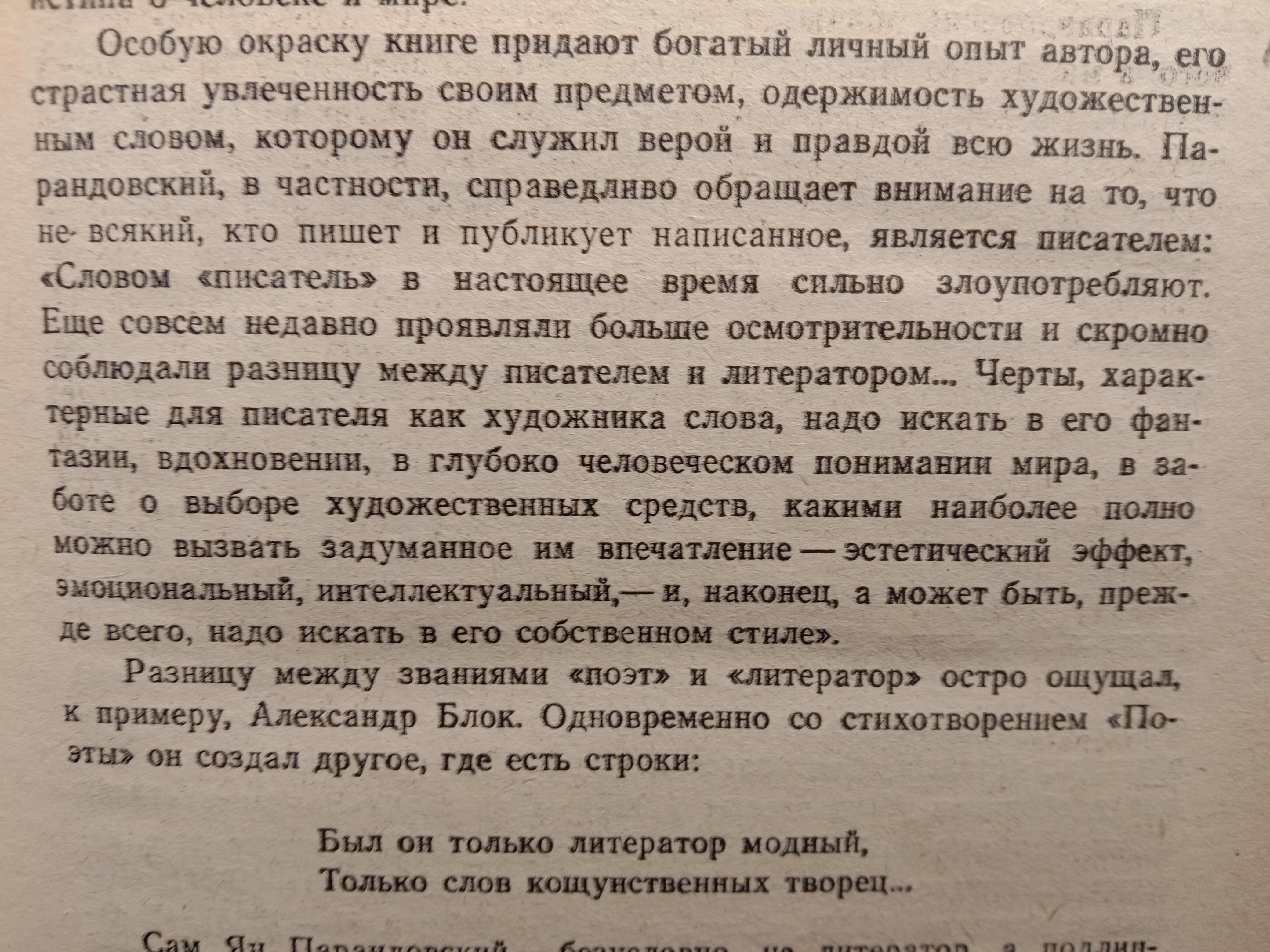 Название данного блога позаимствовал из названия книги Яна Парандовского, да простит он меня за такую дерзость. Но, скажу, на радость автору, что его труд - «Алхимия слова», я обожаю, и считаю руководством к действиям. Начал знакомство с этой книгой я в электронном виде. Она мне досталась из источника, который был получен из оригинала 1972 года. А ту, на днях, я по счастливому случаю приобрел печатный вариант, но уже позднего периода, 1990, и там мне понравилось вступительное слово Святослава Бэлзы. Фрагмент, который мне понравился, хотя их там предостаточно, но, сегодня демонстрирую пока лишь этот, который вы можете увидеть на снимке, что я сделал из книги. Ведь сегодня много разговоров о писательском поприще, и не всегда объективно, и по существу. Но, слова, сказанные Парандовским в середине 20 века, в его книге, и Бэлза написал вступительное слово - звучат актуально и сегодня.